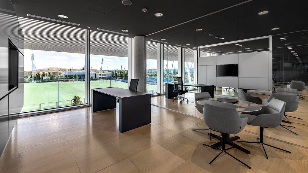 La propuesta del estudio de Rafael de La-Hoz, ejecutada por la constructora Ferrovial planteaba para este edificio el juego de dos grandes rectángulos adaptados a la topografía existente. El volumen superior se desplaza para asomarse al vial exterior, mientras el cuerpo inferior mira hacia los campos de entrenamiento de la ciudad deportiva. Todas las estancias disfrutan de luz natural y de una espacialidad fluida y transversal.