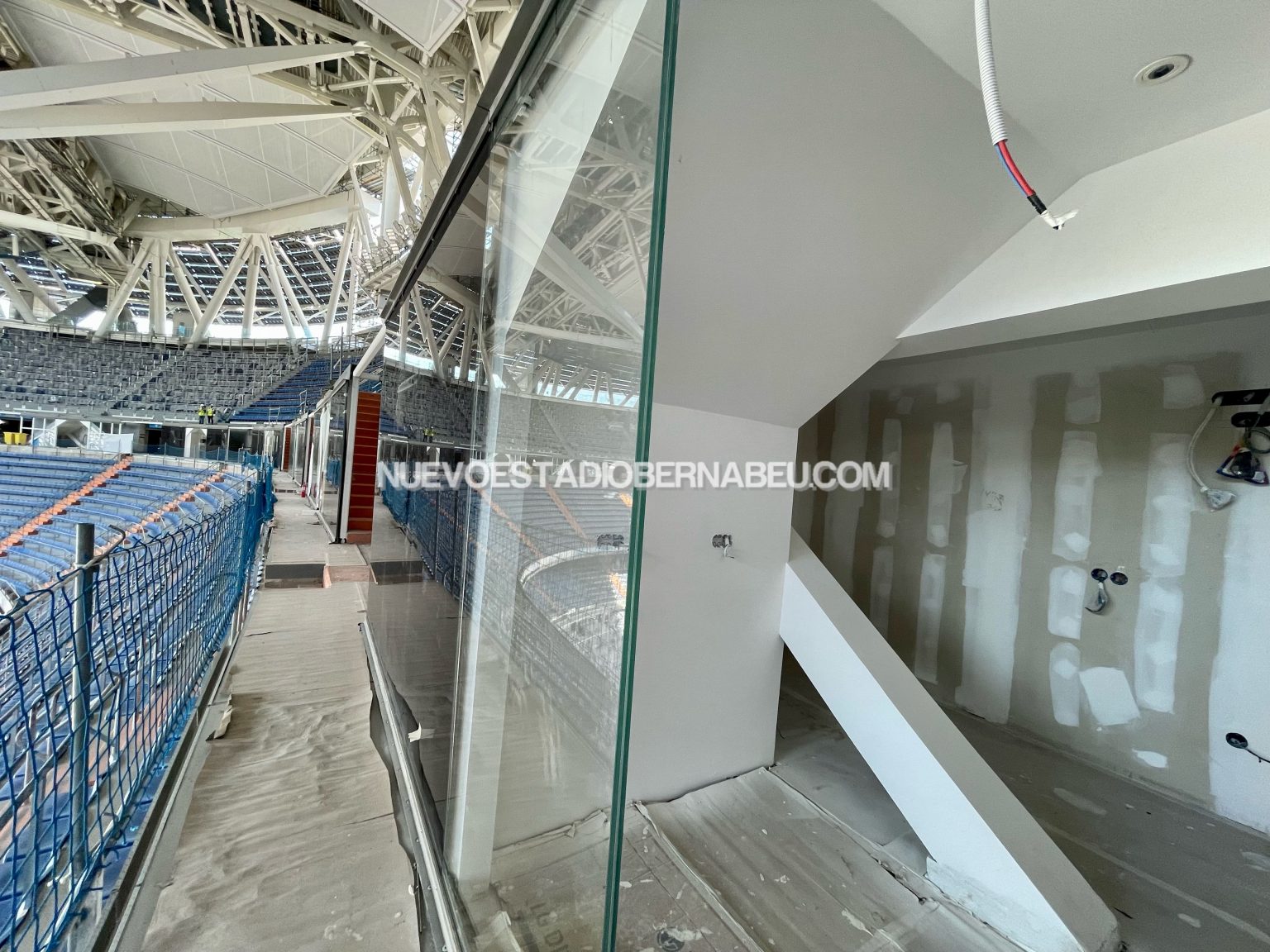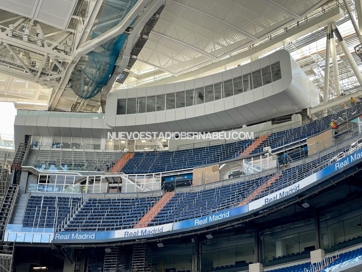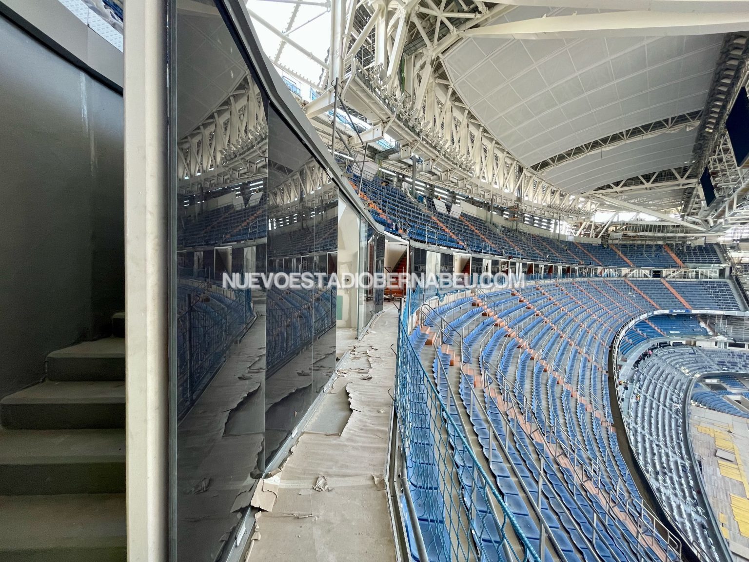 Además de los trabajos en el Tunnel Club, se trabaja en la habilitación de los palcos del nivel 7 que como podéis ver en las fotos están quedando bastante coquetos. Exteriormente se han panelado con vidrio dando mucha mejor sensación de continuidad que los antiguos palcos triangulares. Estos palcos 7.000 están muy avanzados y estarán disponibles en breve. Los que van un poco más atrasados, son los espectaculares palcos 3.000. En anillo de palcos del nivel 3 serán sin duda los mejores de todo el estadio, y a tenor de las infografías van a quedar muy chulos.