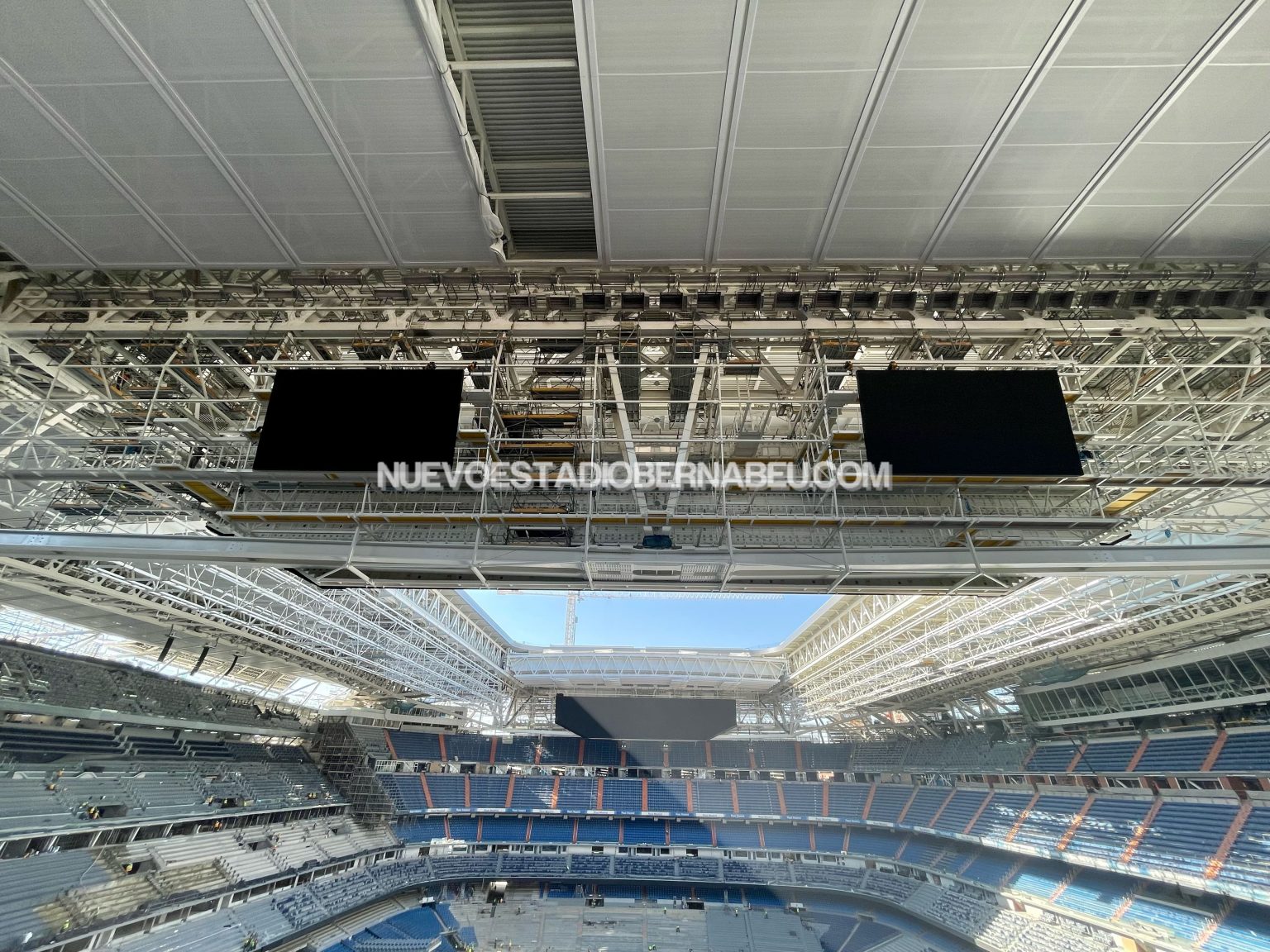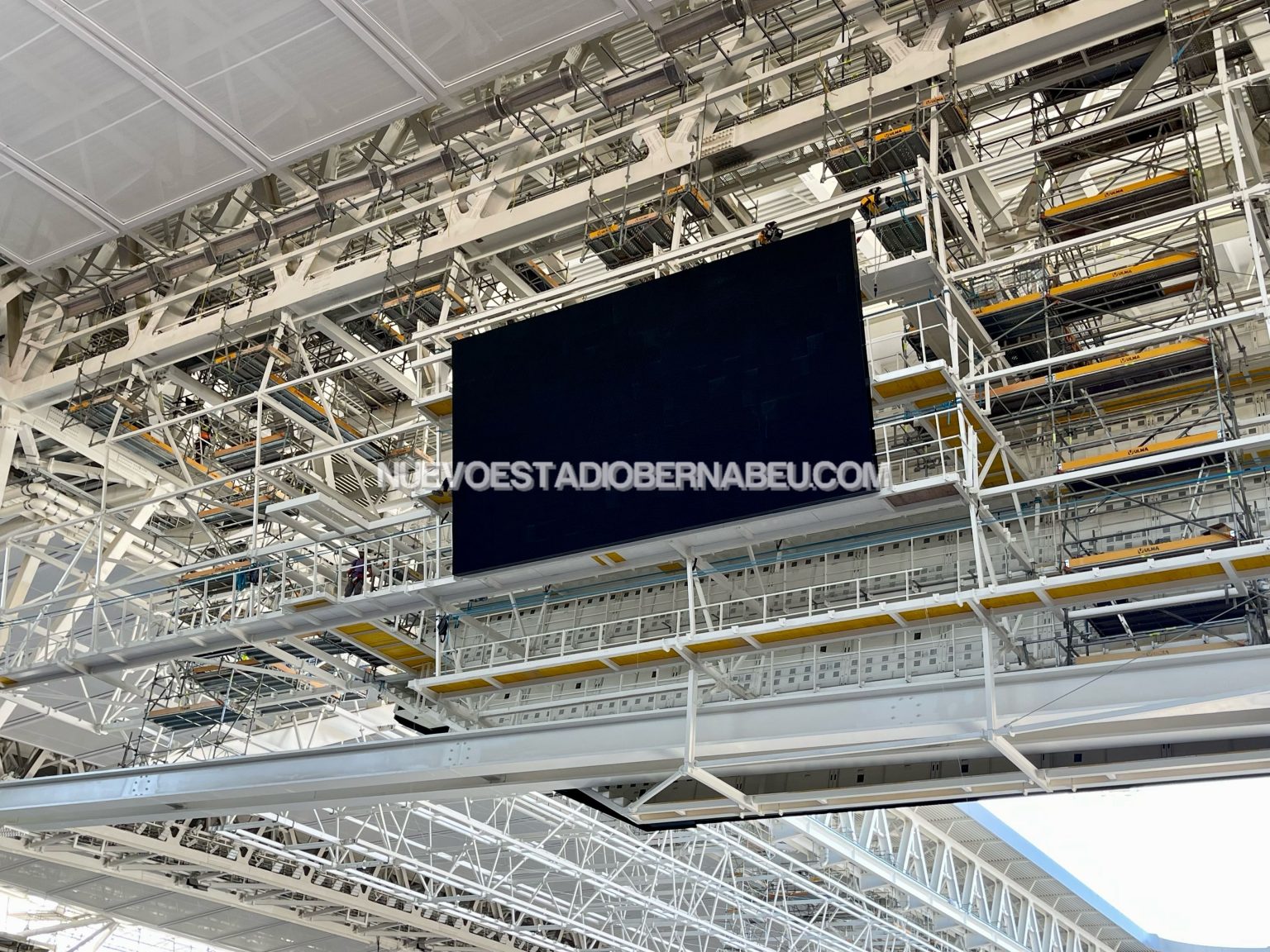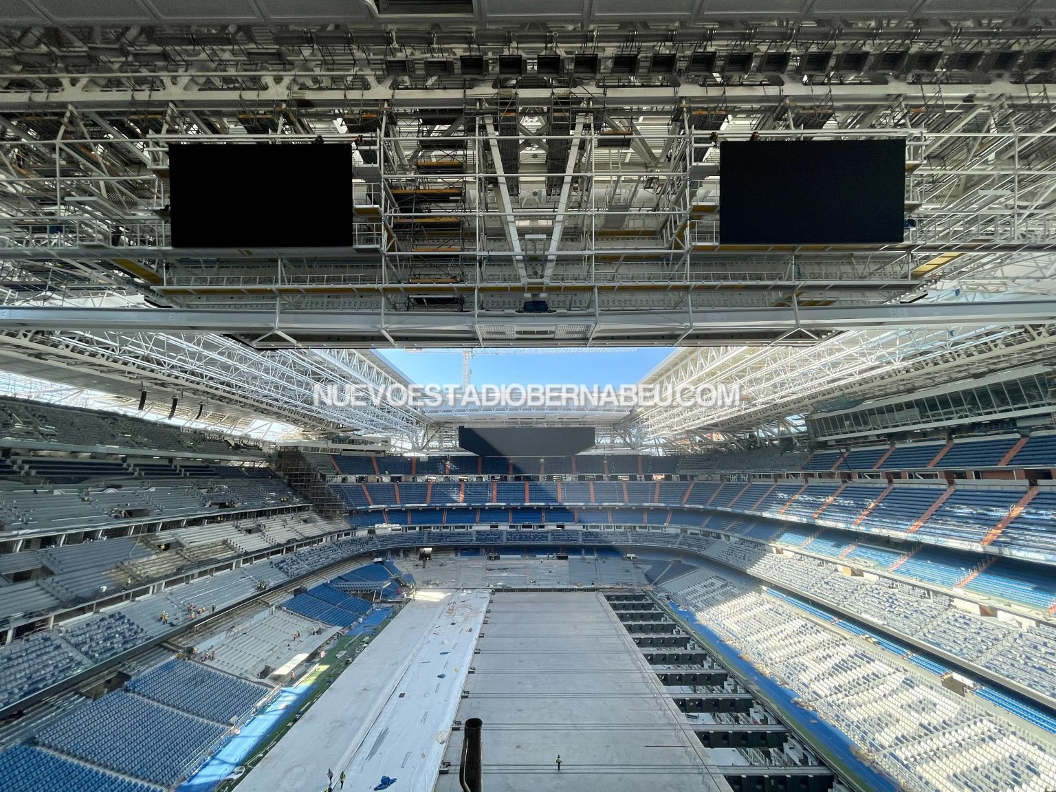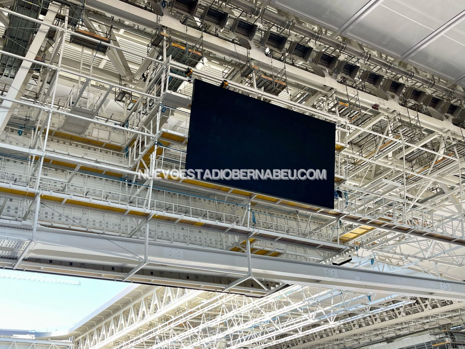 Uno de los aspectos más destacados del nuevo Bernabéu es el anillo LED del primer anfiteatro. La fascia que lo compone ya ha sido instalada y estará funcionando para el primer partido en casa. El impactante video marcador 360 está tomando forma, con la instalación de los tramos norte y sur, así como las pantallas de la cara interior en estos tramos. Las pantallas interiores son enormes, las fotografías no les hacen justicia. Los tramos de las esquinas y los laterales se intentarán instalar durante el parón de selecciones del mes de octubre una vez esté completamente instalada la estructura del videomarcador.