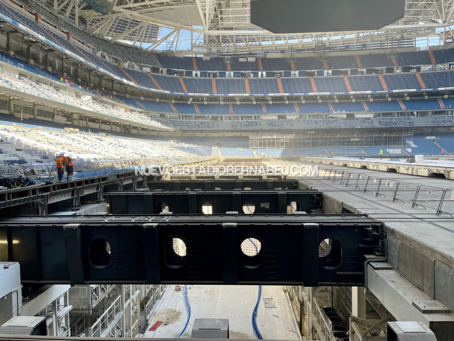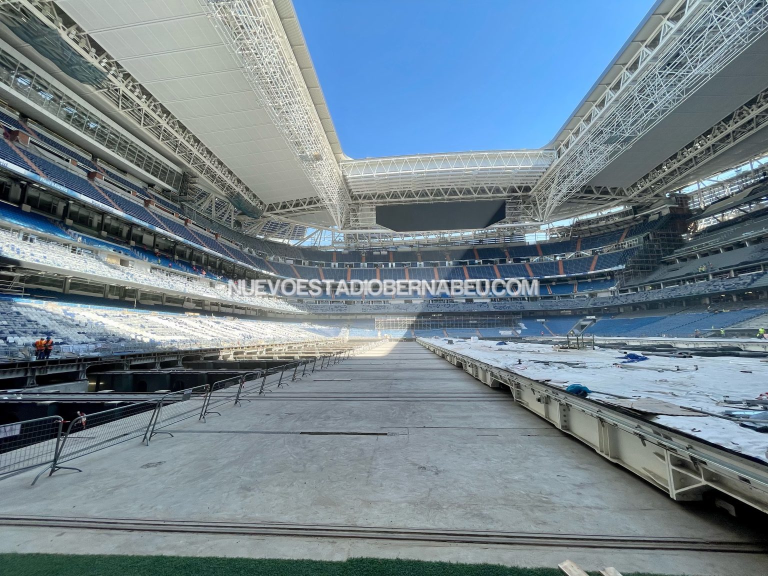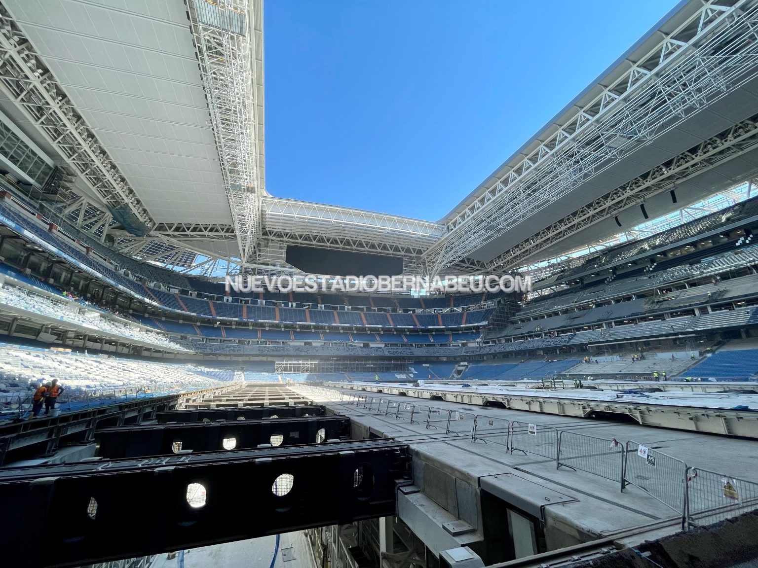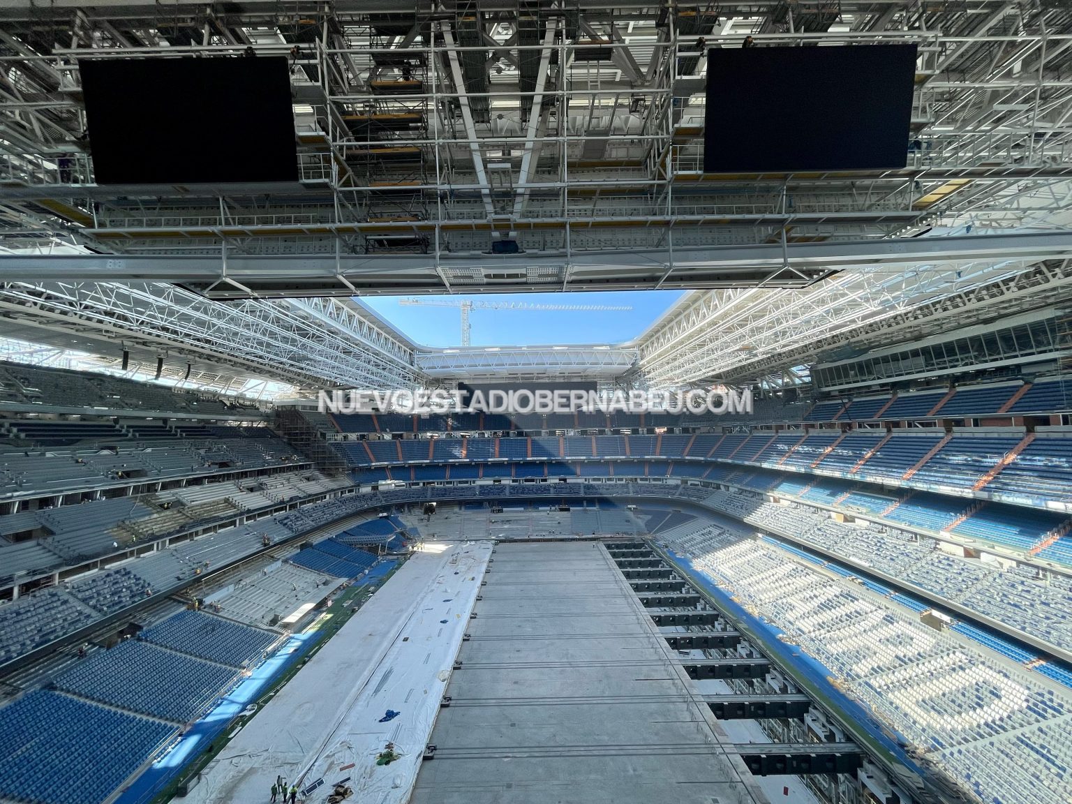 Uno de los aspectos más destacados del nuevo Bernabéu es el anillo LED del primer anfiteatro. La fascia que lo compone ya ha sido instalada y estará funcionando para el primer partido en casa. El impactante video marcador 360 está tomando forma, con la instalación de los tramos norte y sur, así como las pantallas de la cara interior en estos tramos. Las pantallas interiores son enormes, las fotografías no les hacen justicia. Los tramos de las esquinas y los laterales se intentarán instalar durante el parón de selecciones del mes de octubre una vez esté completamente instalada la estructura del videomarcador.