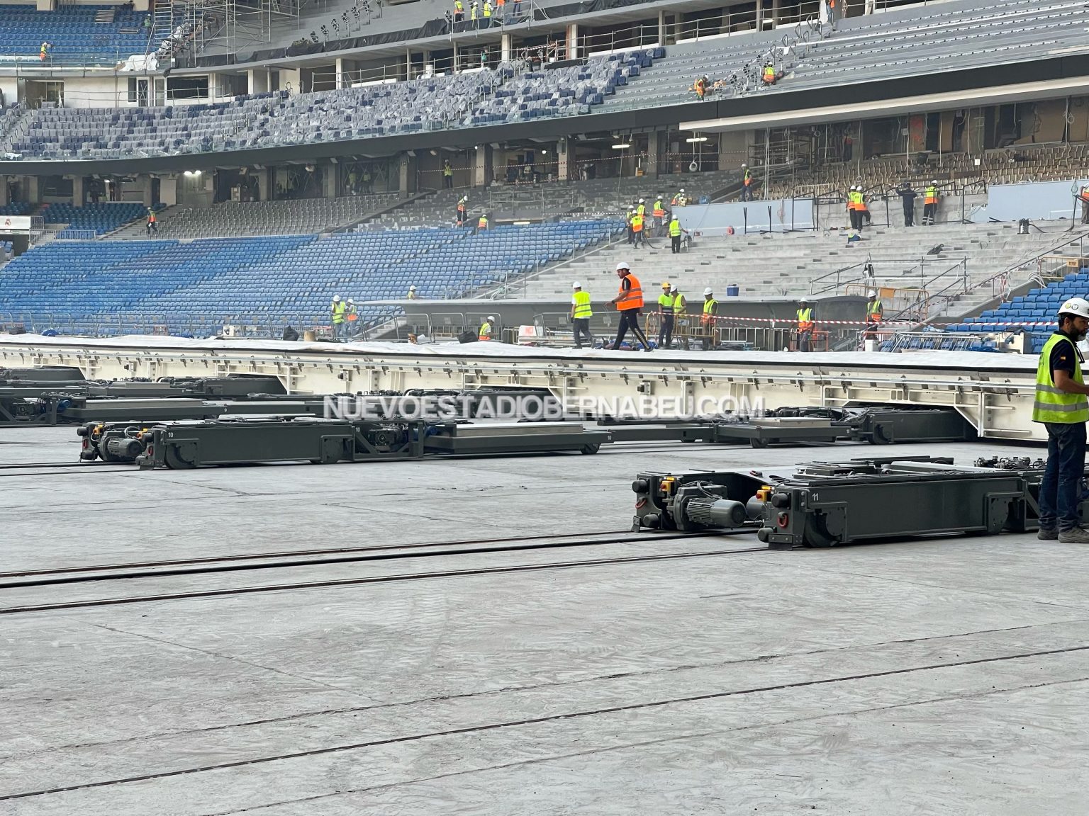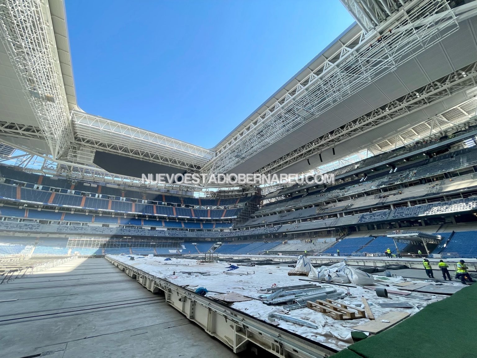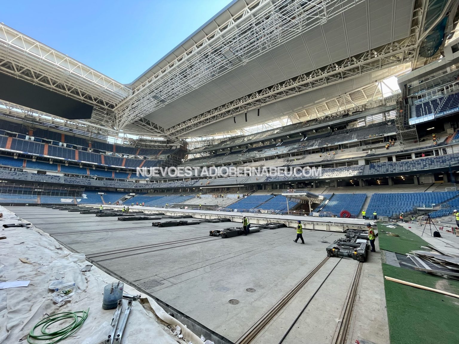 Como no puede ser de otra forma, a 10 días de la disputa del primer partido de la temporada en el Bernabéu, el epicentro del estadio, el terreno de juego, está a punto de ver la instalación del césped. Actualmente, se están llevando a cabo las pruebas previstas en el terreno de juego mecanizado con pruebas en las bandejas 1, 2 y 3. A partir de hoy se empezará a depositar material de siembra en el parking y el proceso está programado para comenzar el 25 de agosto.