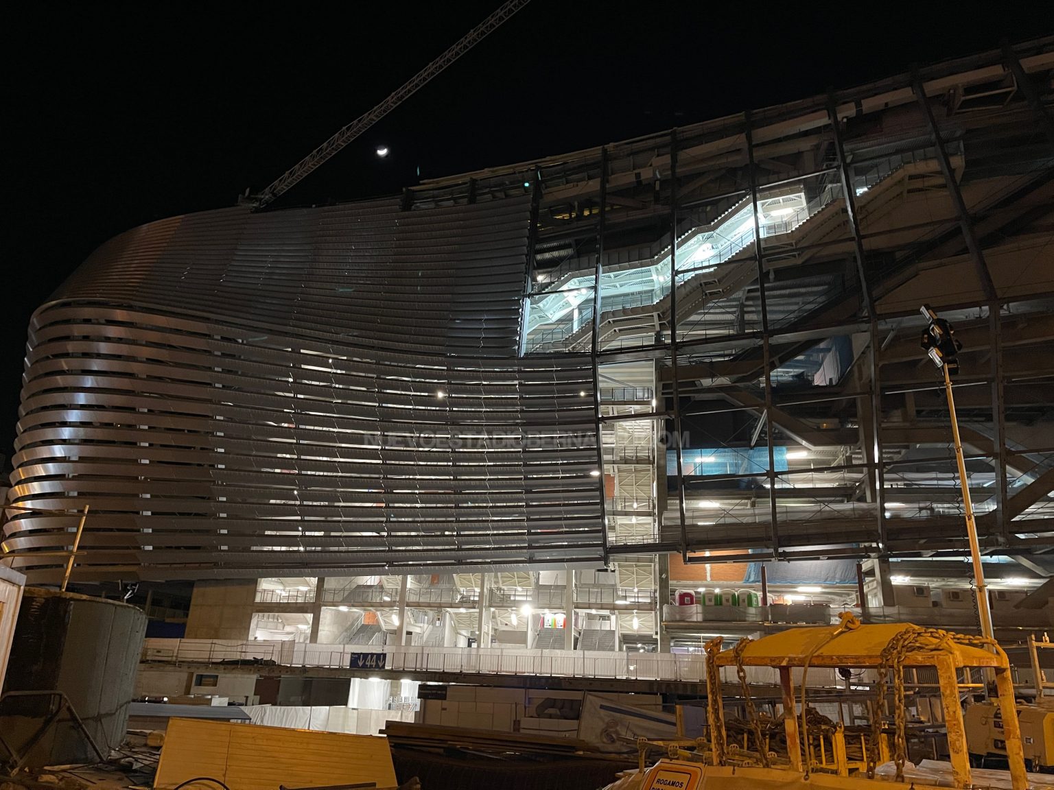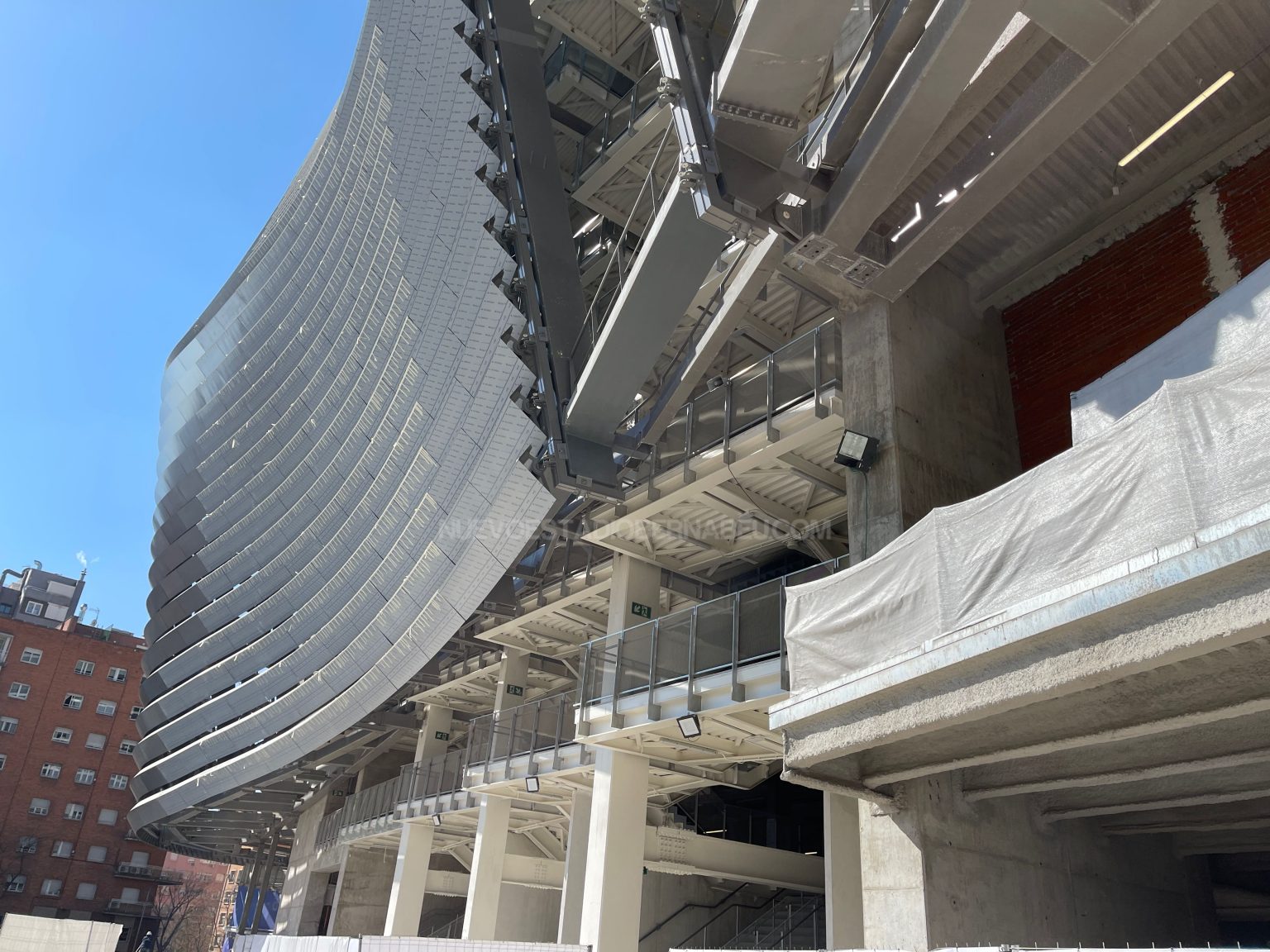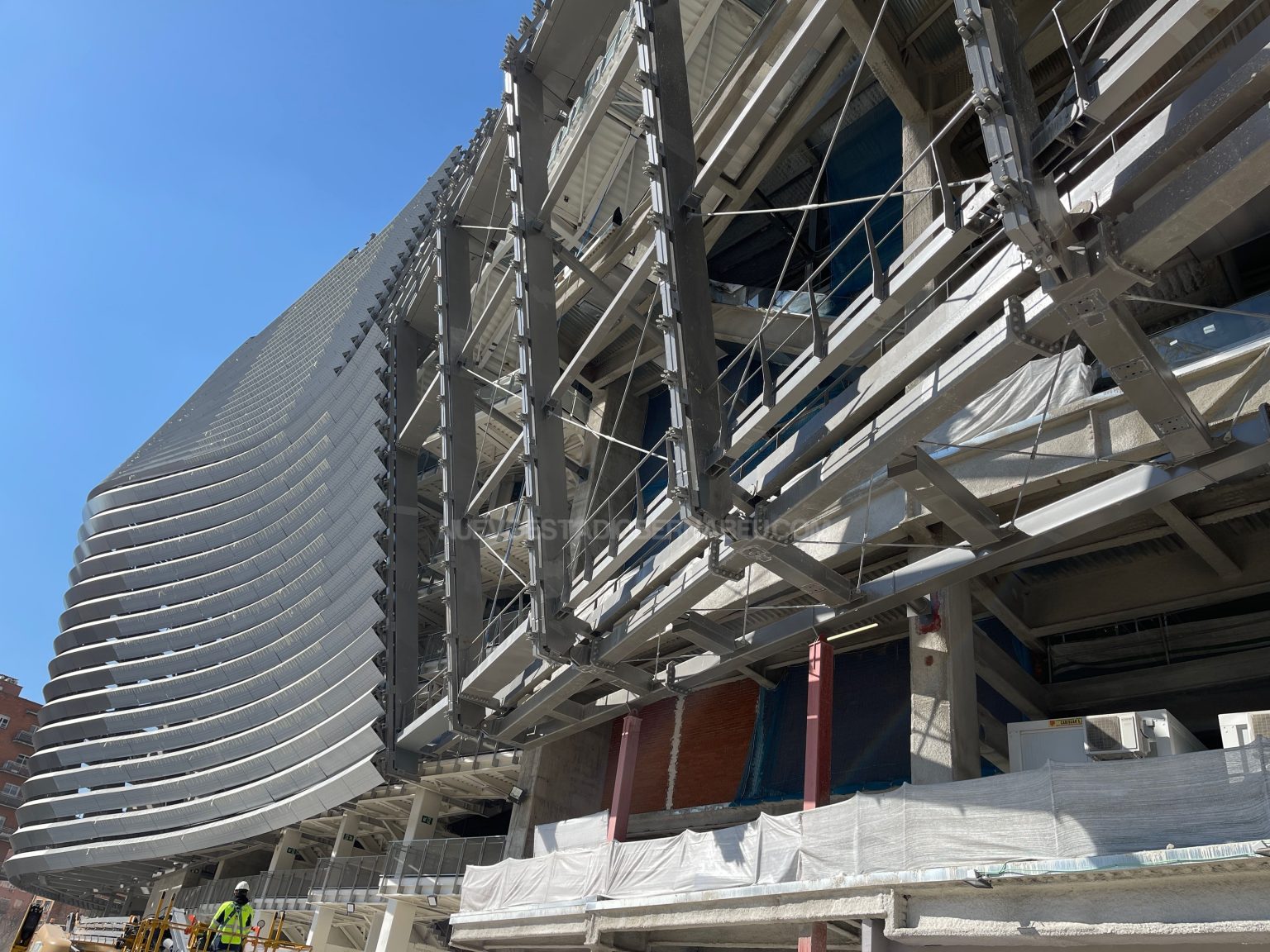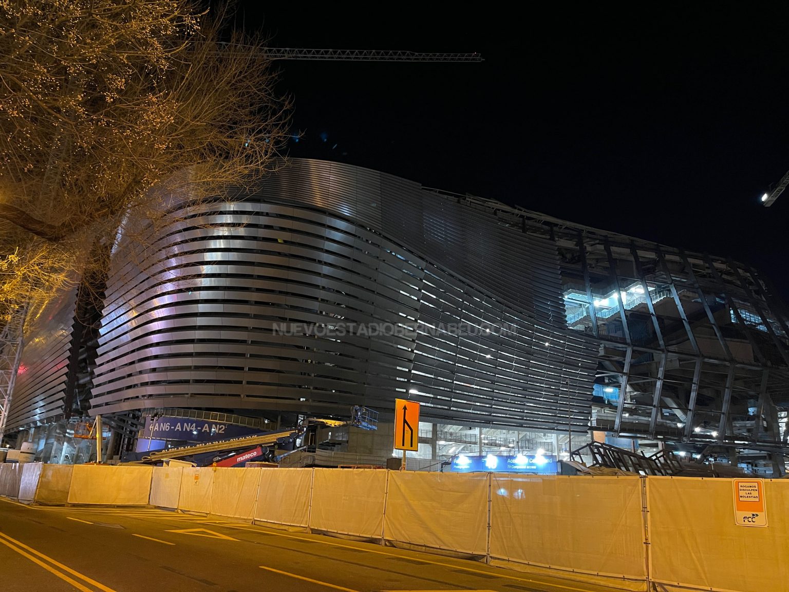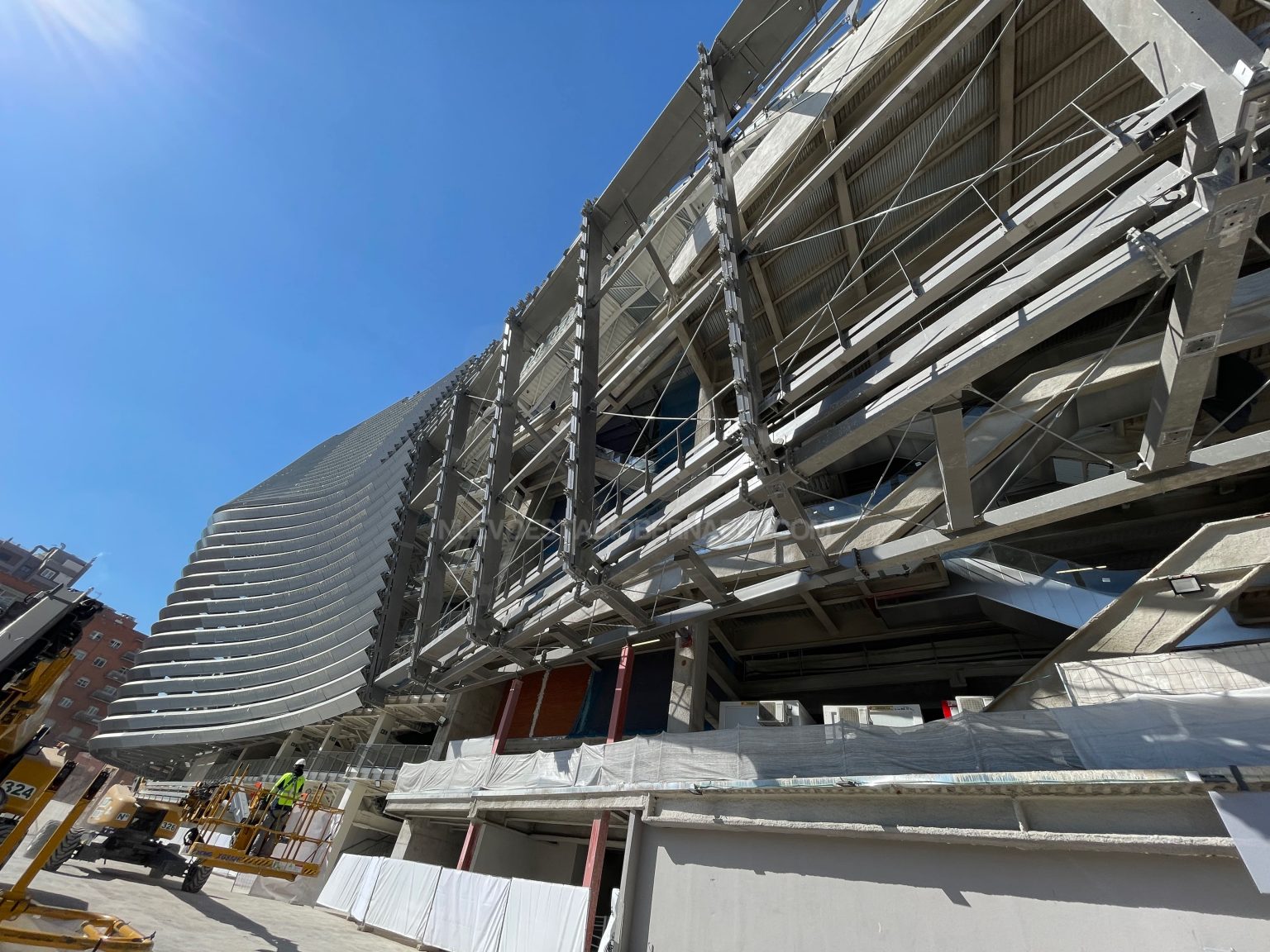 La nueva piel envolvente del estadio Santiago Bernabéu está tomando forma. En la actualidad se acometen trabajos de estructura de fachada en el lateral este y se instalan sin parar las lamas por todo el estadio tomando especial relevancia el avance que se ha producido sobre la futura plaza privada de uso público de Los Sagrados Corazones.