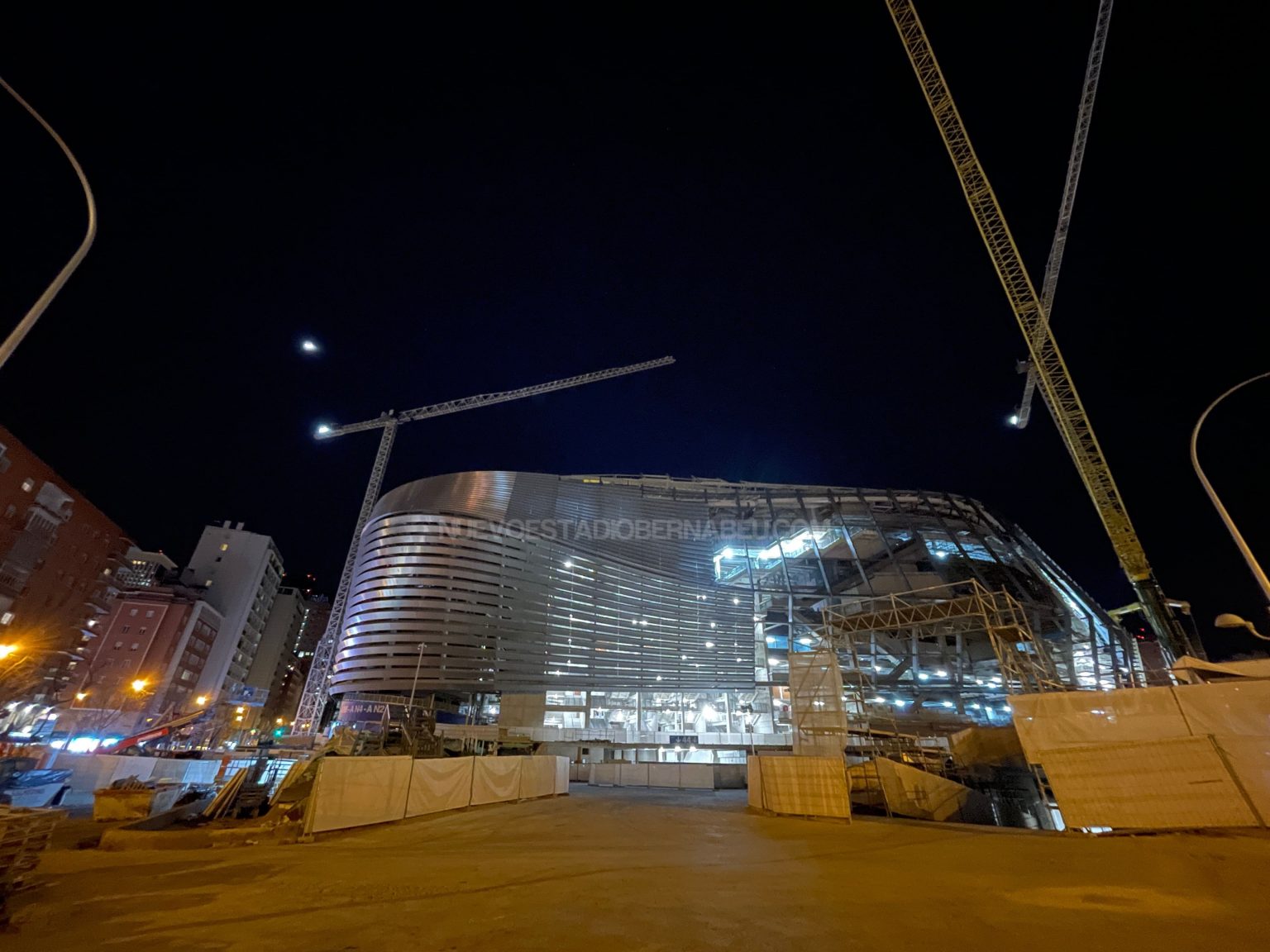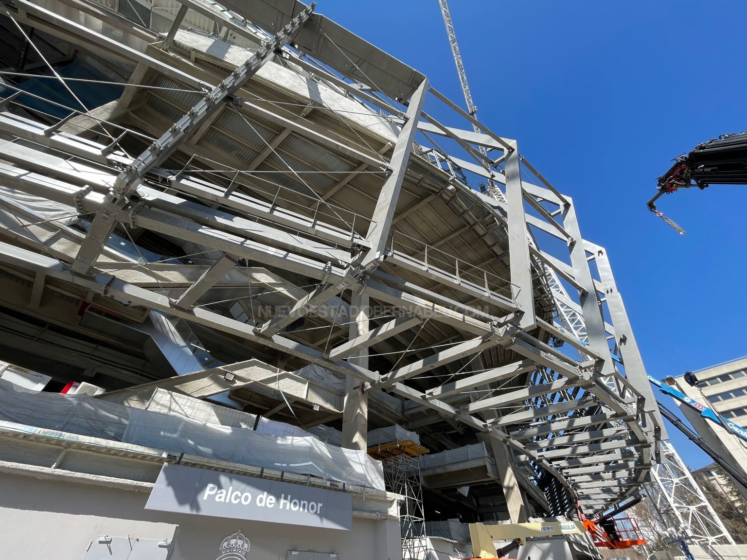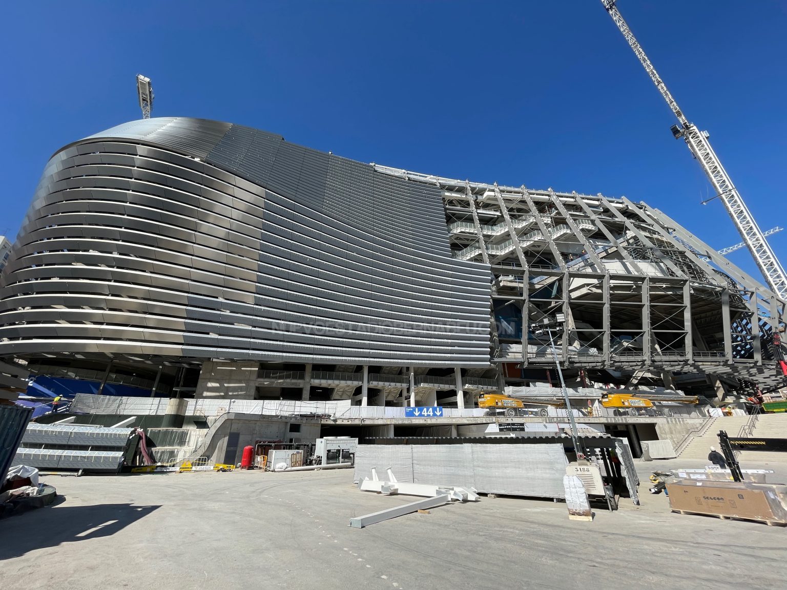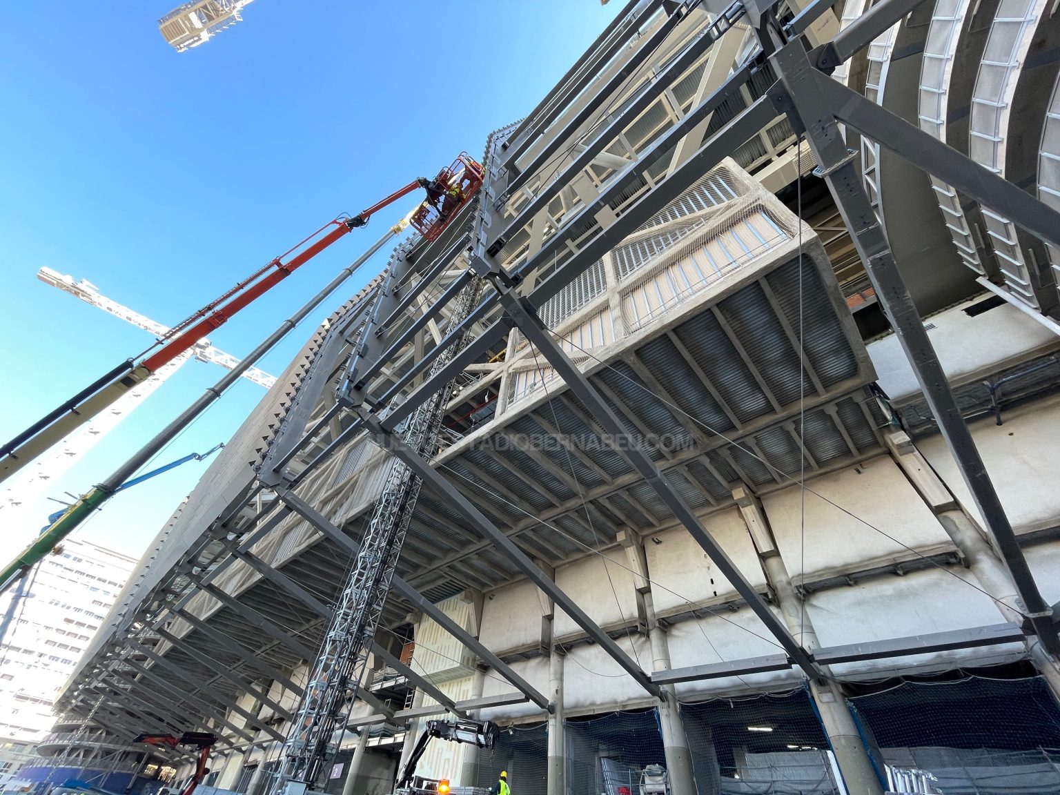La nueva piel envolvente del estadio Santiago Bernabéu está tomando forma. En la actualidad se acometen trabajos de estructura de fachada en el lateral este y se instalan sin parar las lamas por todo el estadio tomando especial relevancia el avance que se ha producido sobre la futura plaza privada de uso público de Los Sagrados Corazones.