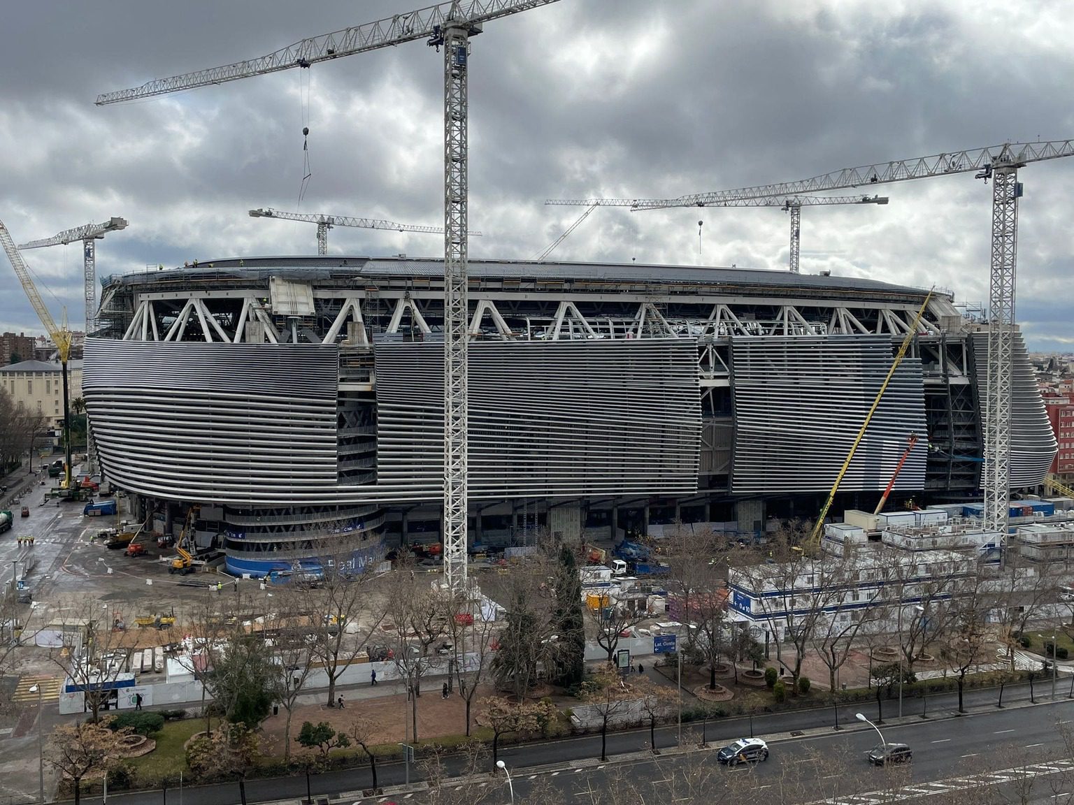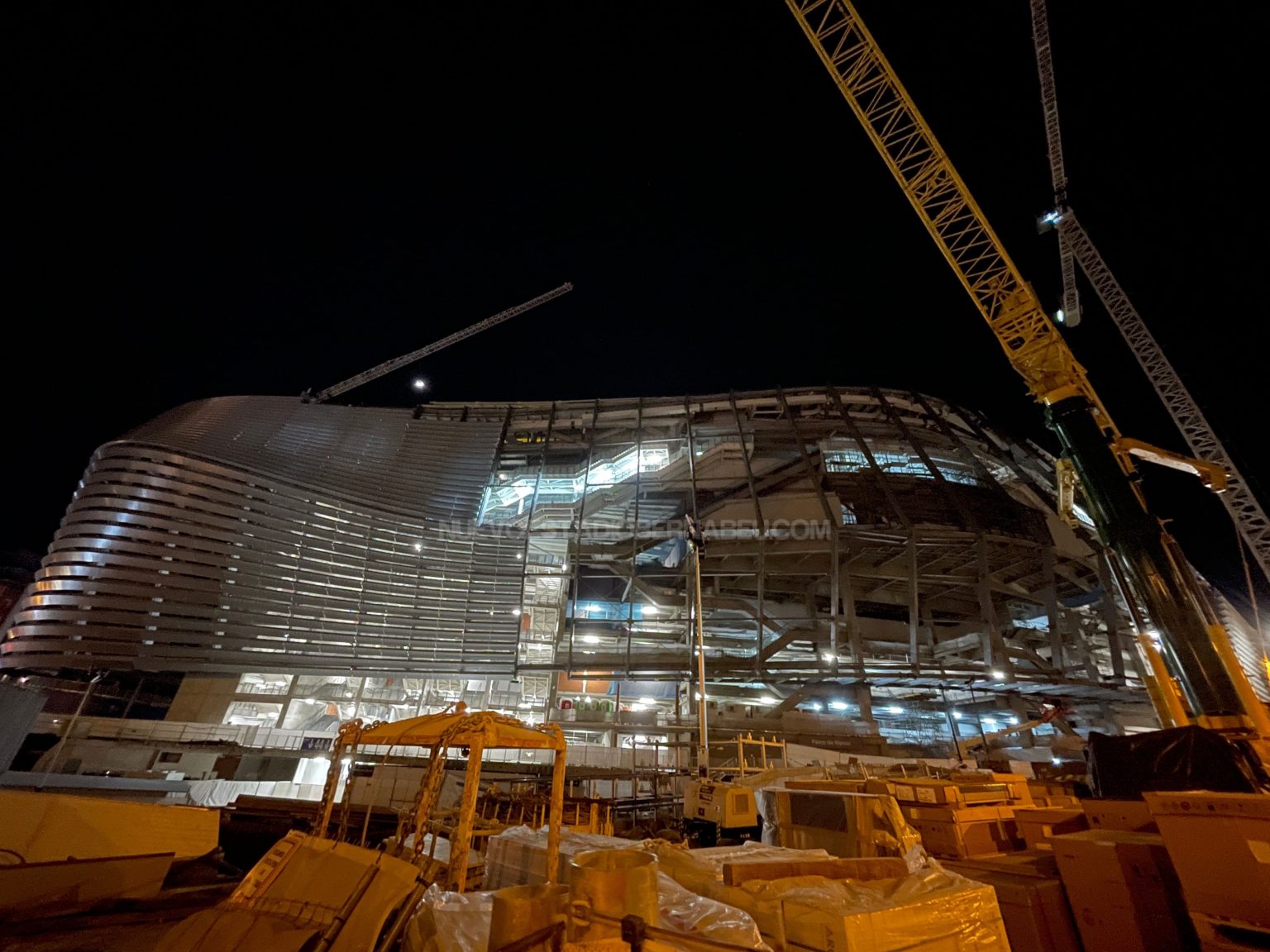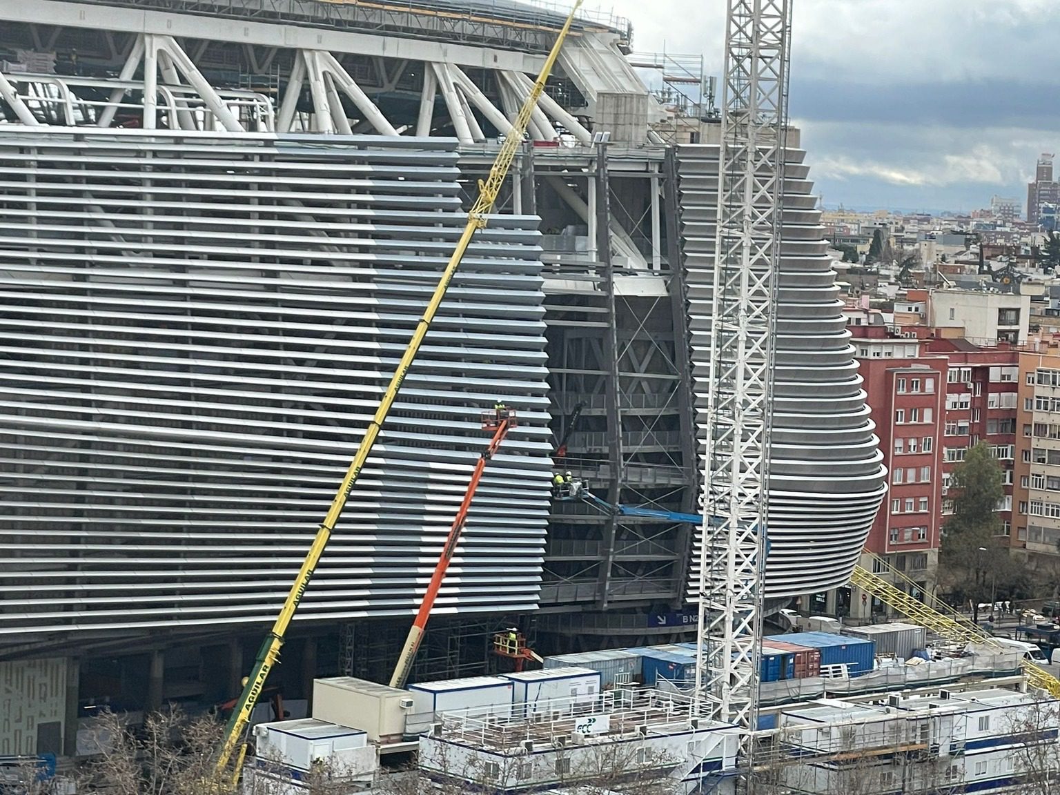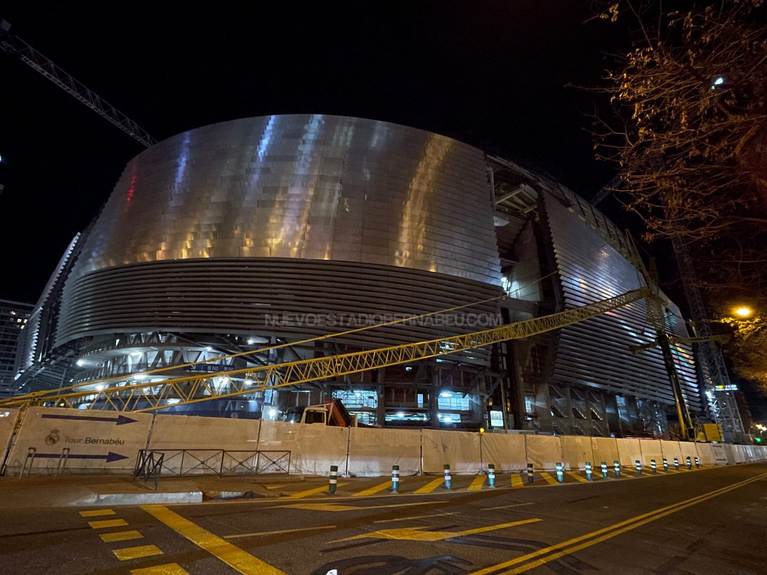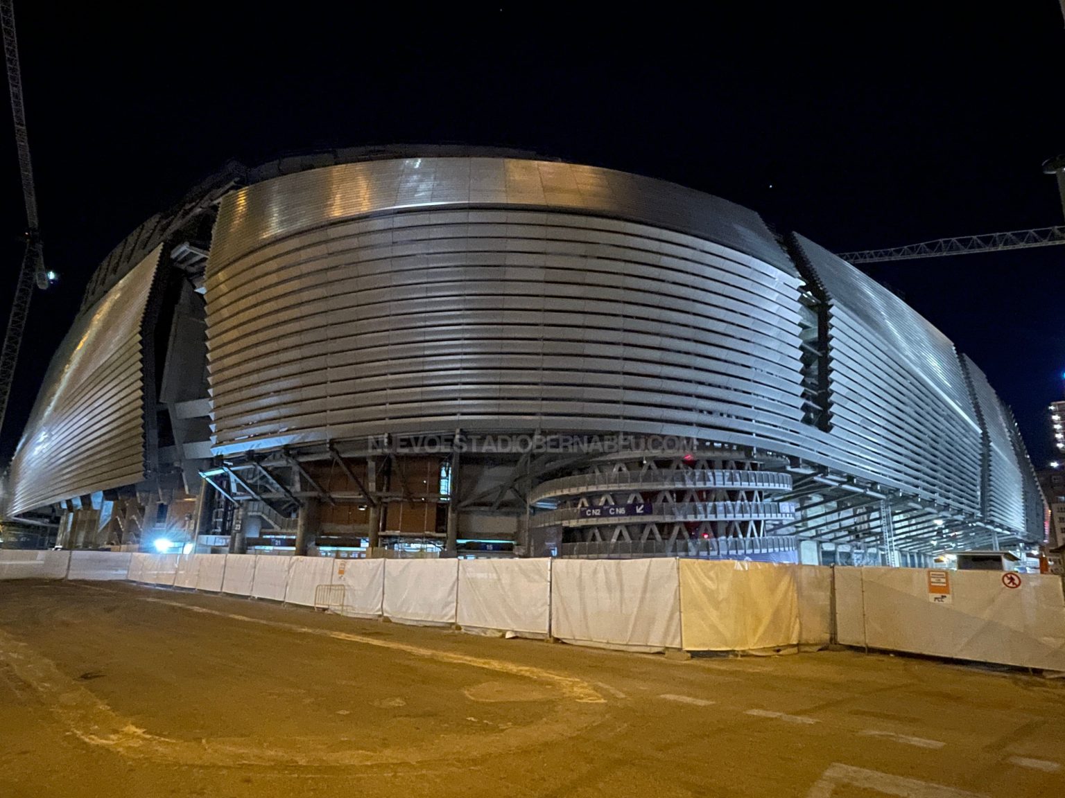 La nueva piel envolvente del estadio Santiago Bernabéu está tomando forma. En la actualidad se acometen trabajos de estructura de fachada en el lateral este y se instalan sin parar las lamas por todo el estadio tomando especial relevancia el avance que se ha producido sobre la futura plaza privada de uso público de Los Sagrados Corazones.