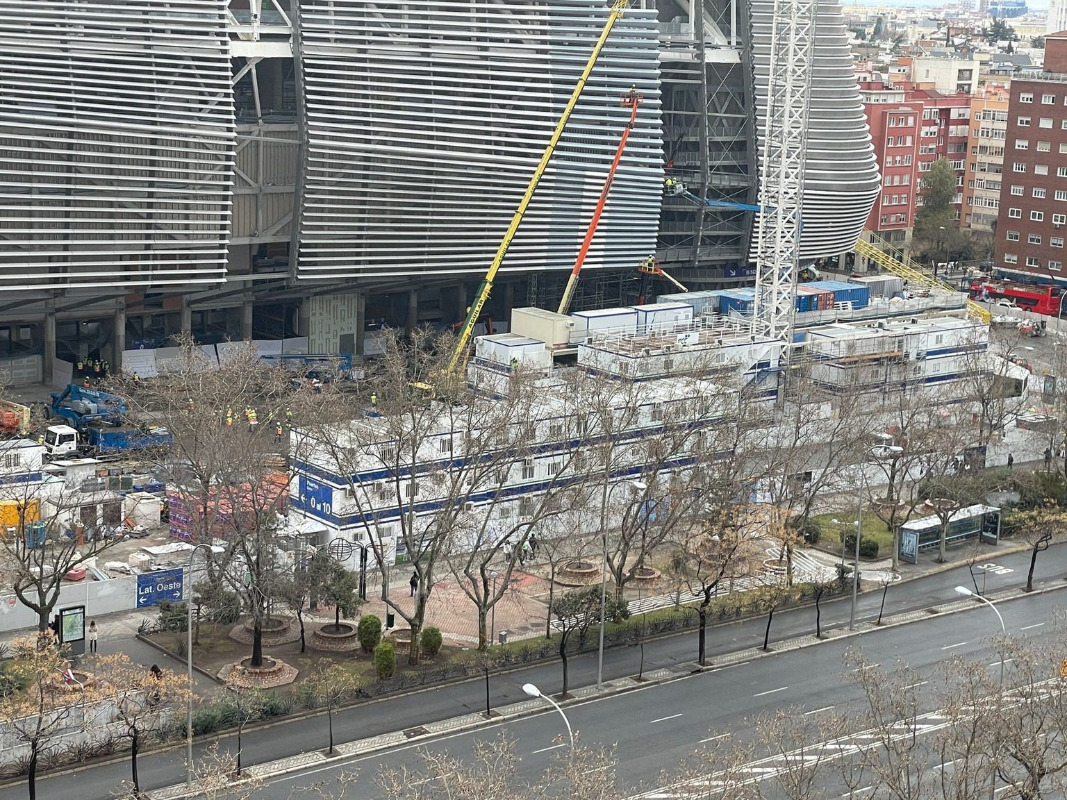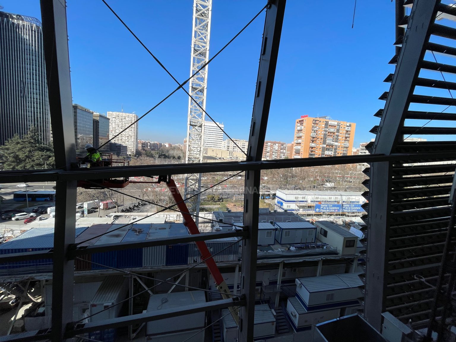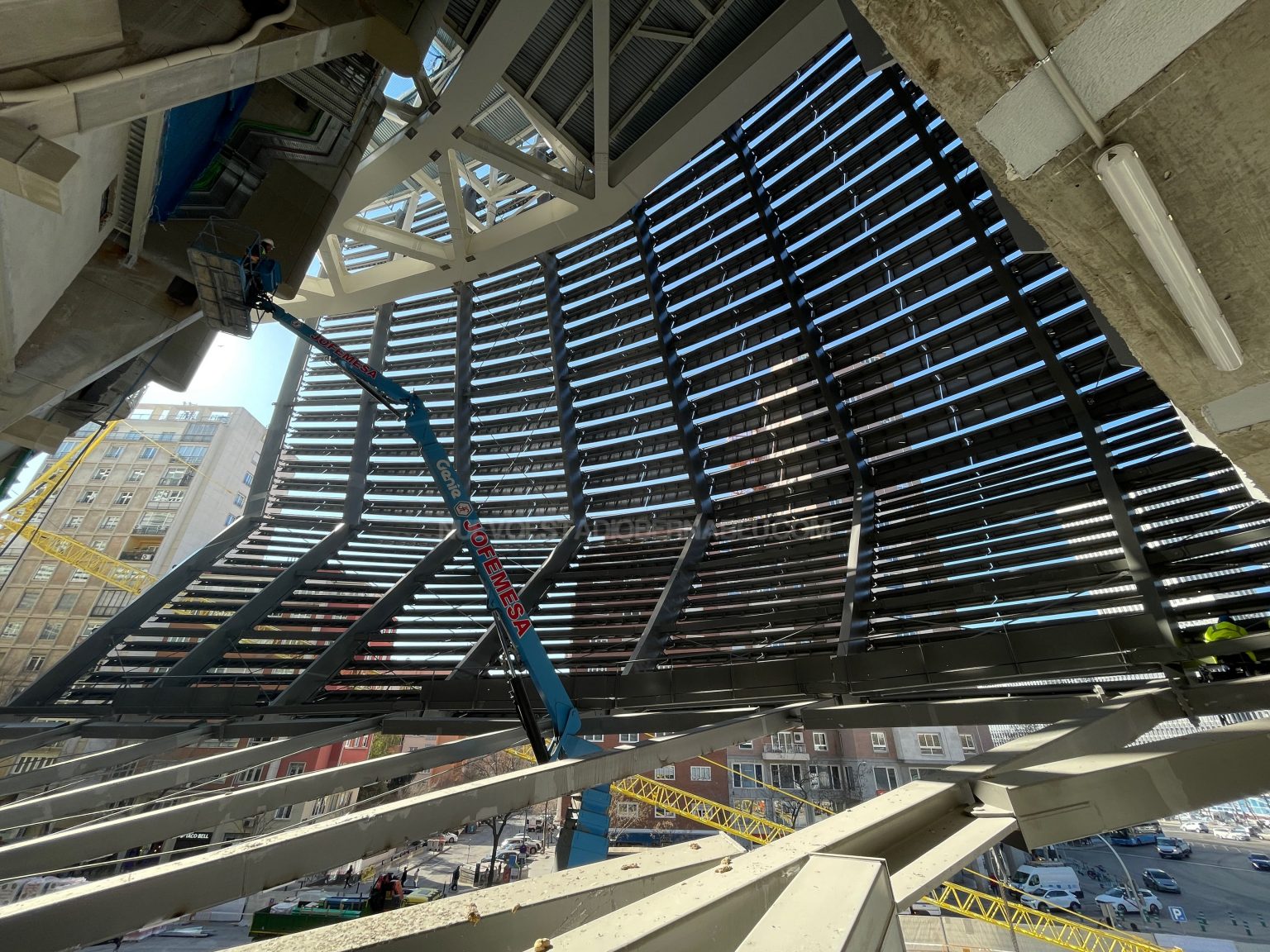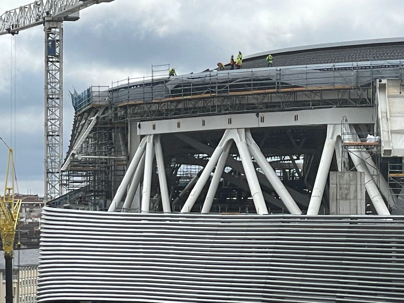 La nueva piel envolvente del estadio Santiago Bernabéu está tomando forma. En la actualidad se acometen trabajos de estructura de fachada en el lateral este y se instalan sin parar las lamas por todo el estadio tomando especial relevancia el avance que se ha producido sobre la futura plaza privada de uso público de Los Sagrados Corazones.