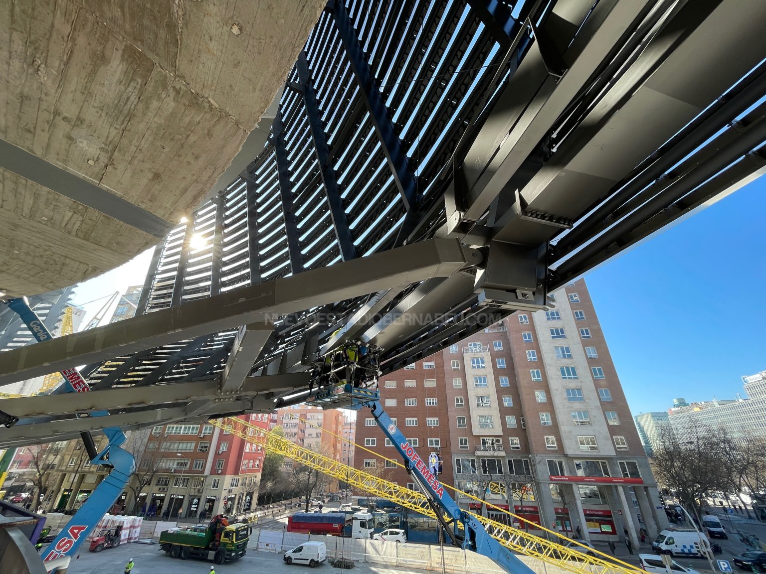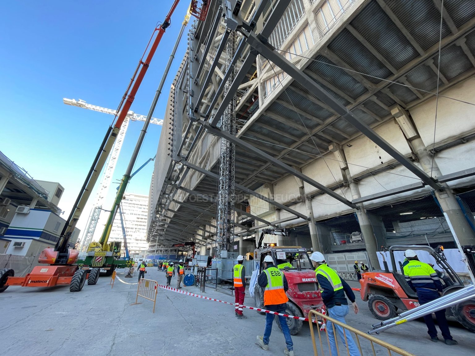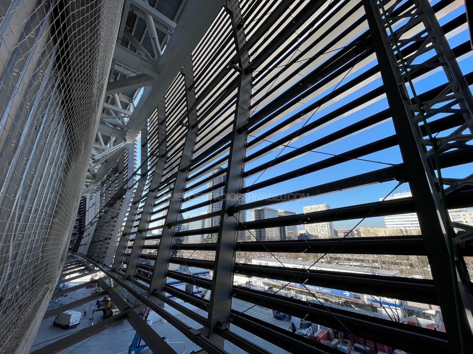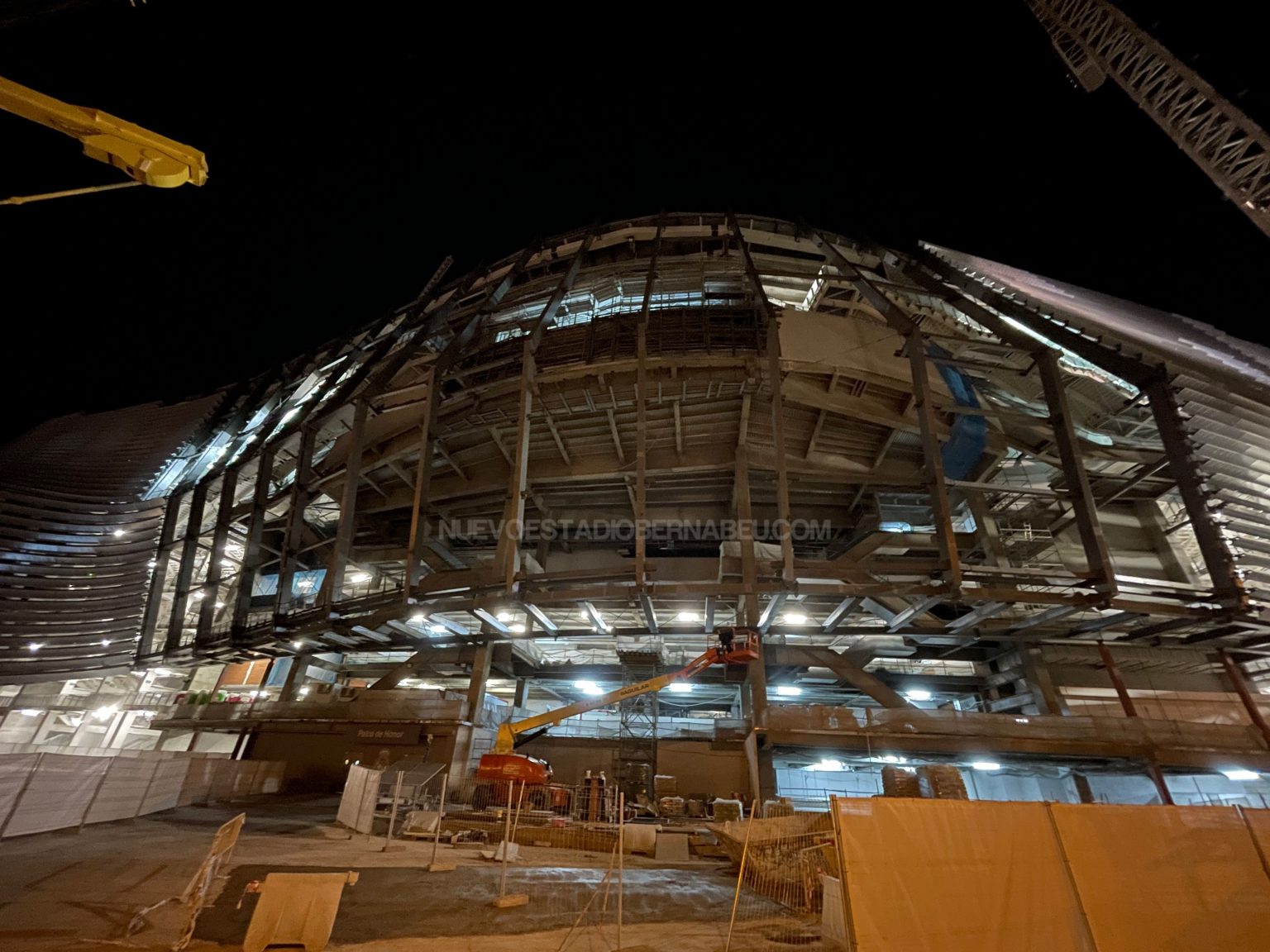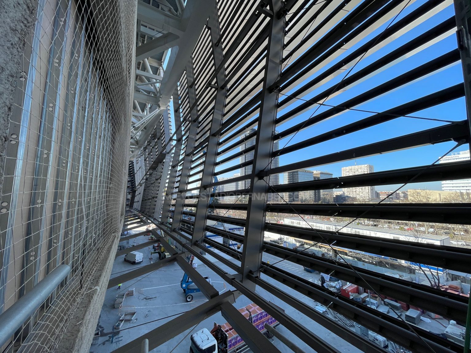 La nueva piel envolvente del estadio Santiago Bernabéu está tomando forma. En la actualidad se acometen trabajos de estructura de fachada en el lateral este y se instalan sin parar las lamas por todo el estadio tomando especial relevancia el avance que se ha producido sobre la futura plaza privada de uso público de Los Sagrados Corazones.