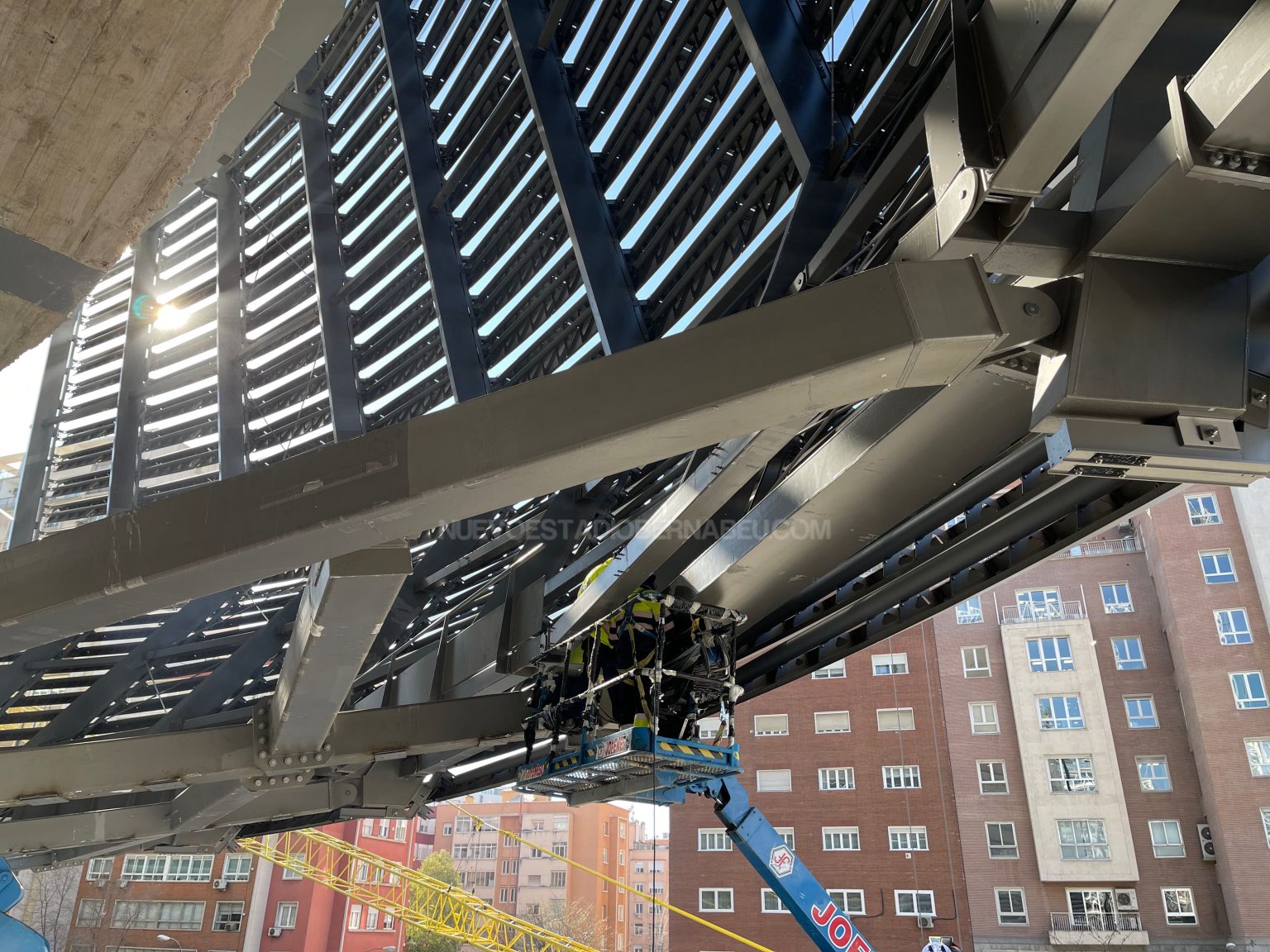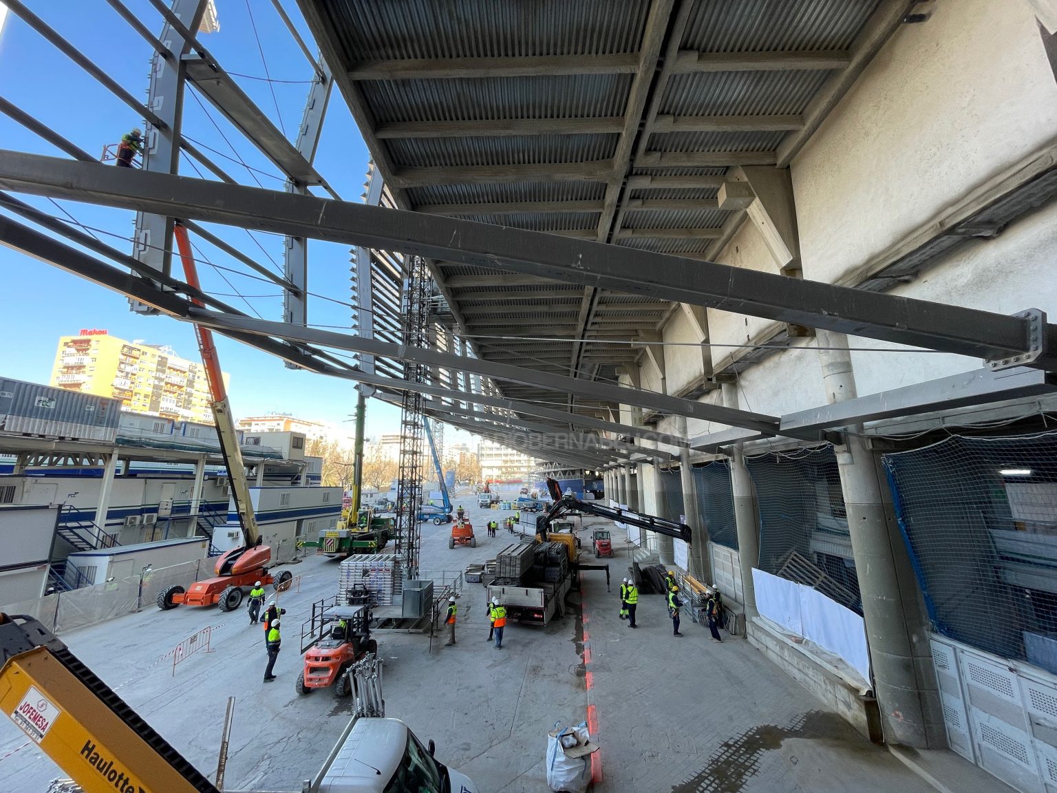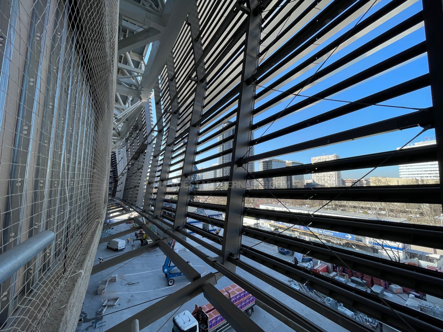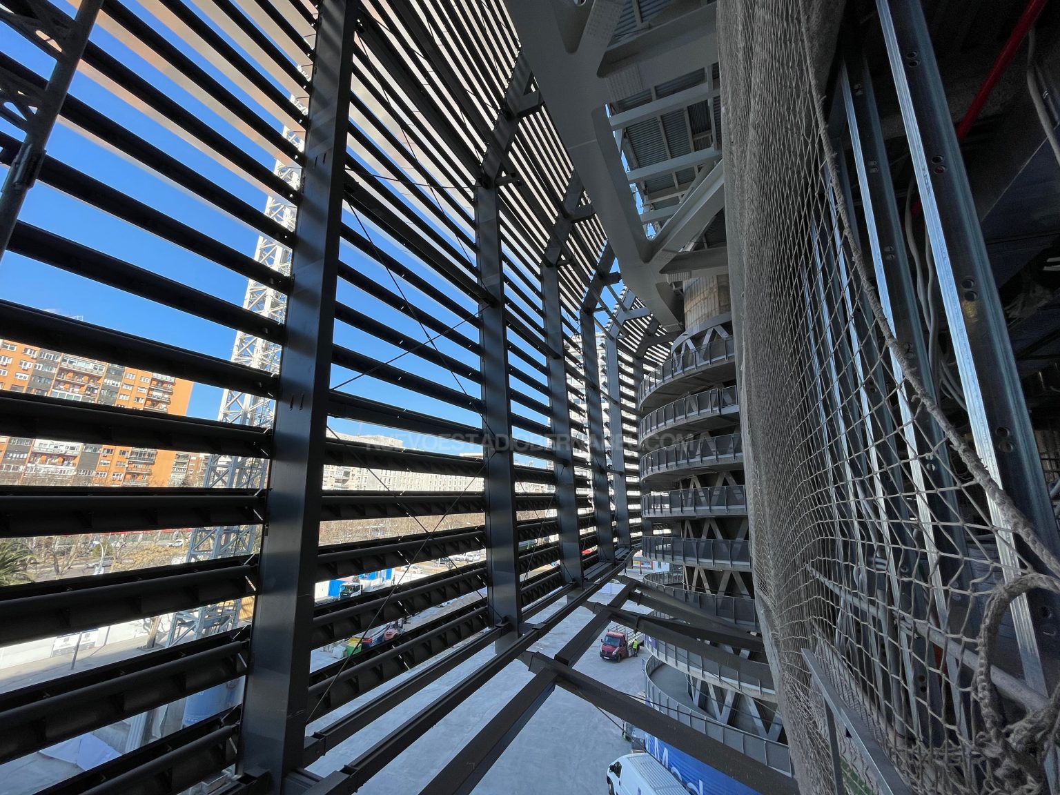 La nueva piel envolvente del estadio Santiago Bernabéu está tomando forma. En la actualidad se acometen trabajos de estructura de fachada en el lateral este y se instalan sin parar las lamas por todo el estadio tomando especial relevancia el avance que se ha producido sobre la futura plaza privada de uso público de Los Sagrados Corazones.