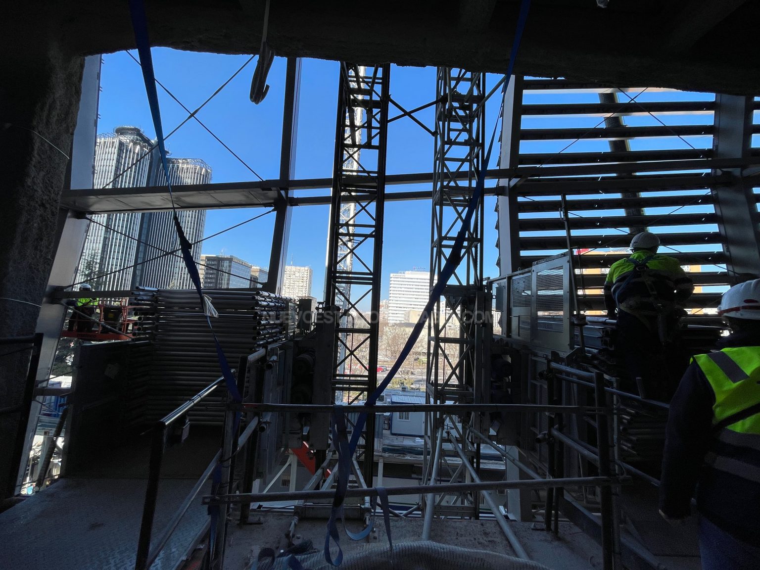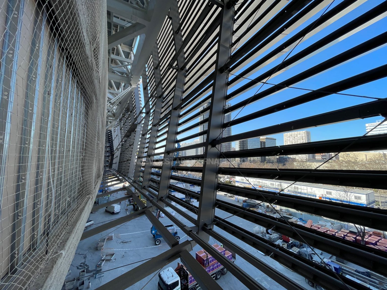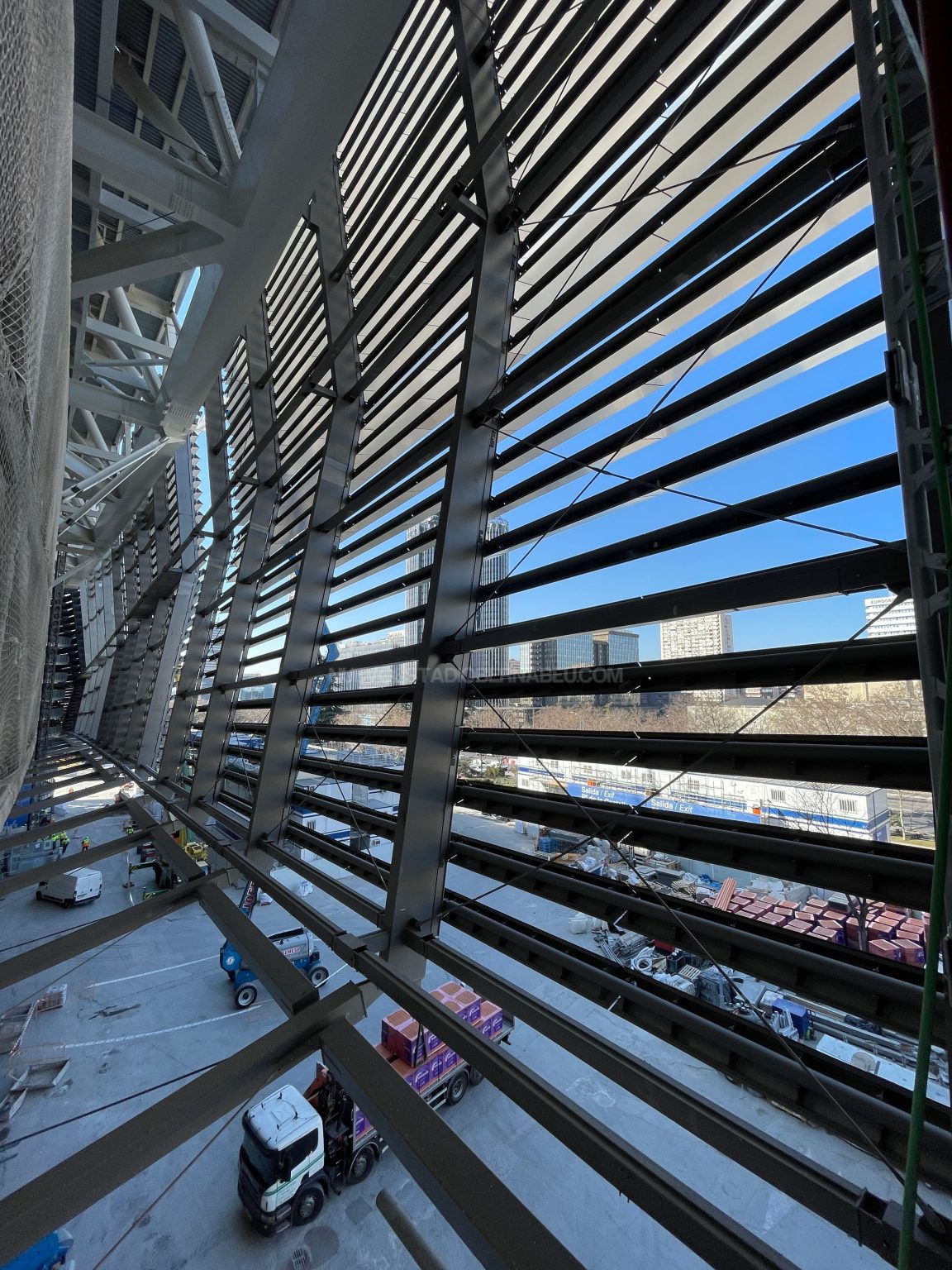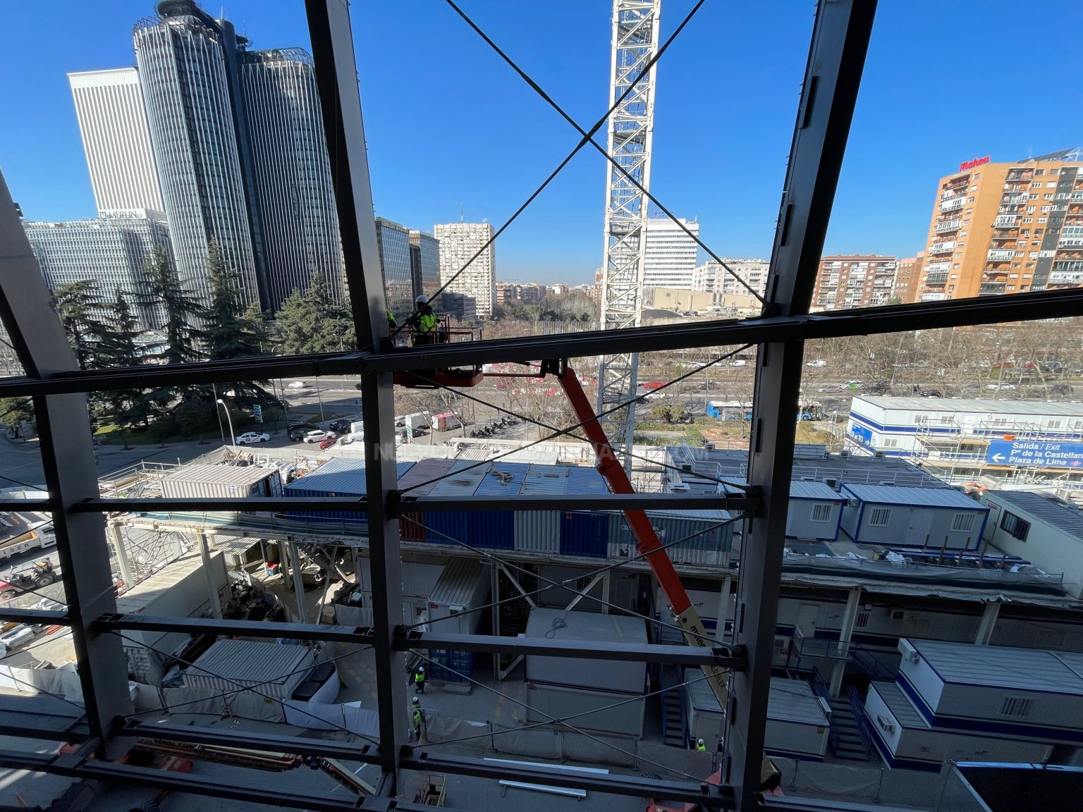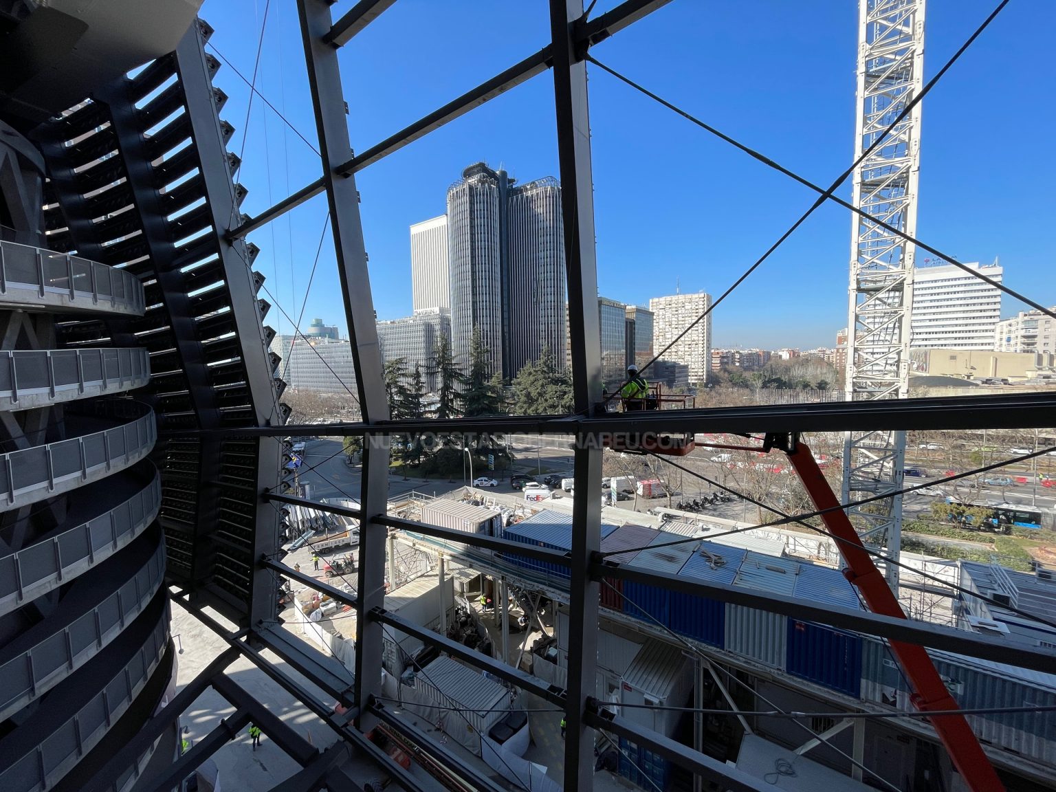 La nueva piel envolvente del estadio Santiago Bernabéu está tomando forma. En la actualidad se acometen trabajos de estructura de fachada en el lateral este y se instalan sin parar las lamas por todo el estadio tomando especial relevancia el avance que se ha producido sobre la futura plaza privada de uso público de Los Sagrados Corazones.