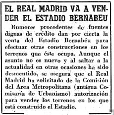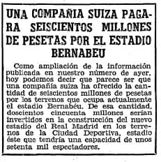 Don Santiago en el año 1964 tuvo la genial idea de DEMOLER el estadio Santiago Bernabéu. Por qué? Pues simplemente porque una empresa suiza ofrecía por los terrenos del actual estadio la friolera de 600 millones de pesetas de la época. Don Santiago a finales de los 50 ordenó proyectar una ampliación de la actual grada lateral oeste (Avenida del Generalísimo de entonces) que con la oferta de los suizos hizo que el Real Madrid se repensara la ampliación y quisiera atender a la oferta.