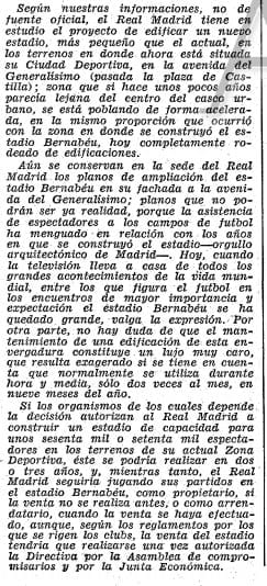 De esos 600 millones de pesetas, 250 se emplearían en un nuevo estadio en los terrenosde la Ciudad Deportiva, y cuentan las informaciones de entonces que Don Santiago querría un estadio únicamente con capacidad de entre 60-70.000 espectadores. La llegada de la televisión a los hogares restaba afluencia al estadio a lo que sumado al coste elevadísimo de un estadio de gran envergadura que se utilizaba 2 veces al mes durante 90 minutos disparaba los costes de mantenimiento para el Real Madrid. Eran otros tiempos, pero Don Santiago lo tenía claro.