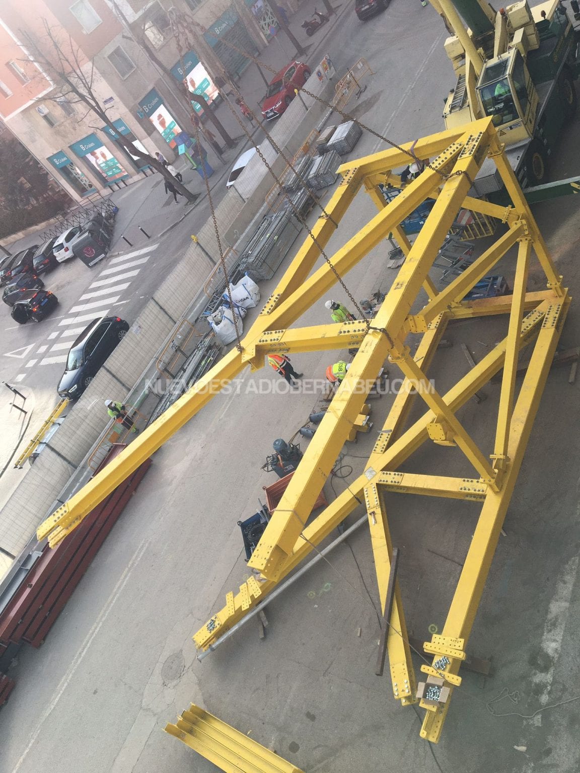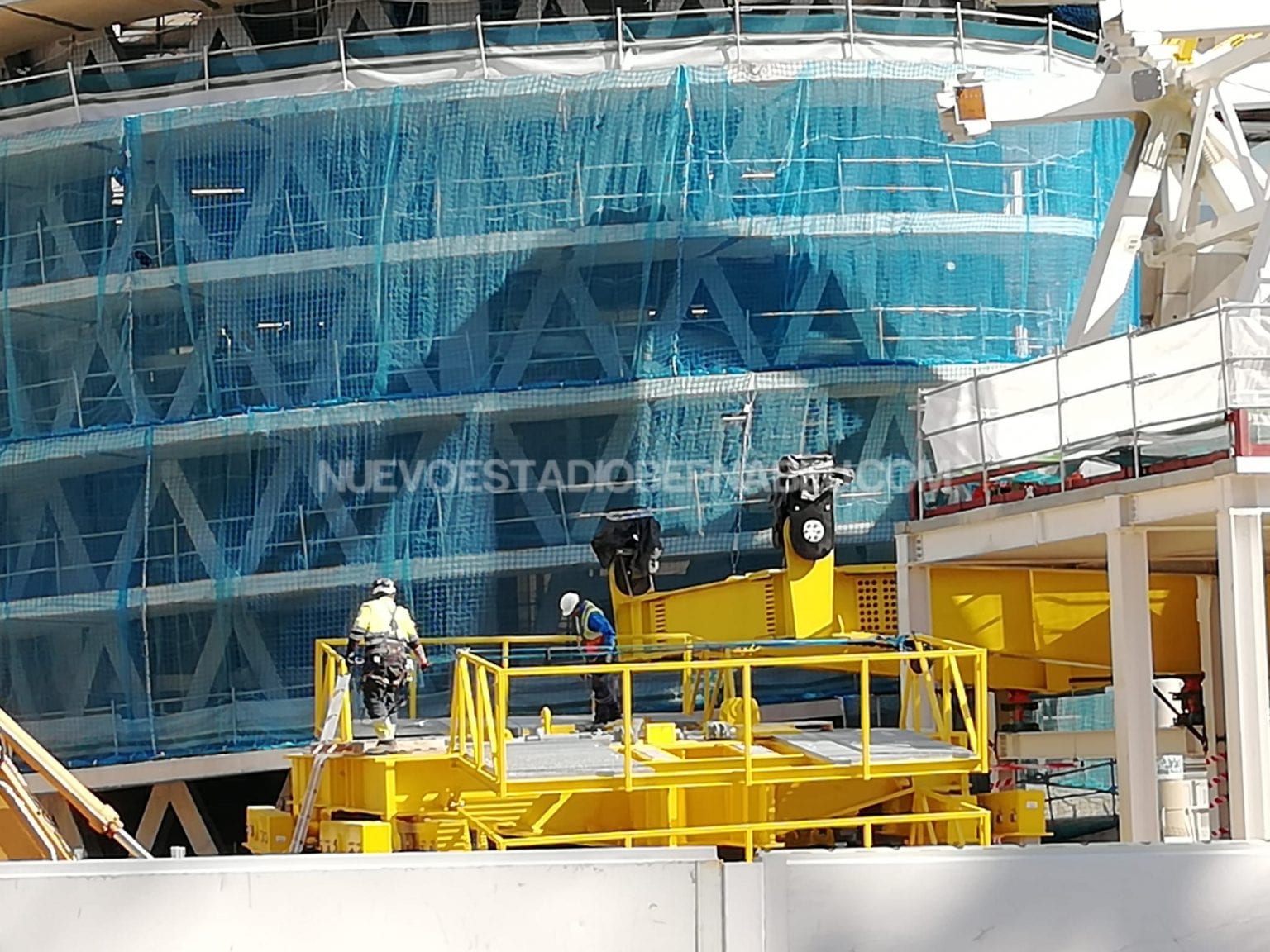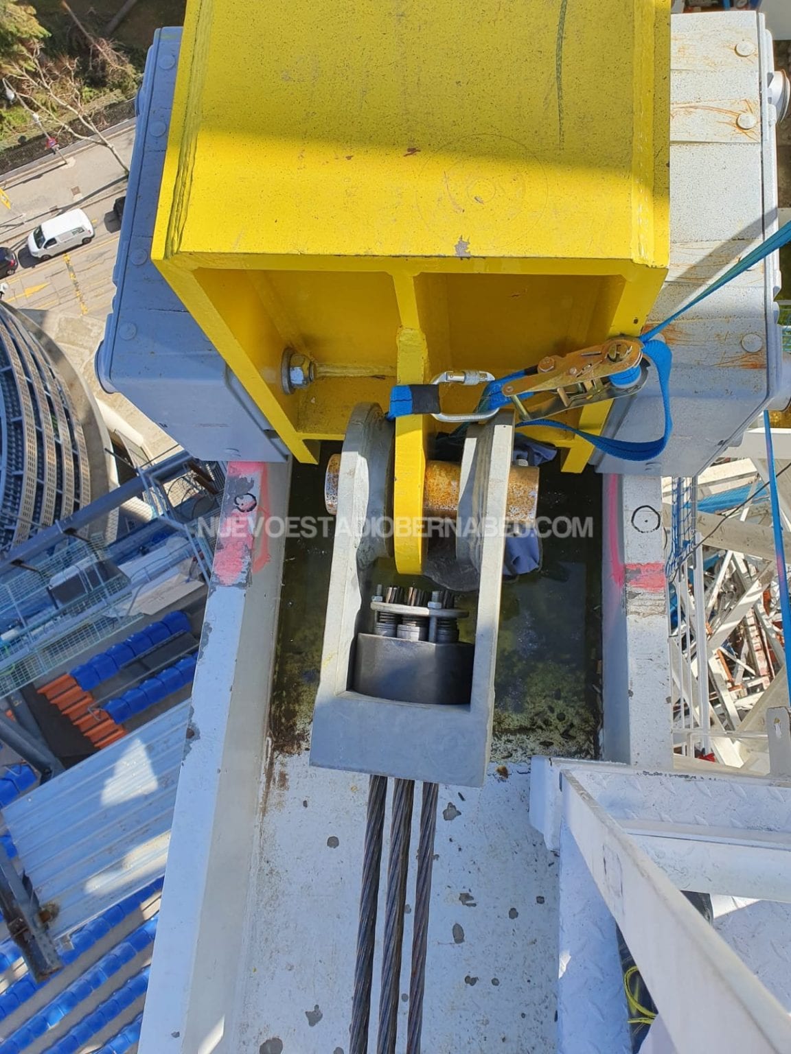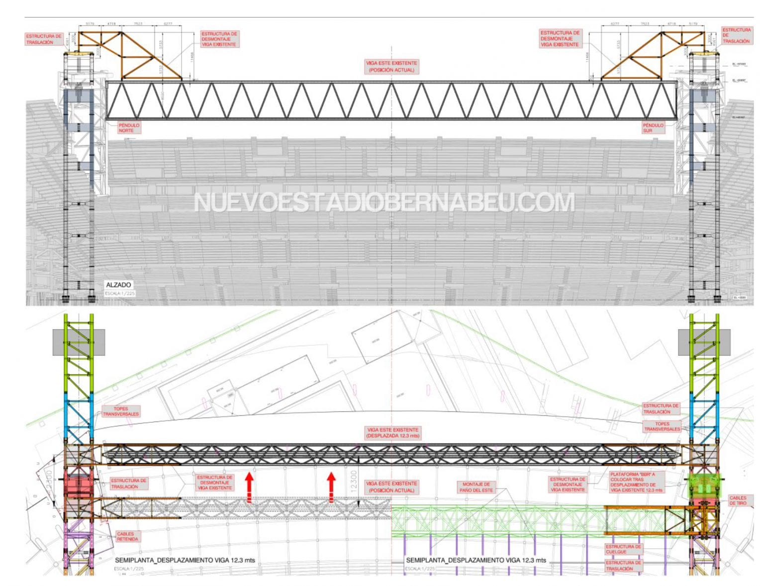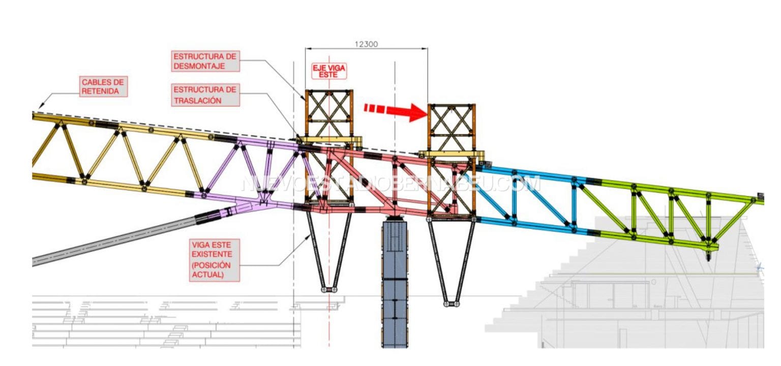 Una vez realizado el desplazamiento de la cubierta nueva y situada en su posición definitiva, se procederá́ al desplazamiento de la viga del Este hasta su posición final para su descenso a tierra mediante grúas. En esta etapa se dispondrán los cilindros de heavy lifting en el lado Este, en las cercanías de los péndulos.