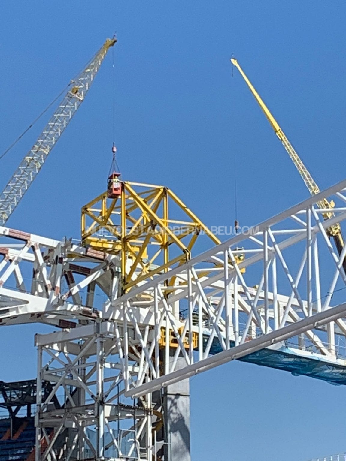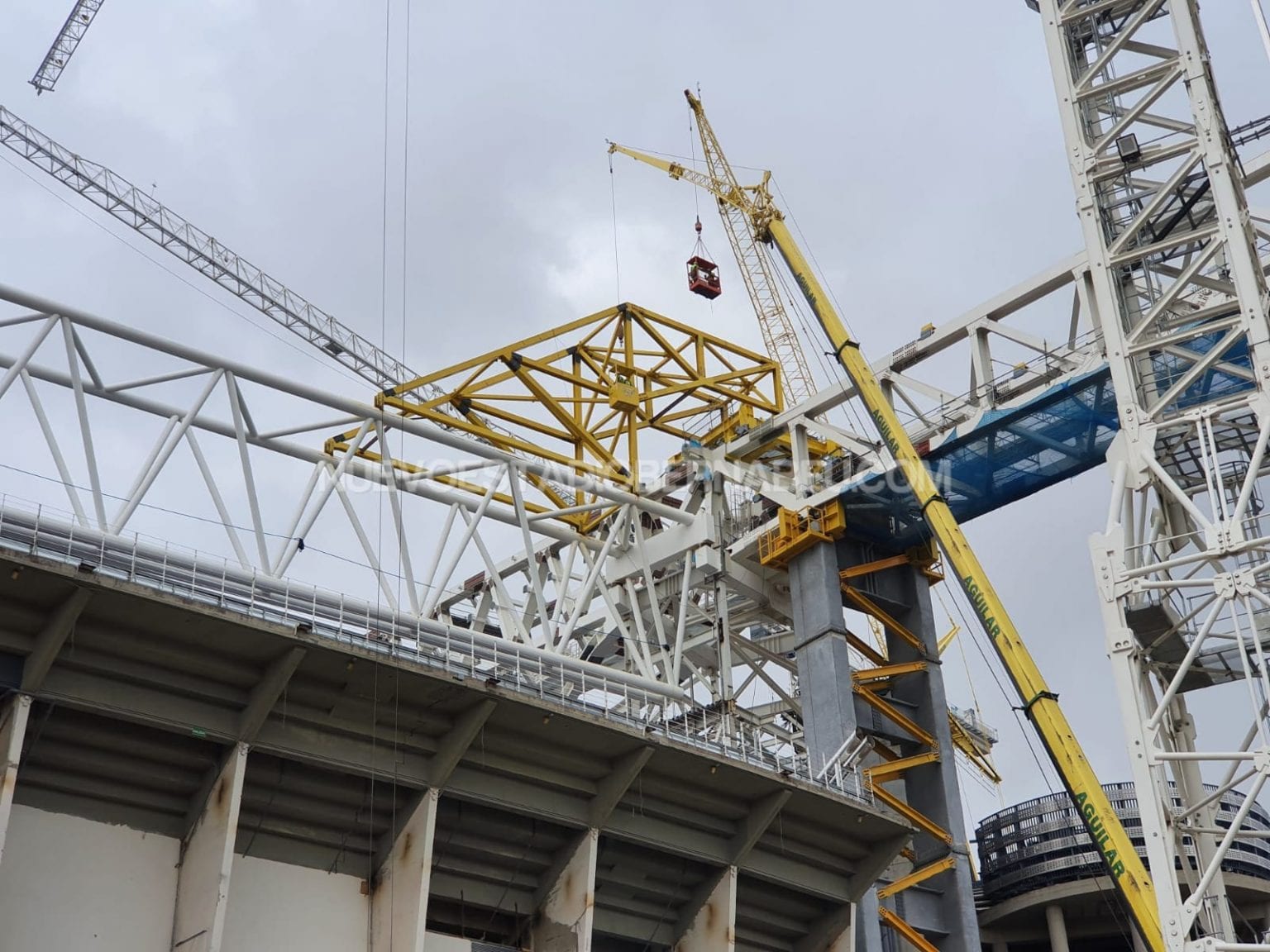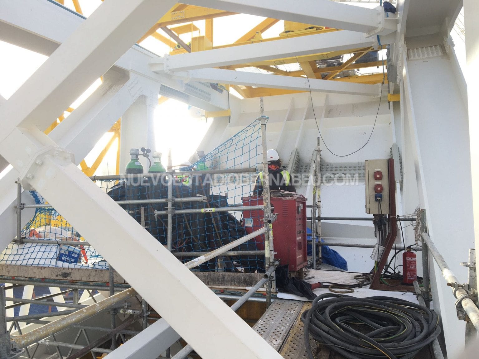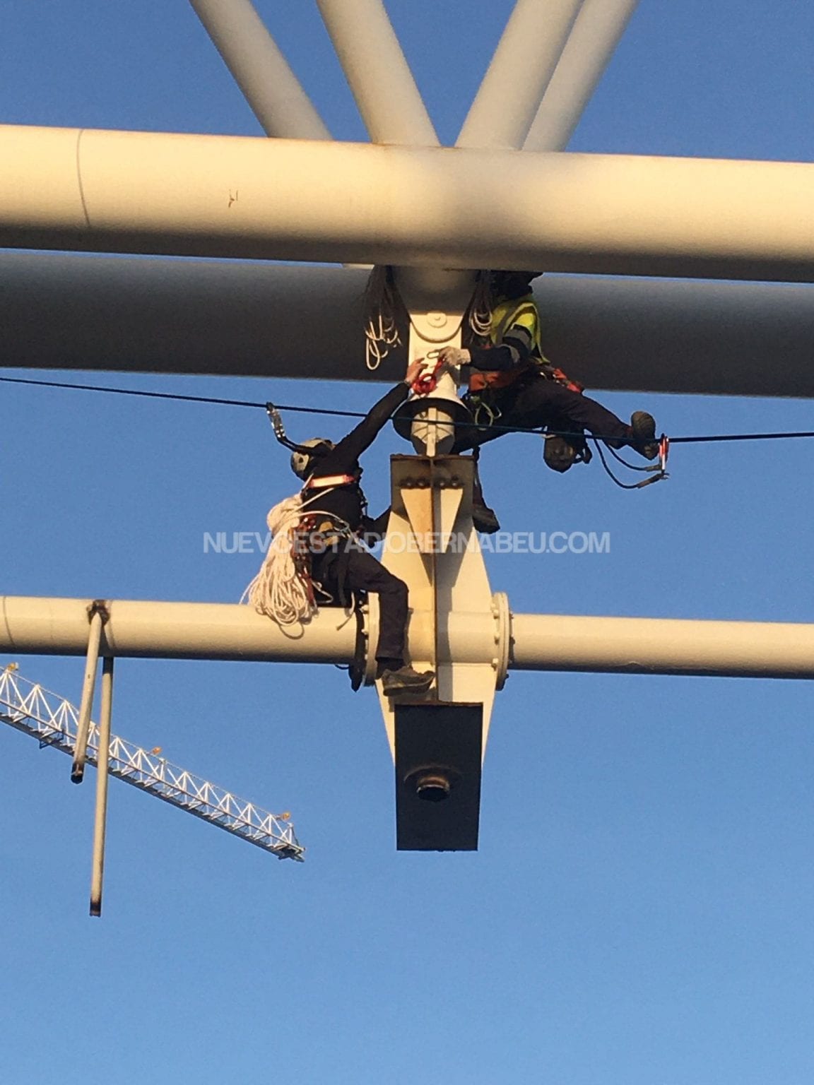 Una vez realizado el desplazamiento de la cubierta nueva y situada en su posición definitiva, se procederá́ al desplazamiento de la viga del Este hasta su posición final para su descenso a tierra mediante grúas. En esta etapa se dispondrán los cilindros de heavy lifting en el lado Este, en las cercanías de los péndulos.