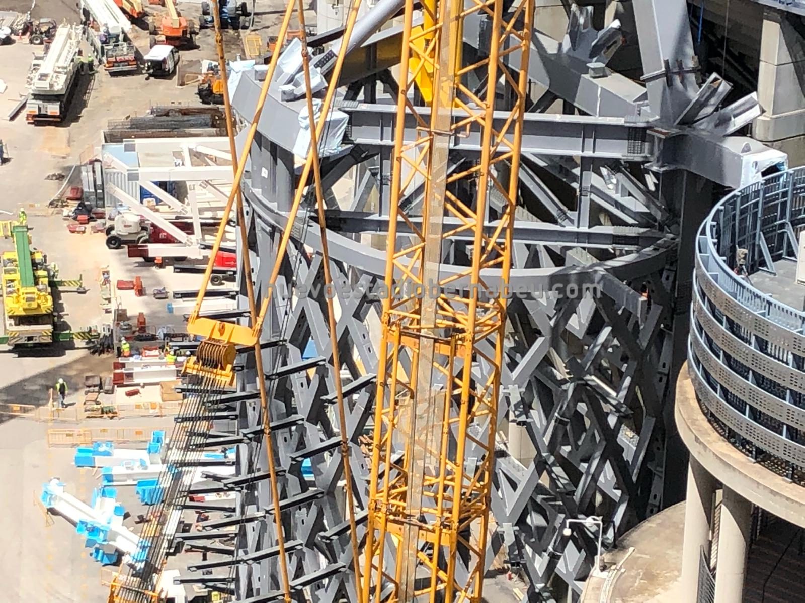 Como todos sabéis las nuevas torres tienen una doble misión. Con una superficie de planta idéntica a las que actualmente ocupan el lateral oeste, las nuevas torres harán la función de evacuación que venían haciendo las antiguas torres B y C y por otro, y vital para la estabilidad del conjunto, ya hacen de apoyo de las cerchas principales de la nueva cubierta que se está construyendo.