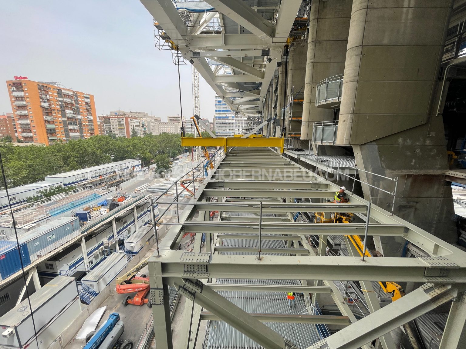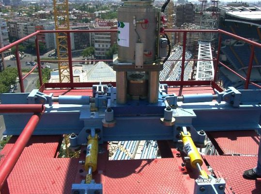 Para la operación de izado de la viga Museo del estadio Santiago Bernabeu se va a utilizar un sistema de elevación basado en cilindros hidraúlicos con cordones de acero (heavy lifting). El izado se realizará desde el lado del Paseo de la Castellana, donde se situarán las estructuras para su premontaje.