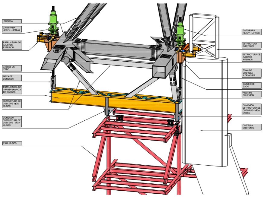 Los 4 cilindros de heavy lifting disponen de un número variable de cordones de acero que a su vez se unen a los enganches con bulón conectados a la estructura de transferencia que sostiene la viga museo. La actuación de estos 4 cilindros de heavy lifting de manera sincronizada desde un panel de control, permite que se eleve la estructura al traccionar los cordones de acero que pasan por su interior.