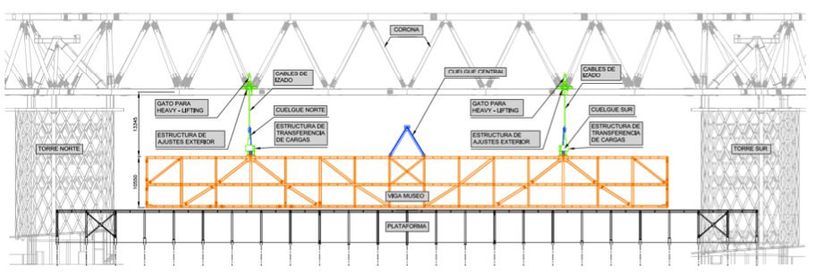 La viga Museo se dispondrá sobre la plataforma de construcción situada en el lado del Paseo de la Castellana. Para el izado se dispondrán de 4 cilindros de heavy lifting situados sobre 4 estructuras de ajuste que a modo de ménsula serán soldadas sobre la viga Corona. Estos cilindros se colocarán en una cota superior y en la vertical a las orejetas de izado que dispone la estructura de transferencia que soporta la viga Museo.