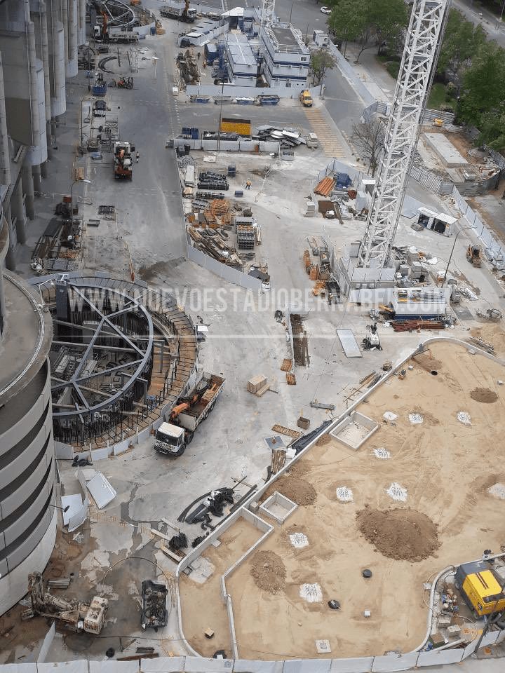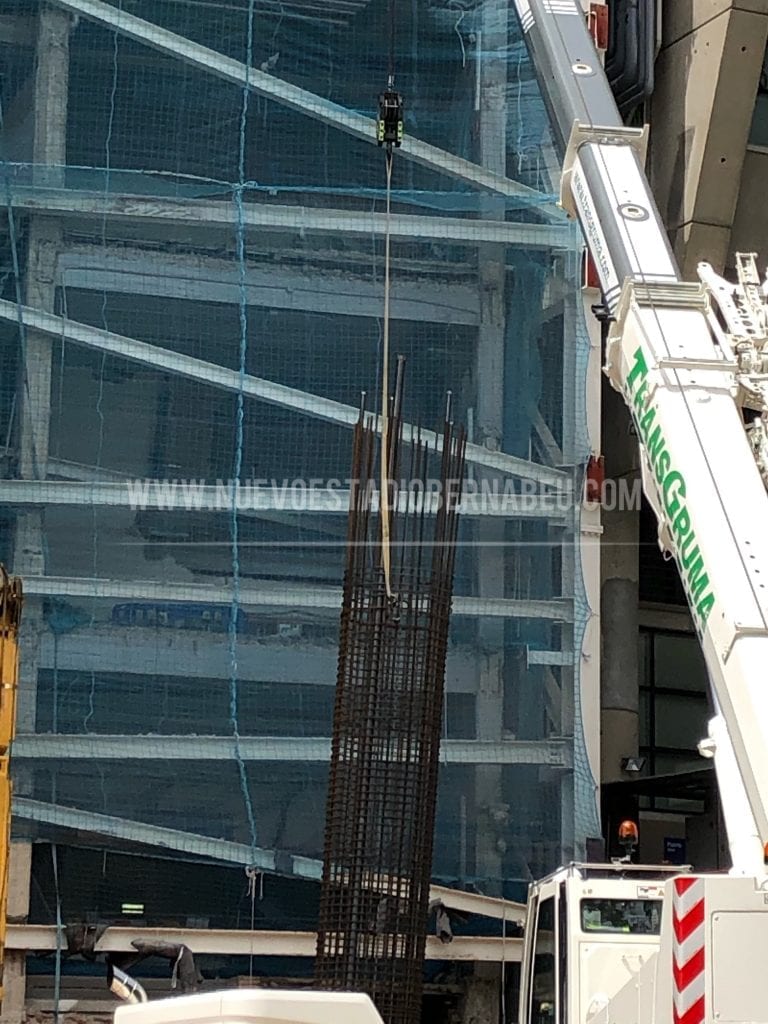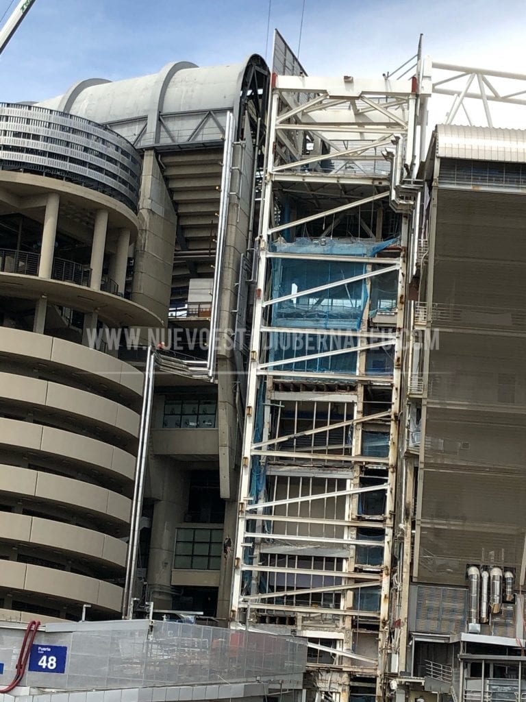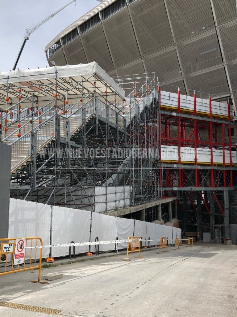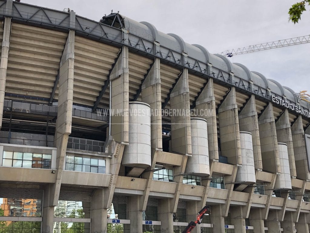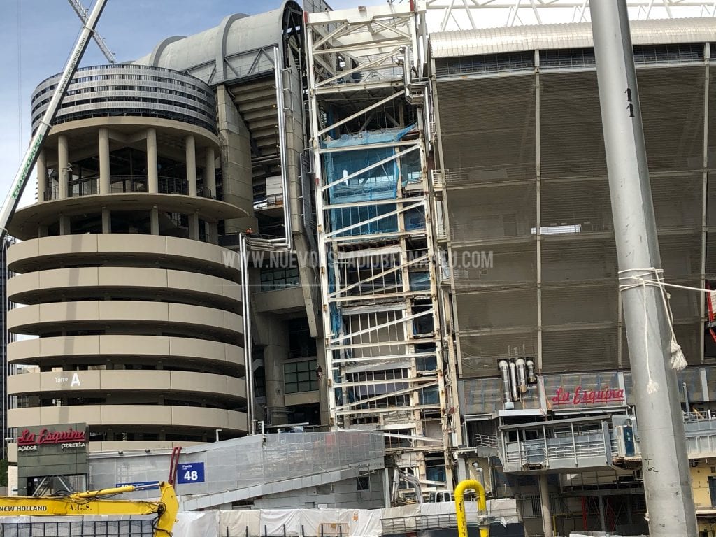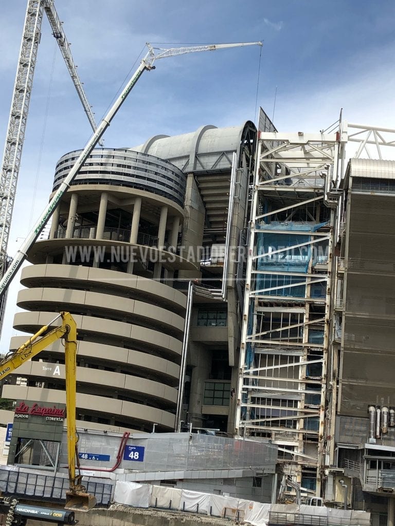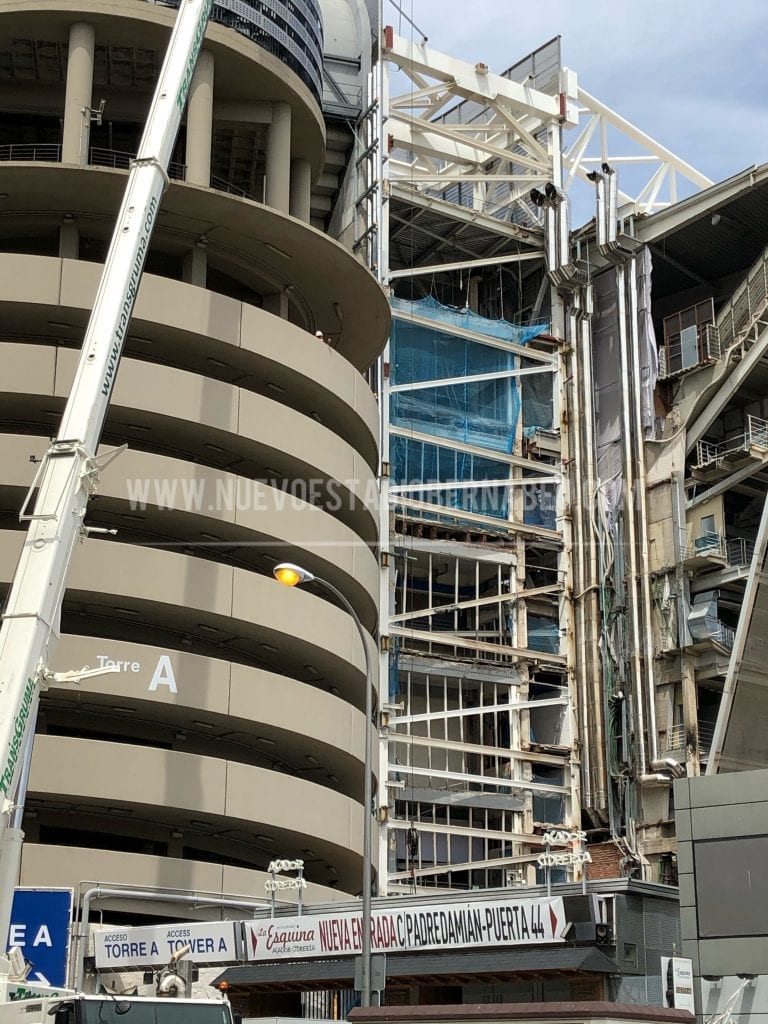 Además del pilotaje del nuevo pilar, se ha comenzado a desmontar la estructura que ha servido de accesos en el lateral este durante esta temporada. Con el desmontaje de esta estructura comenzará la demolición que quedaba pendiente de las plantas sótano del centro comercial de la extinta Esquina del Bernabéu. Aprovechando el desmontaje de la estructura se ha comenzado a retirar toda la maquinaria de ventilación y aire acondicionado que estaba instalada en la cubierta del edificio de oficinas (T4).