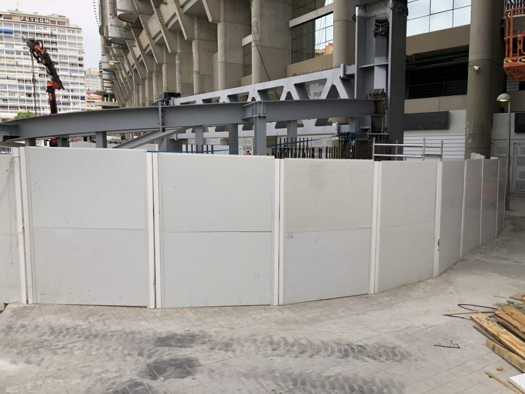 A su vez en el fondo norte se ha montado un cimbrado de gran superficie sobre el que a su vez se han instalado casetas de servicio y material para cubrir los trabajos en esa zona de estadio.