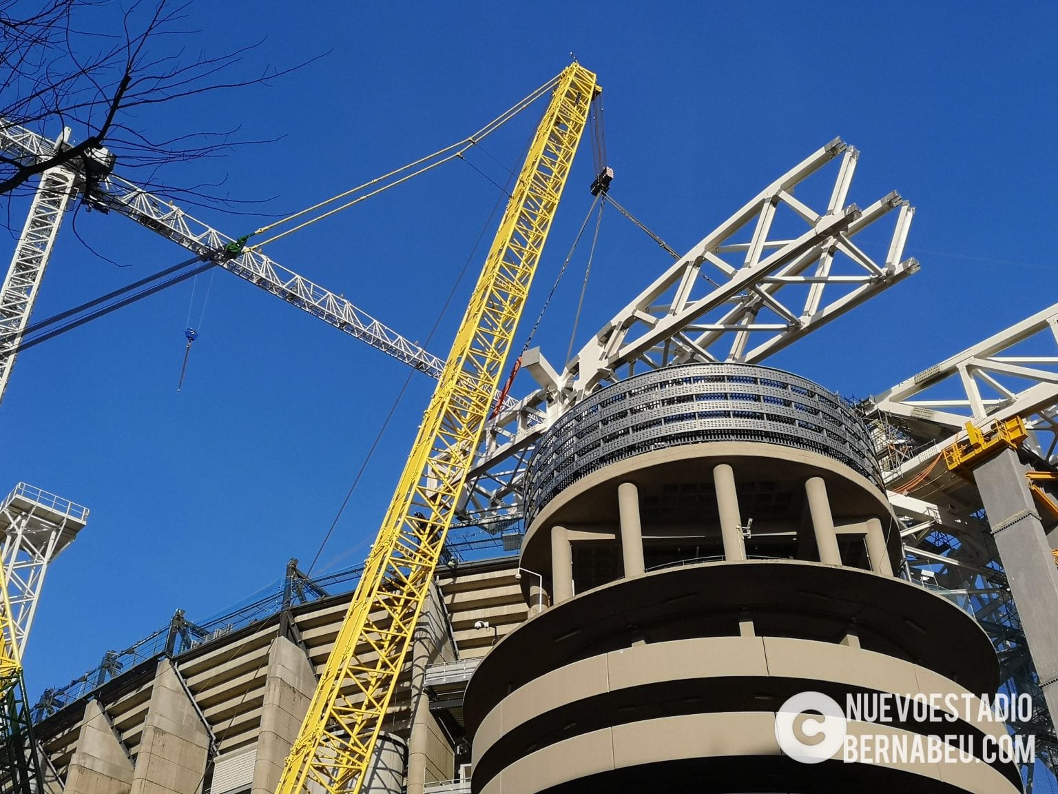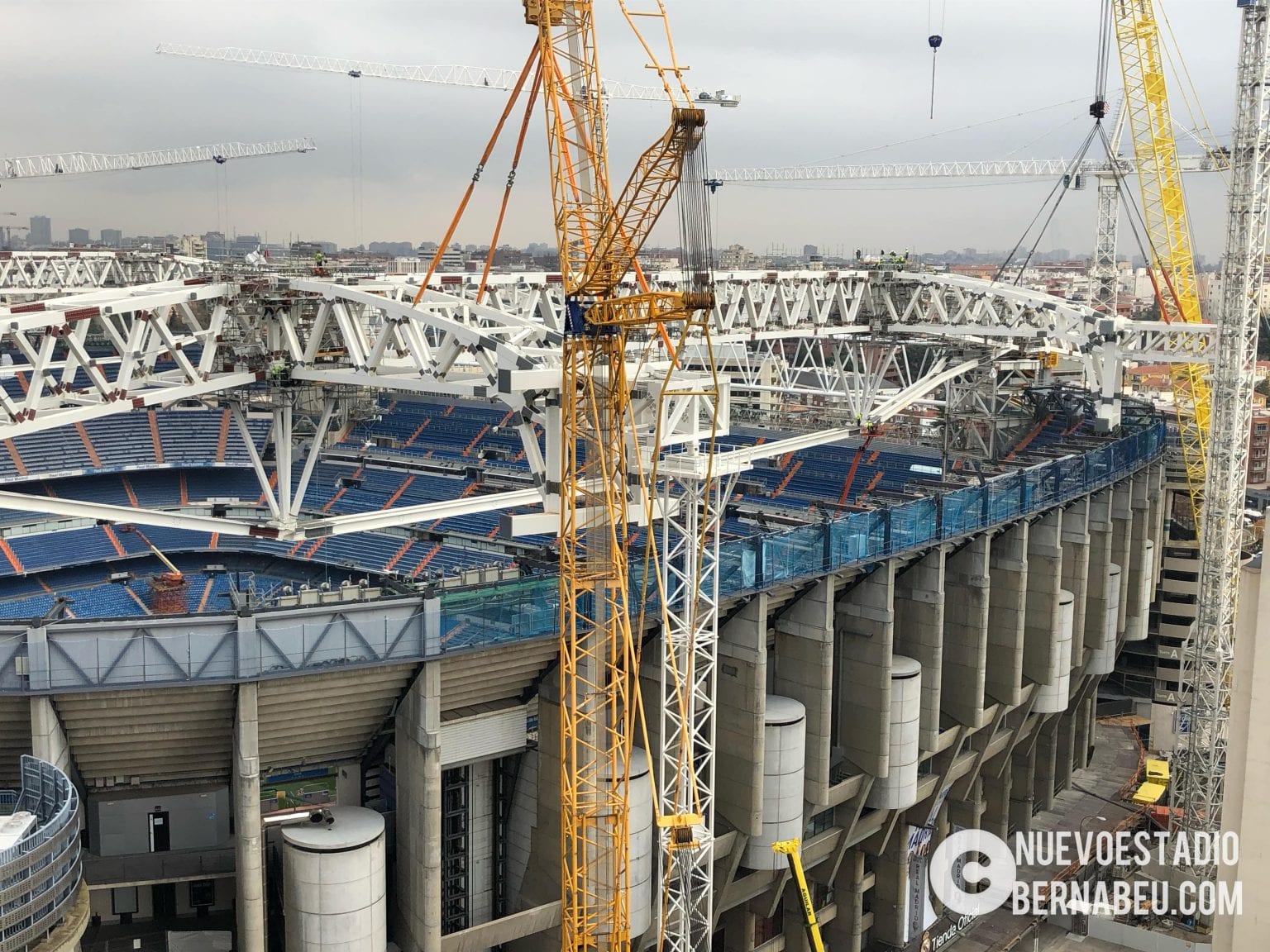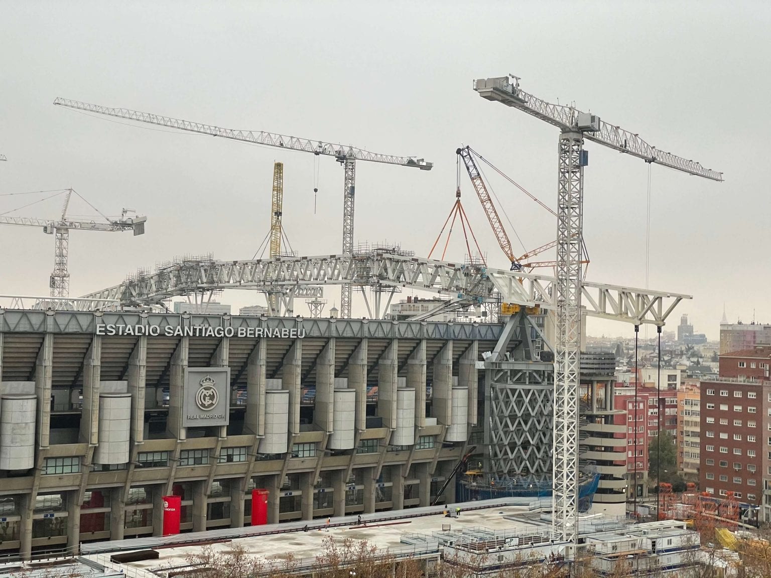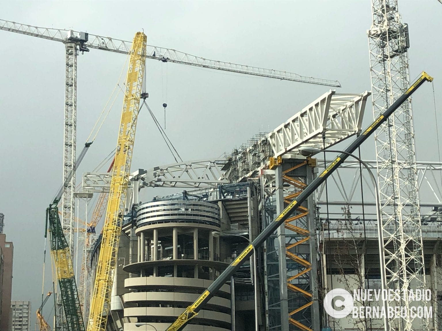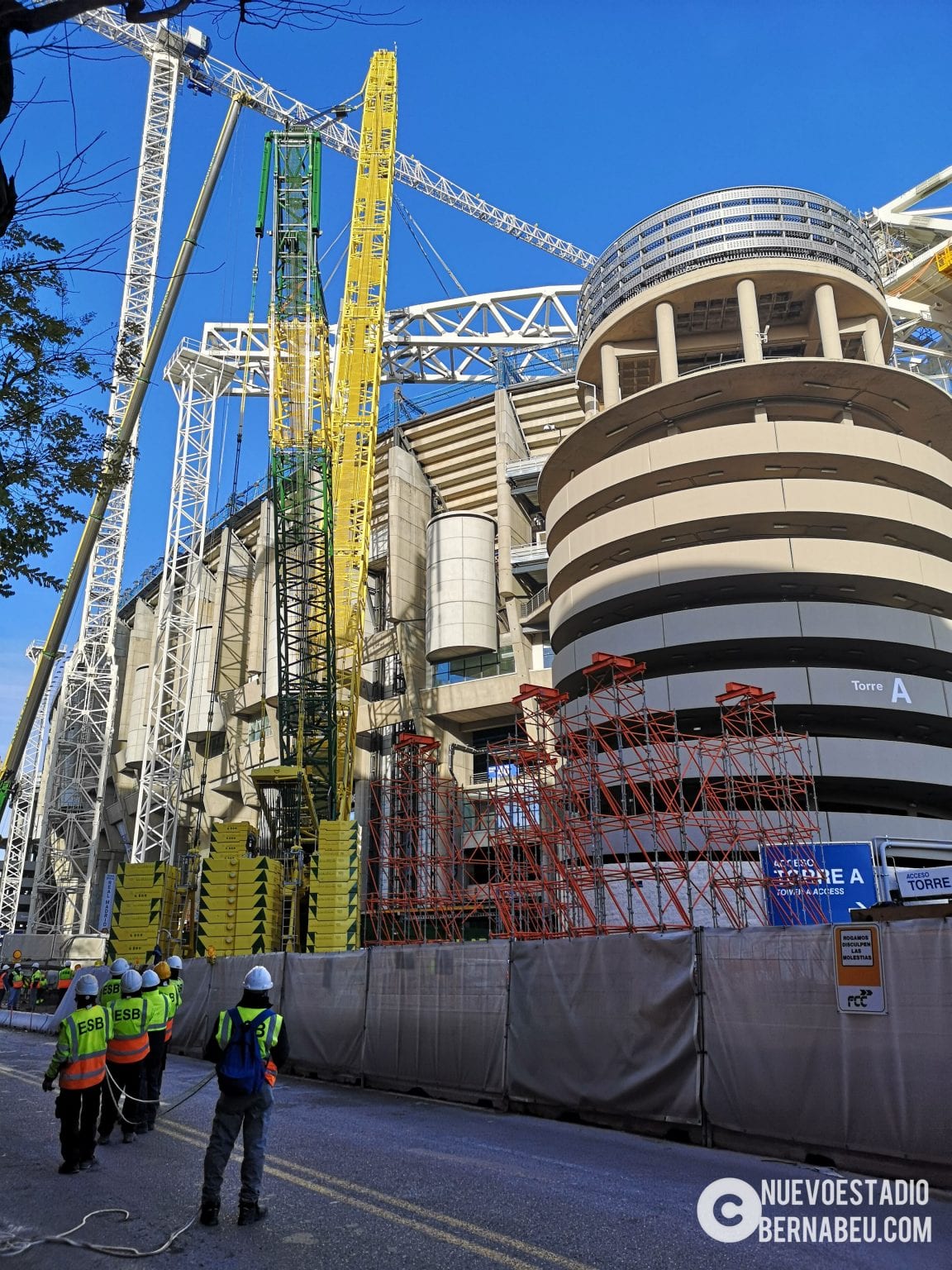 Última semana intensísima en el Real Madrid y el Santiago Bernabéu. La semana fantástica en lo deportivo con victorias en Sevilla, Borussia y Atlético se refrendó durante el fin de semana con el izado y acople, al igual que en la extensión C y la extensión D, de las mastodónticas extensiones A y B que había tenido que aplazarse desde el jueves por los intensos vientos que se registraron en el Bernabéu y que demoraron la operación hasta ayer domingo.