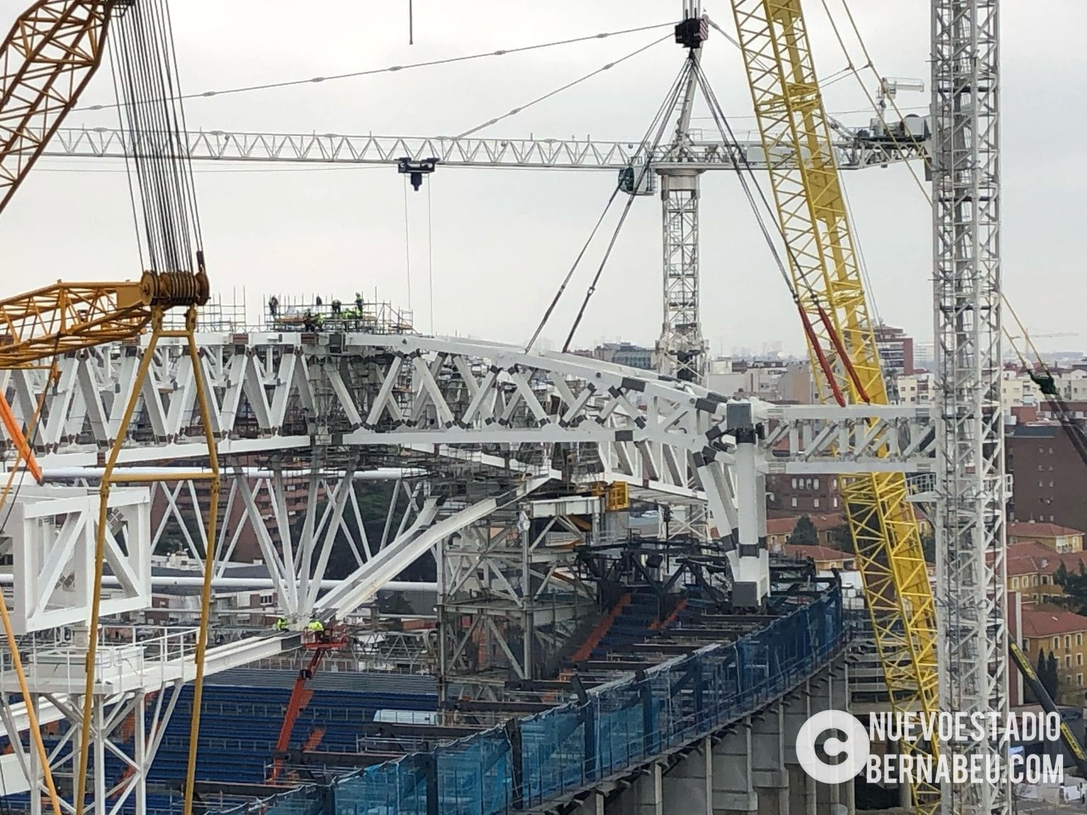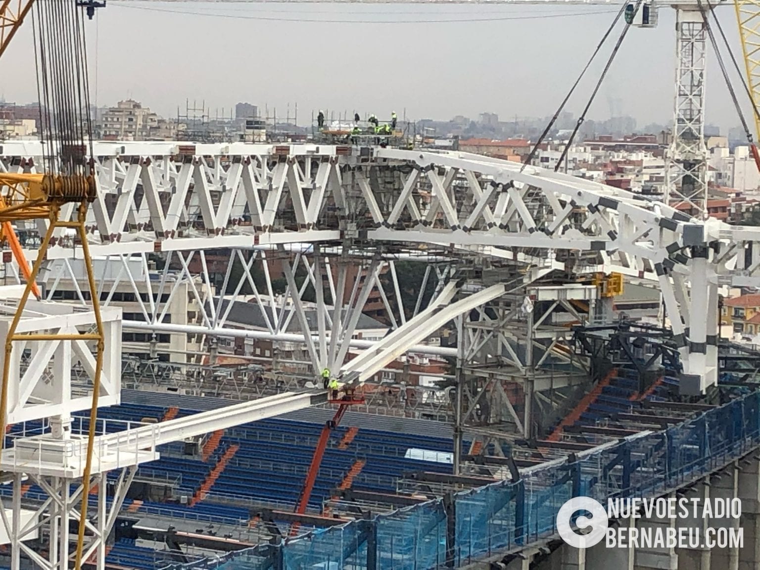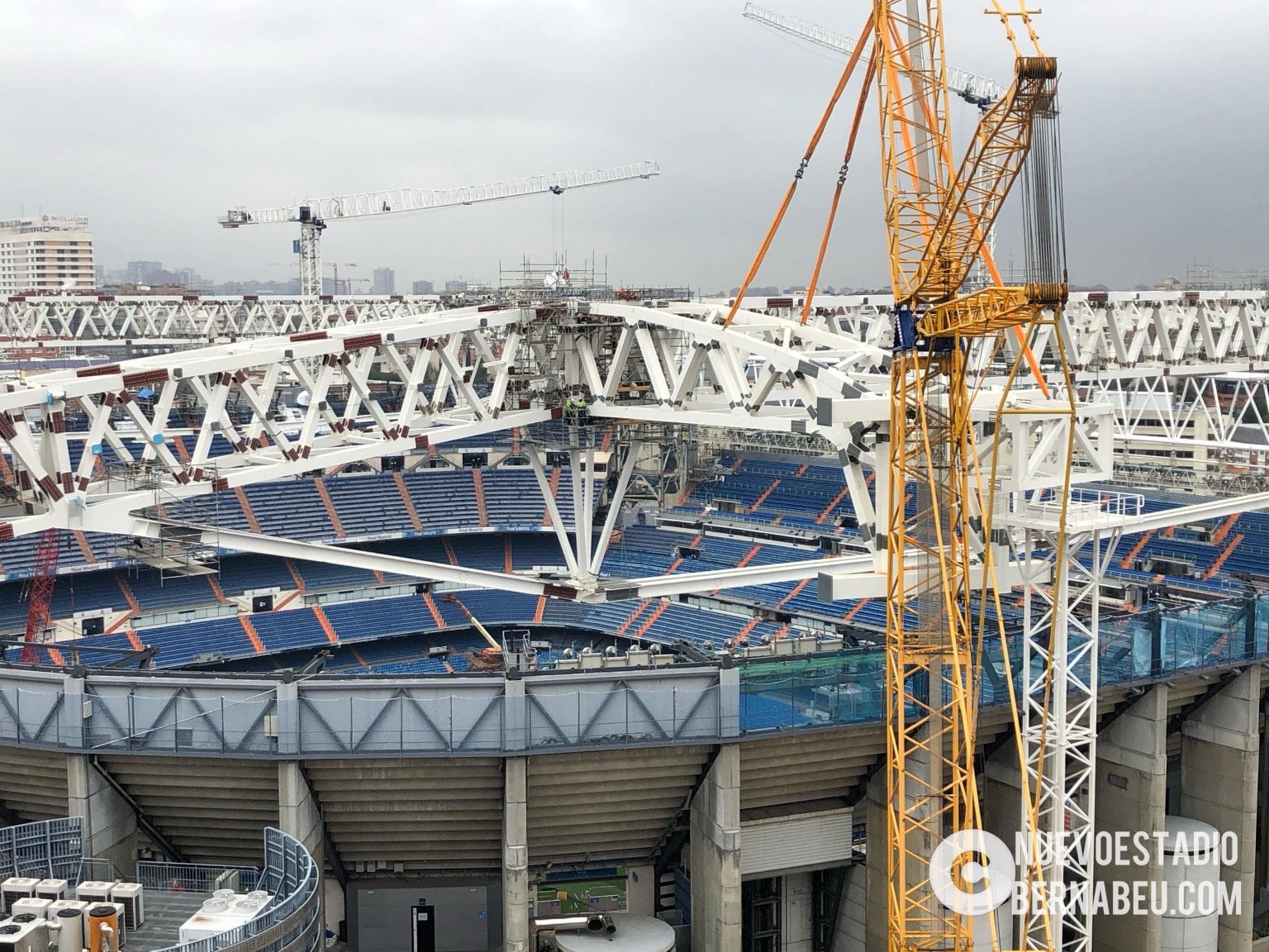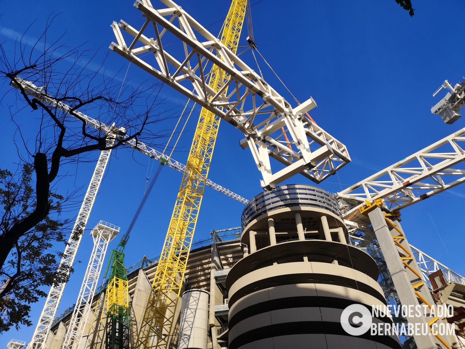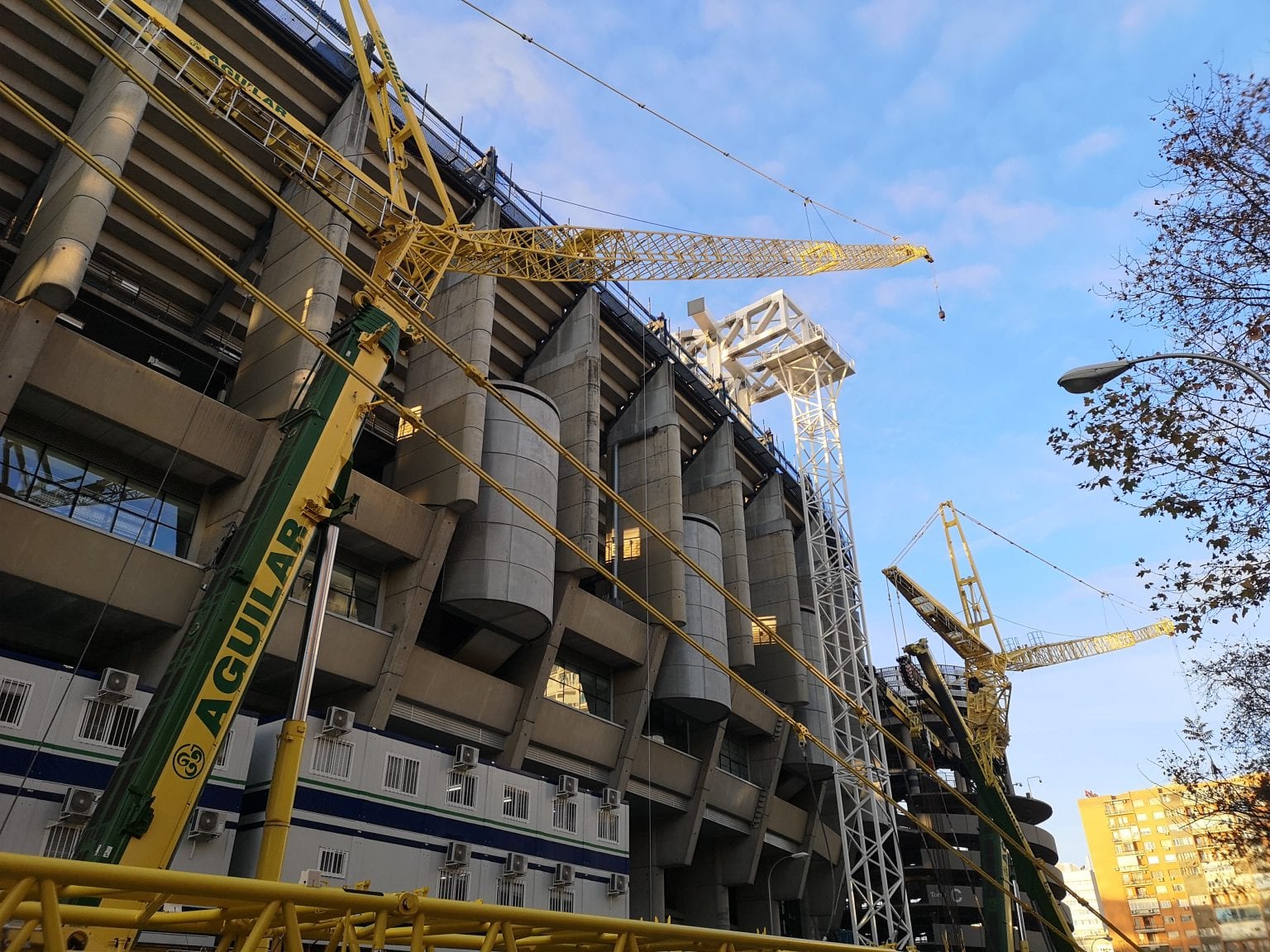 Última semana intensísima en el Real Madrid y el Santiago Bernabéu. La semana fantástica en lo deportivo con victorias en Sevilla, Borussia y Atlético se refrendó durante el fin de semana con el izado y acople, al igual que en la extensión C y la extensión D, de las mastodónticas extensiones A y B que había tenido que aplazarse desde el jueves por los intensos vientos que se registraron en el Bernabéu y que demoraron la operación hasta ayer domingo.