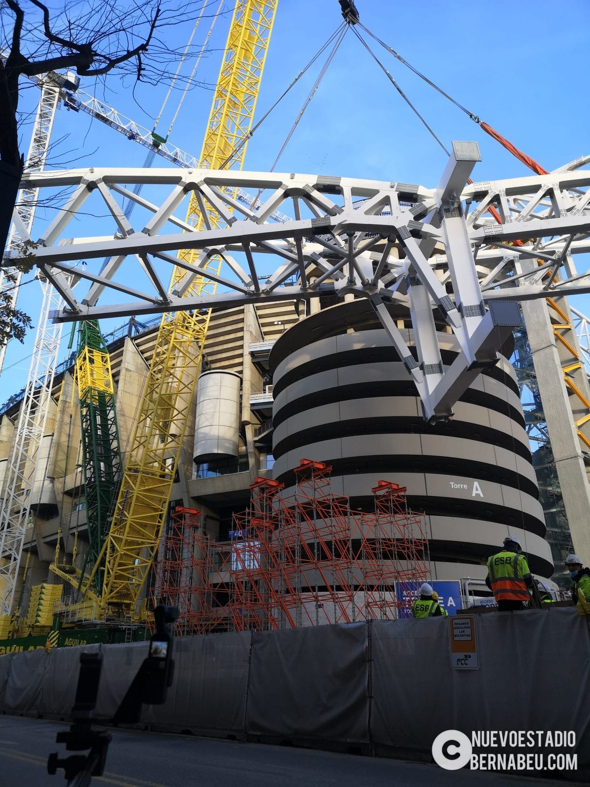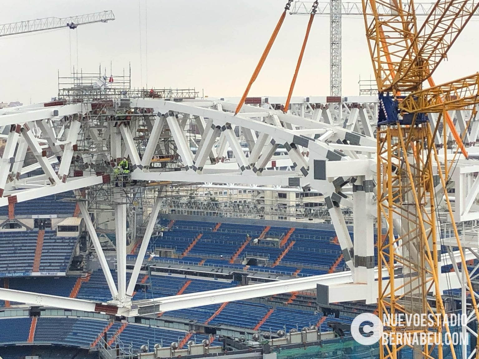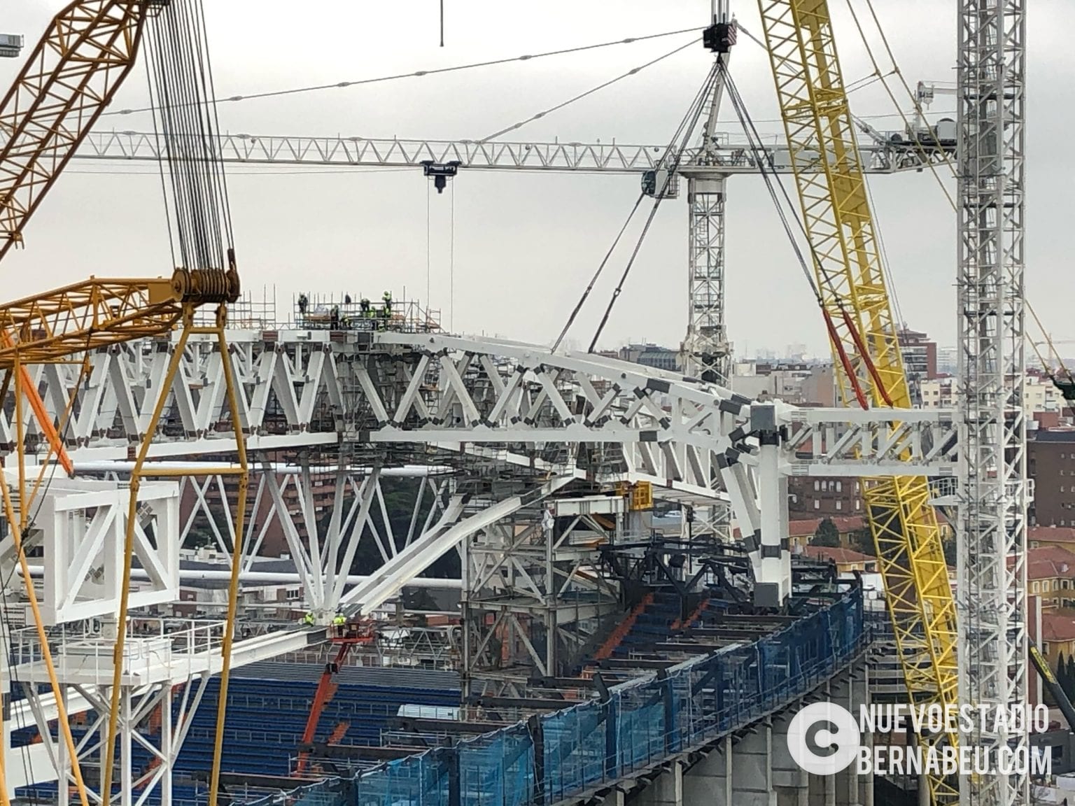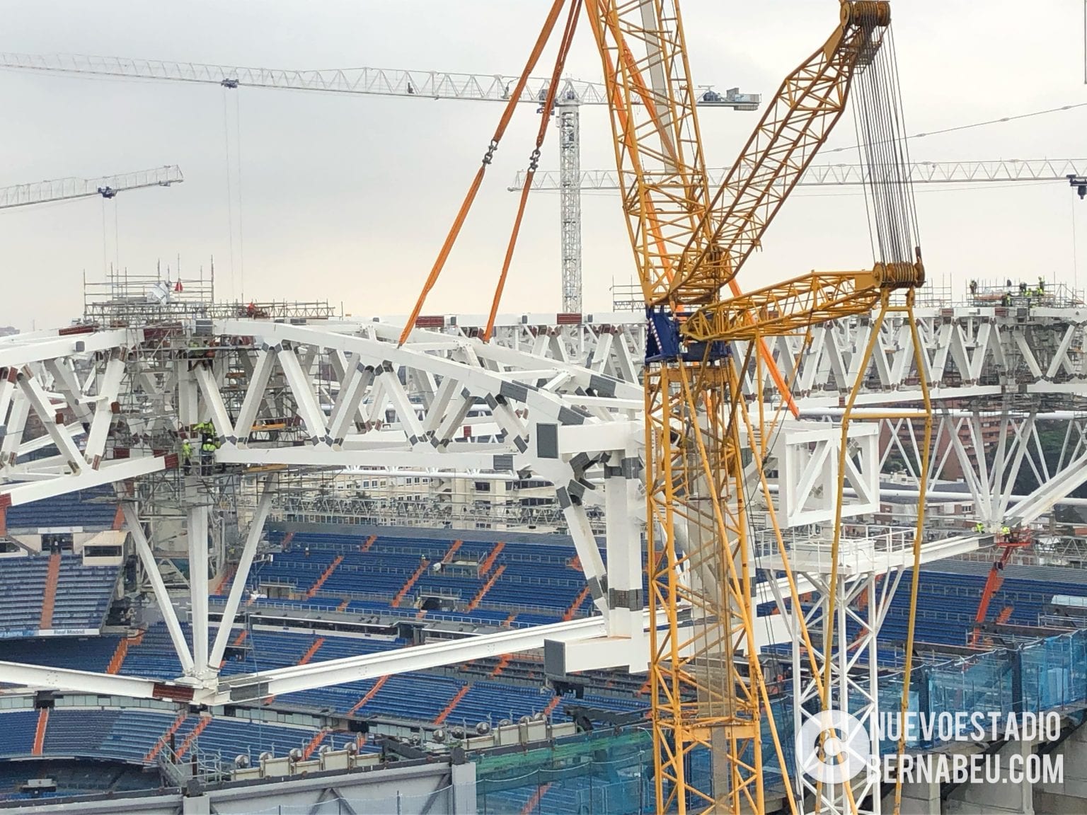 Última semana intensísima en el Real Madrid y el Santiago Bernabéu. La semana fantástica en lo deportivo con victorias en Sevilla, Borussia y Atlético se refrendó durante el fin de semana con el izado y acople, al igual que en la extensión C y la extensión D, de las mastodónticas extensiones A y B que había tenido que aplazarse desde el jueves por los intensos vientos que se registraron en el Bernabéu y que demoraron la operación hasta ayer domingo.