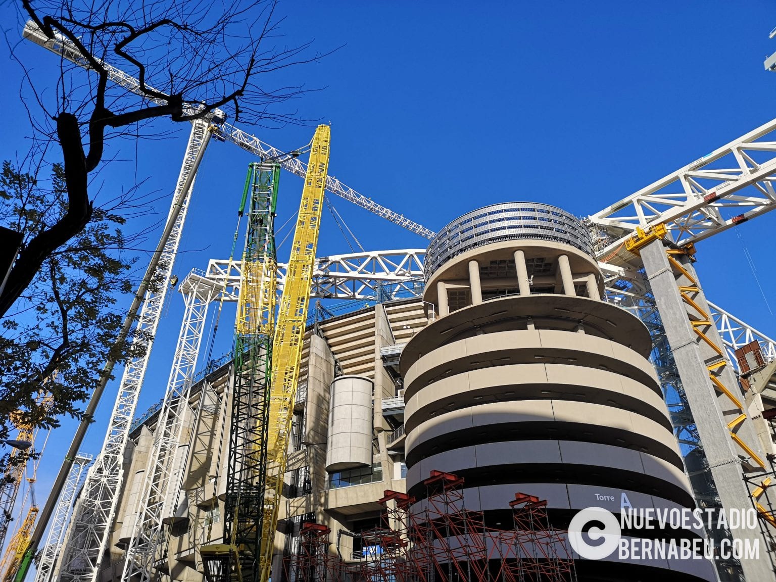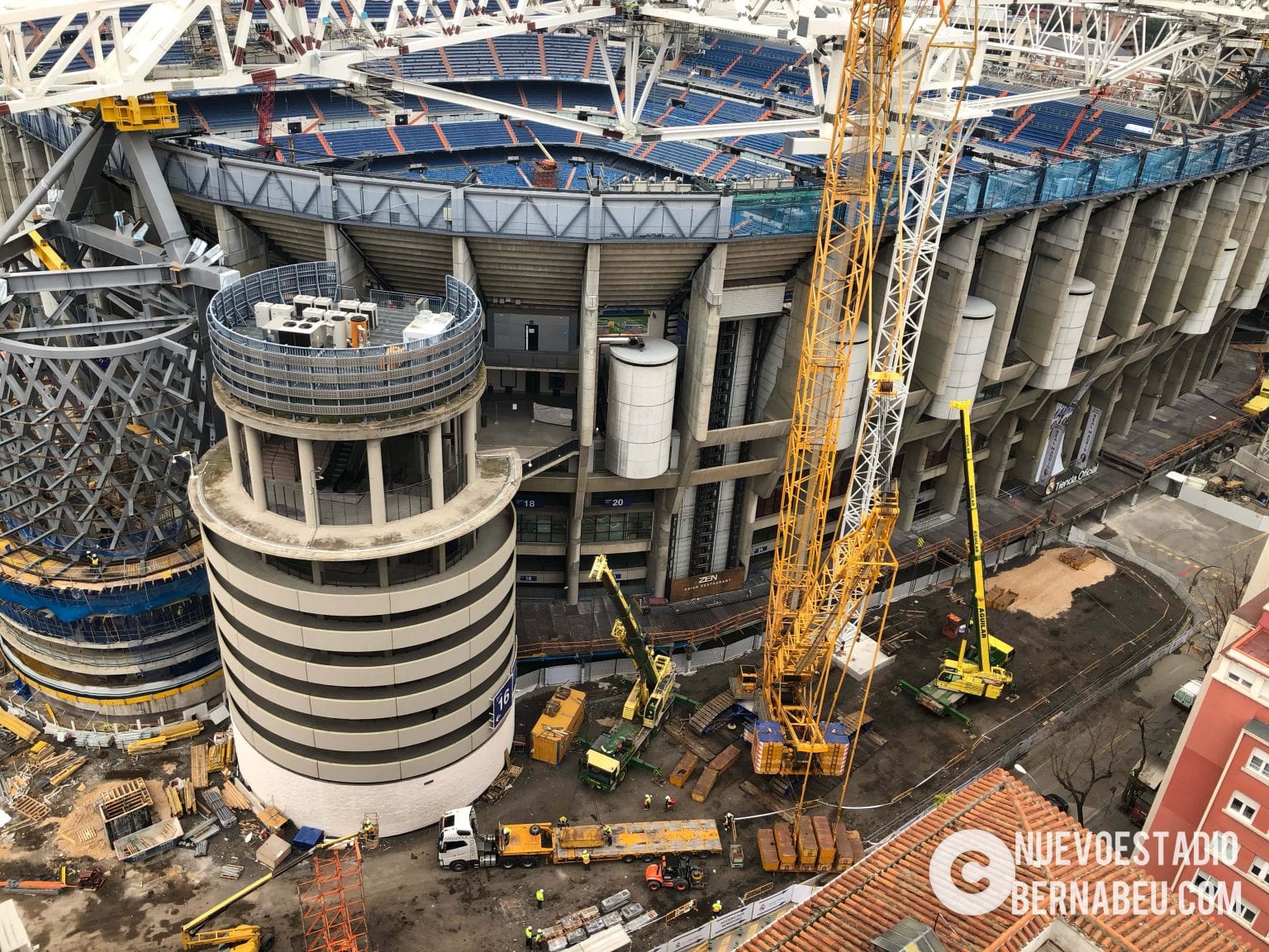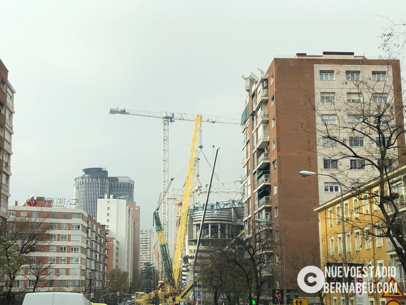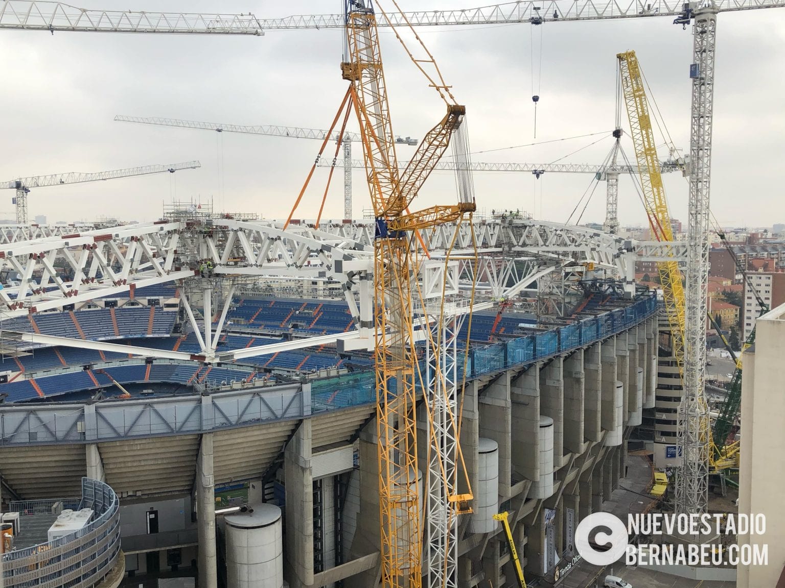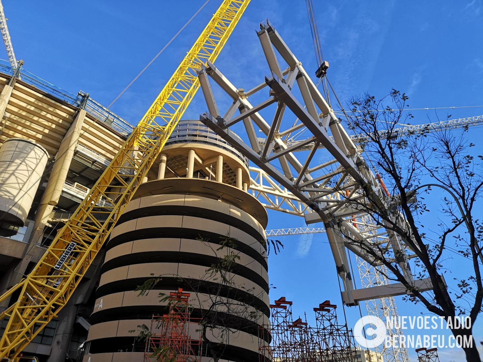 Última semana intensísima en el Real Madrid y el Santiago Bernabéu. La semana fantástica en lo deportivo con victorias en Sevilla, Borussia y Atlético se refrendó durante el fin de semana con el izado y acople, al igual que en la extensión C y la extensión D, de las mastodónticas extensiones A y B que había tenido que aplazarse desde el jueves por los intensos vientos que se registraron en el Bernabéu y que demoraron la operación hasta ayer domingo.