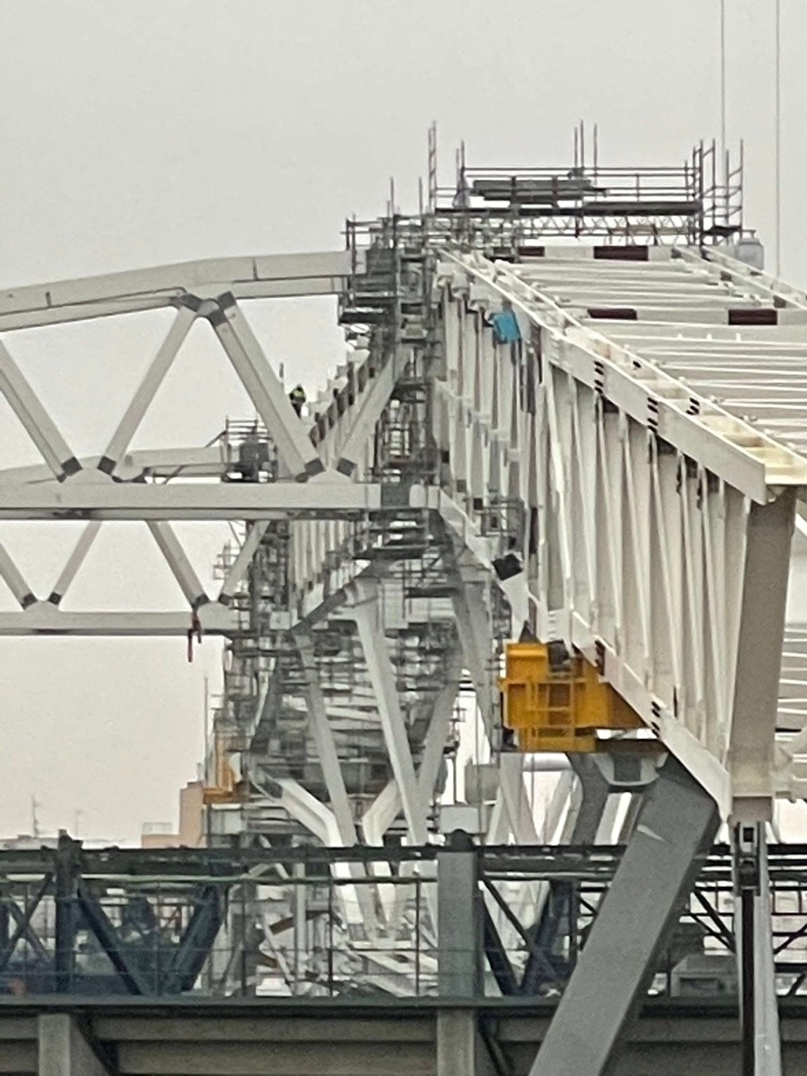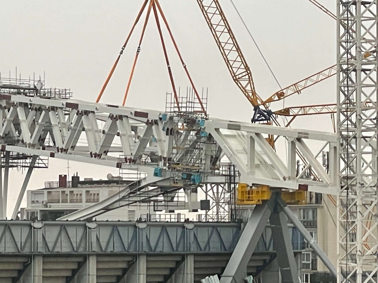 Con el acople de estas extensiones empieza el izado y montaje de las cerchas de fondo durante esta misma semana. Para finales de semana veremos el izado del módulo 2 de la cercha norte, pero eso no será todo, sino que será una semana intensa en cuanto a trabajos en la cercha de fondo norte y habrá un movimiento de izado y acople de continuo de nuevos tramos durante toda la semana siempre y cuando las condiciones meteorológicas lo permitan.
