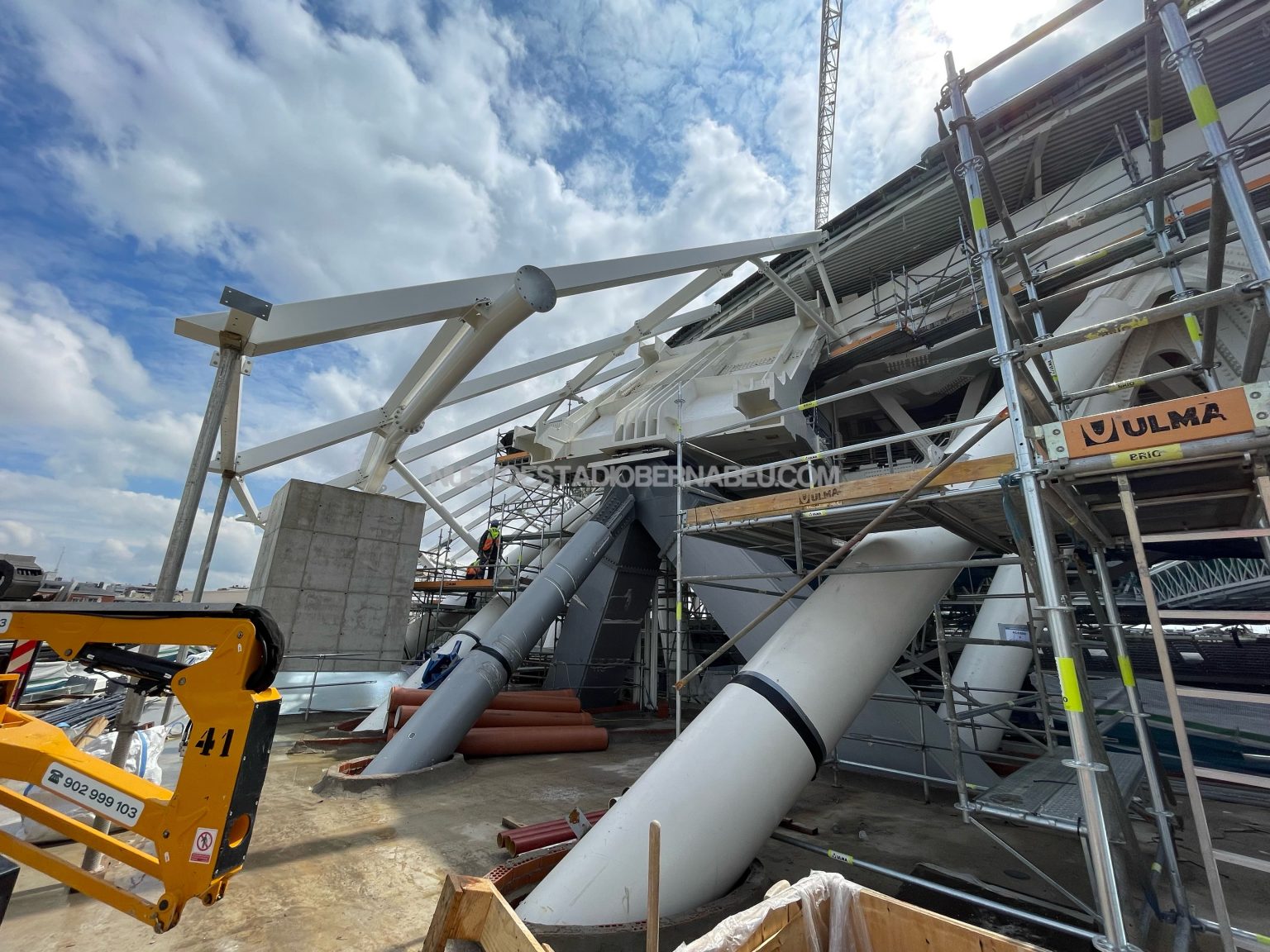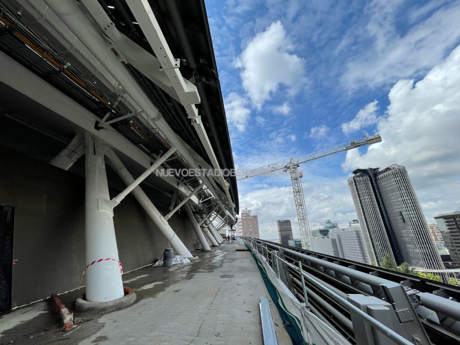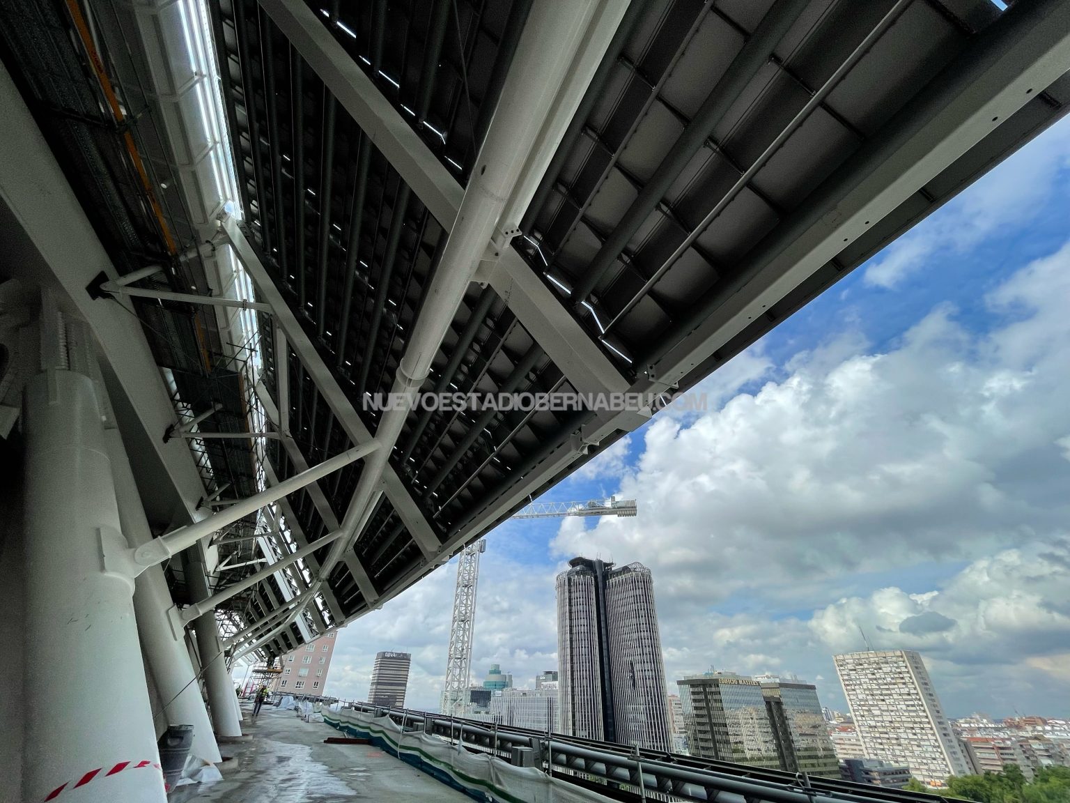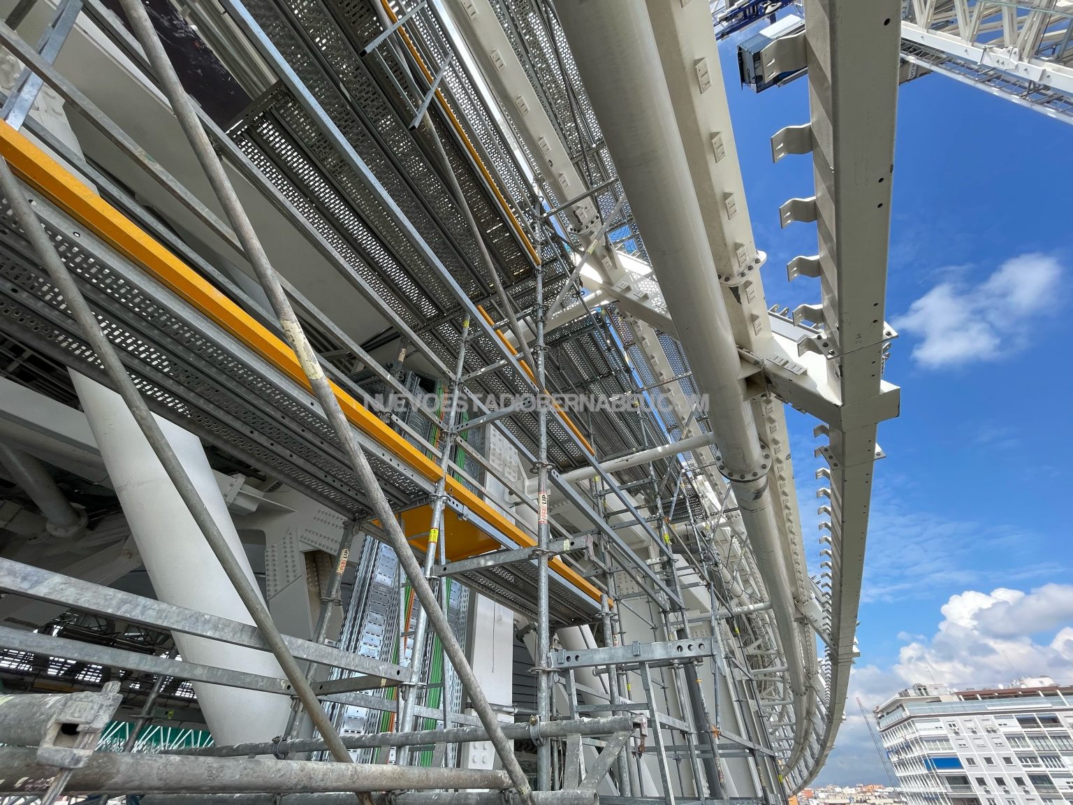 Uno de los aspectos más destacados de la transformación del nuevo Bernabéu es el impresionante Skywalk. La terraza perimetral sigue quemando etapas y en cada visita a las obras, se puede apreciar cómo va tomando forma día a día. El equipo de construcción ha estado trabajando para instalar la visera de lamas, un elemento de la estructura de cubierta que no solo agrega un toque estético impresionante, sino que también cumple la función de proporcionar sombra y protección contra los elementos.