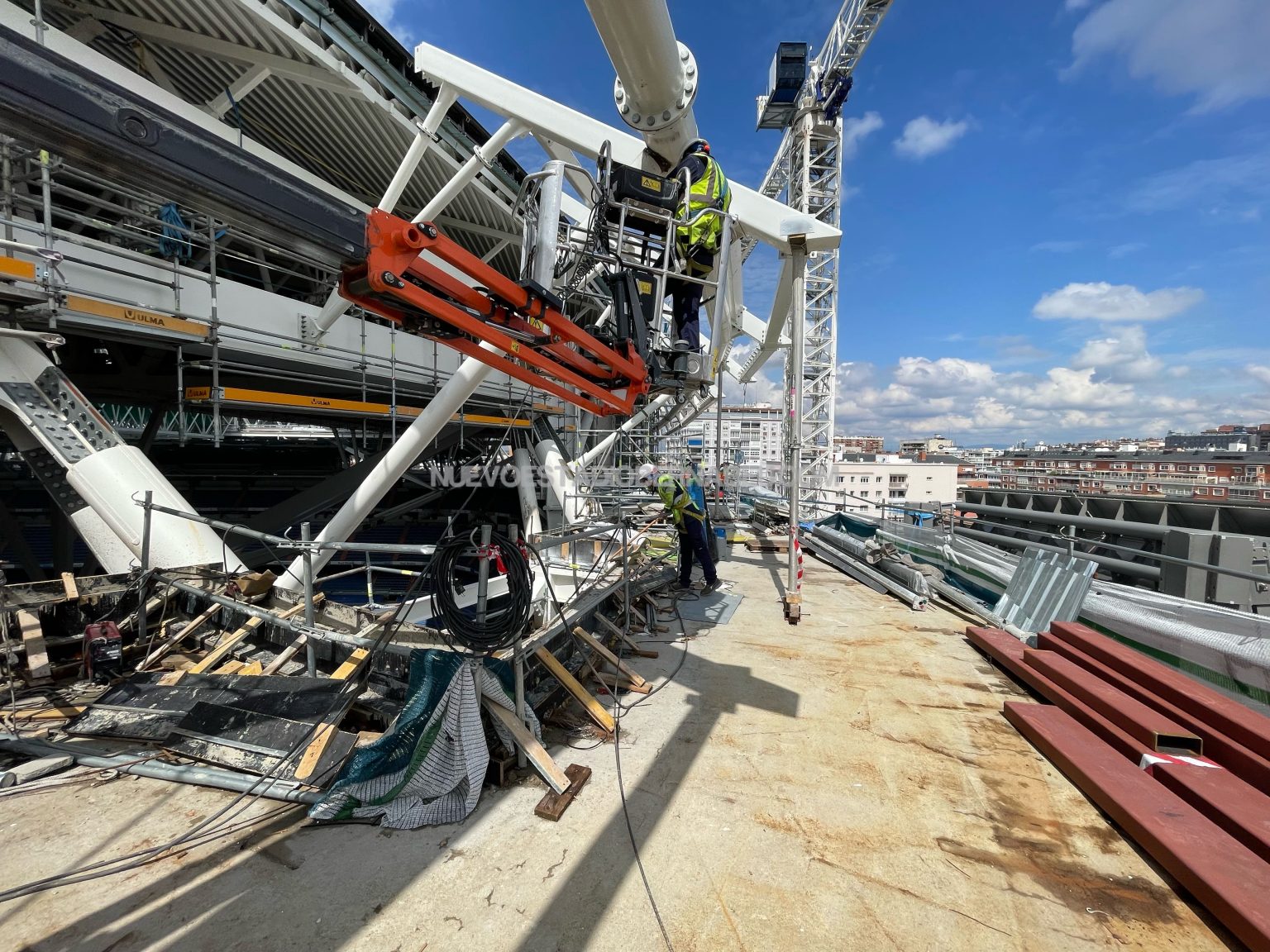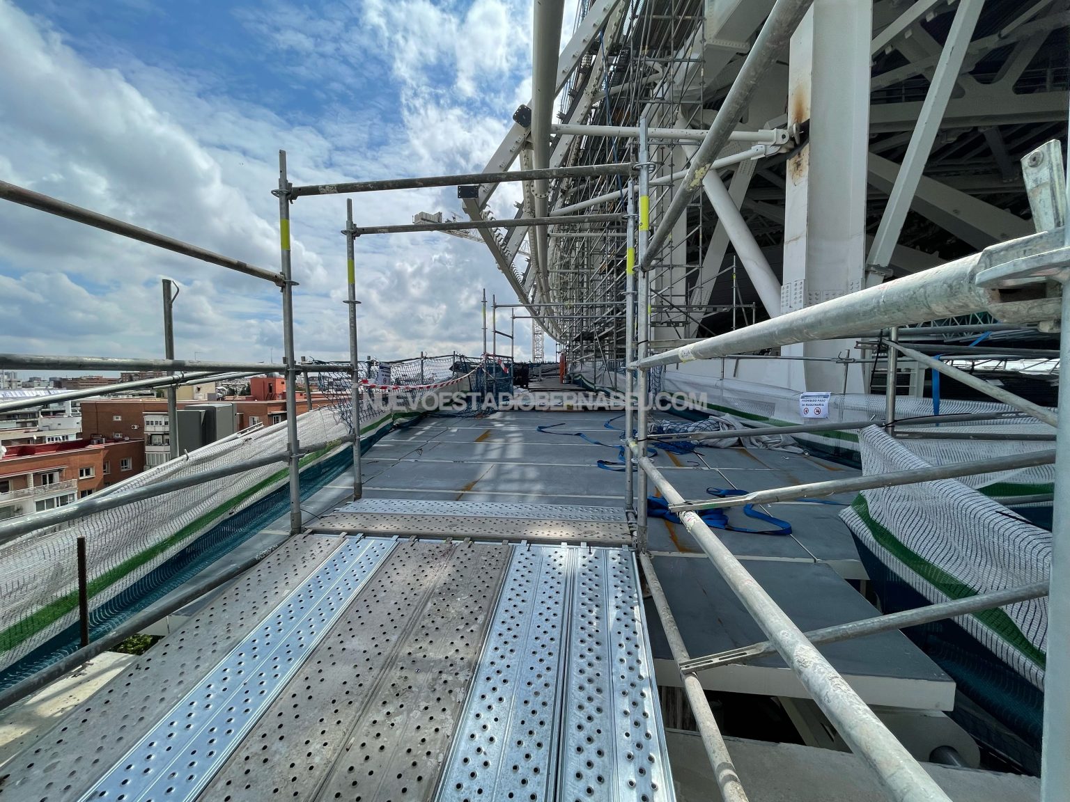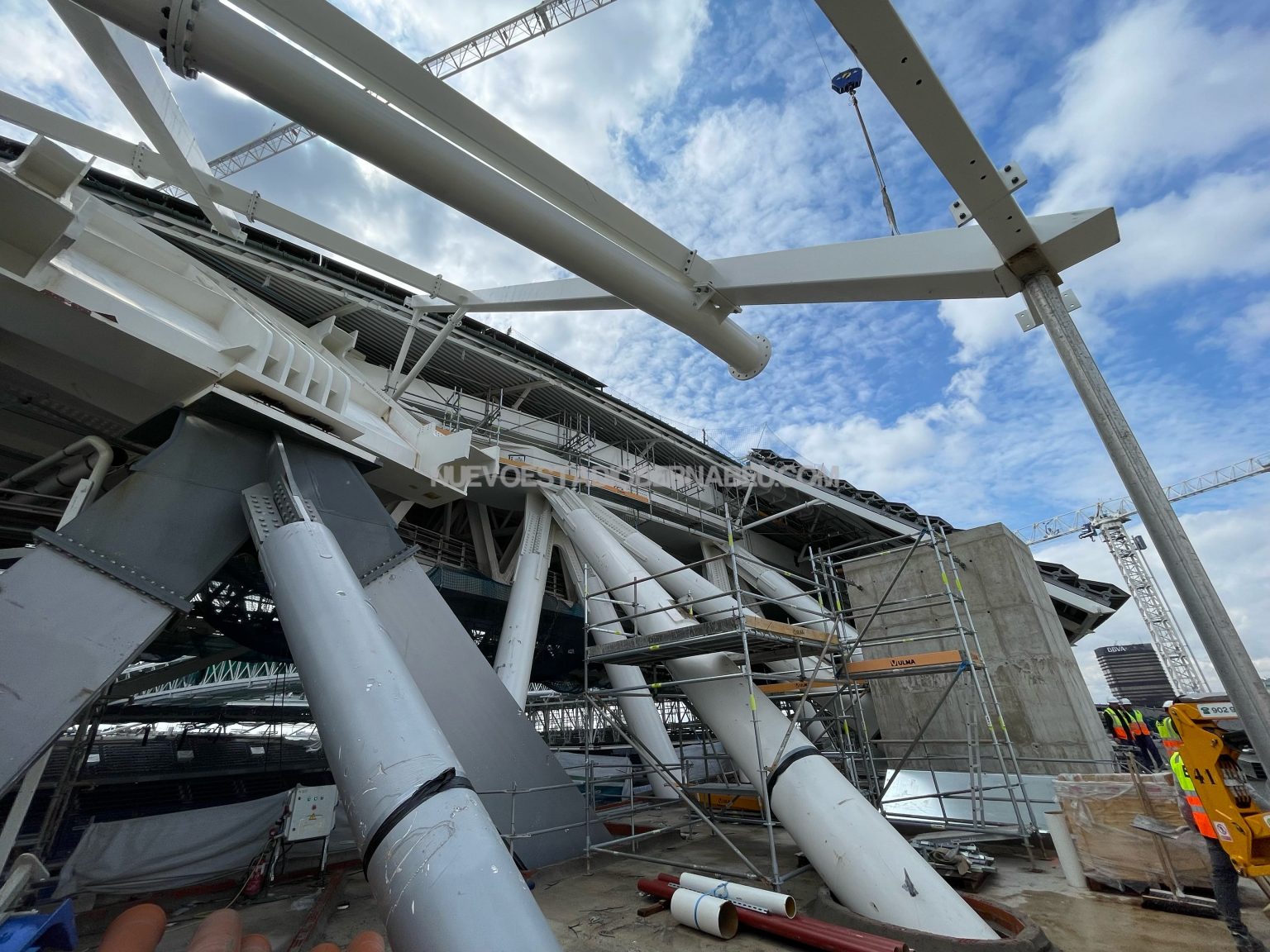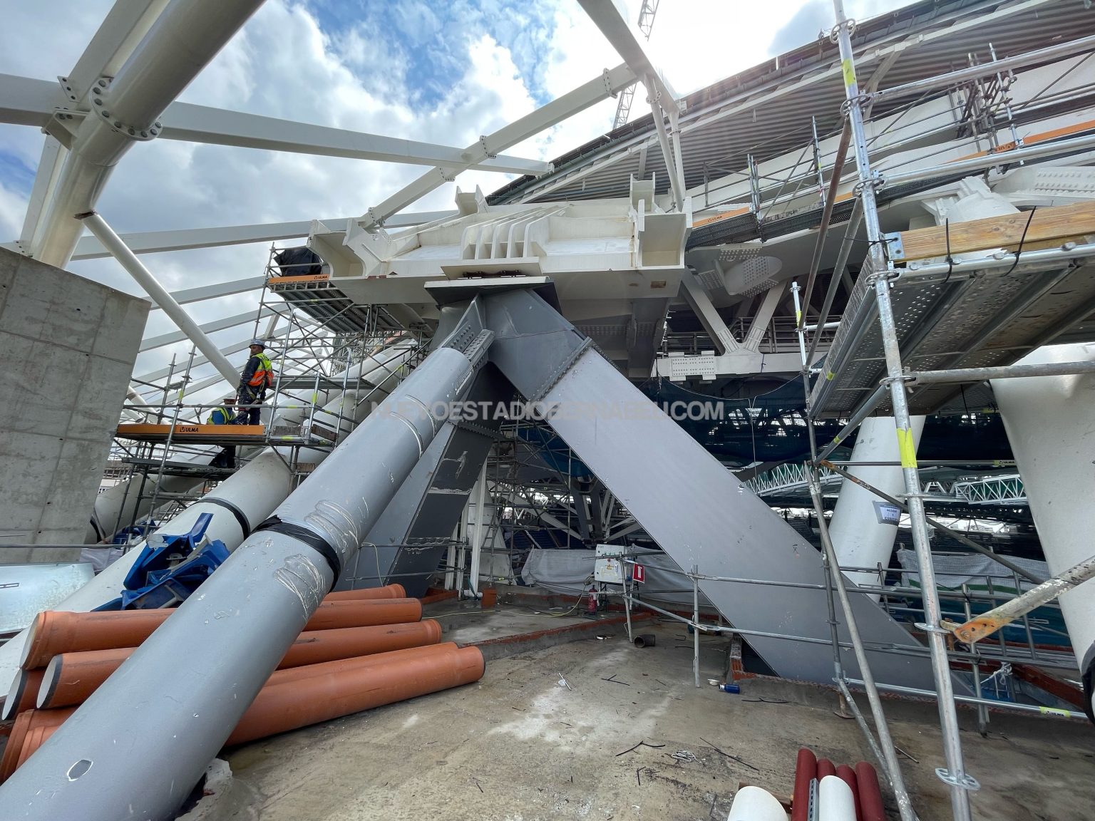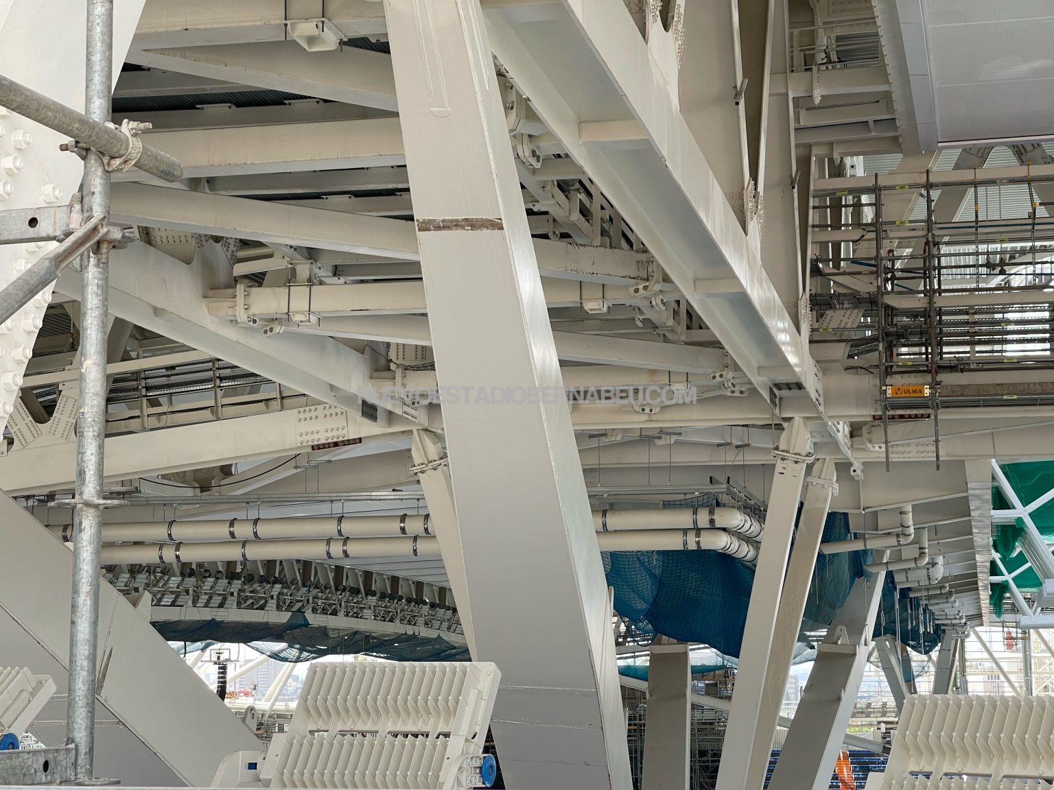 Uno de los aspectos más destacados de la transformación del nuevo Bernabéu es el impresionante Skywalk. La terraza perimetral sigue quemando etapas y en cada visita a las obras, se puede apreciar cómo va tomando forma día a día. El equipo de construcción ha estado trabajando para instalar la visera de lamas, un elemento de la estructura de cubierta que no solo agrega un toque estético impresionante, sino que también cumple la función de proporcionar sombra y protección contra los elementos.