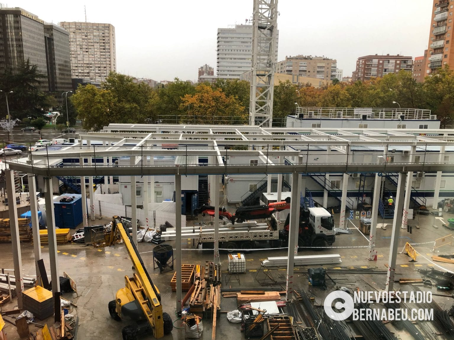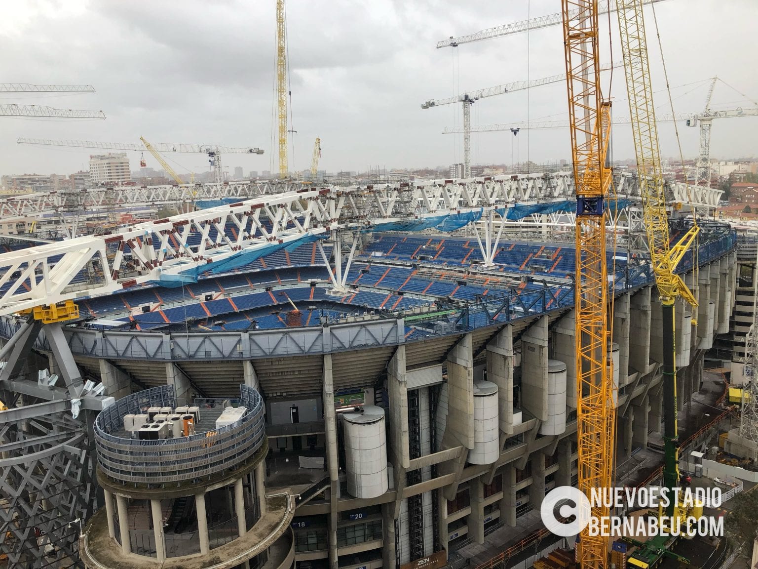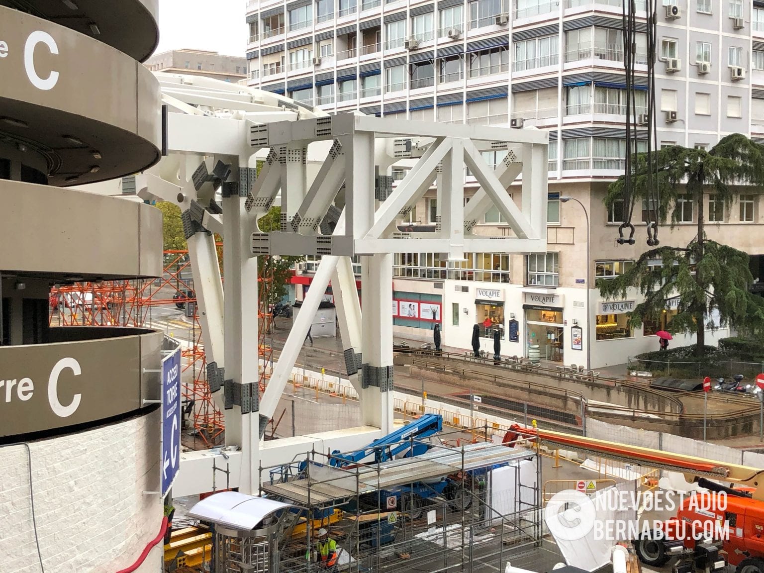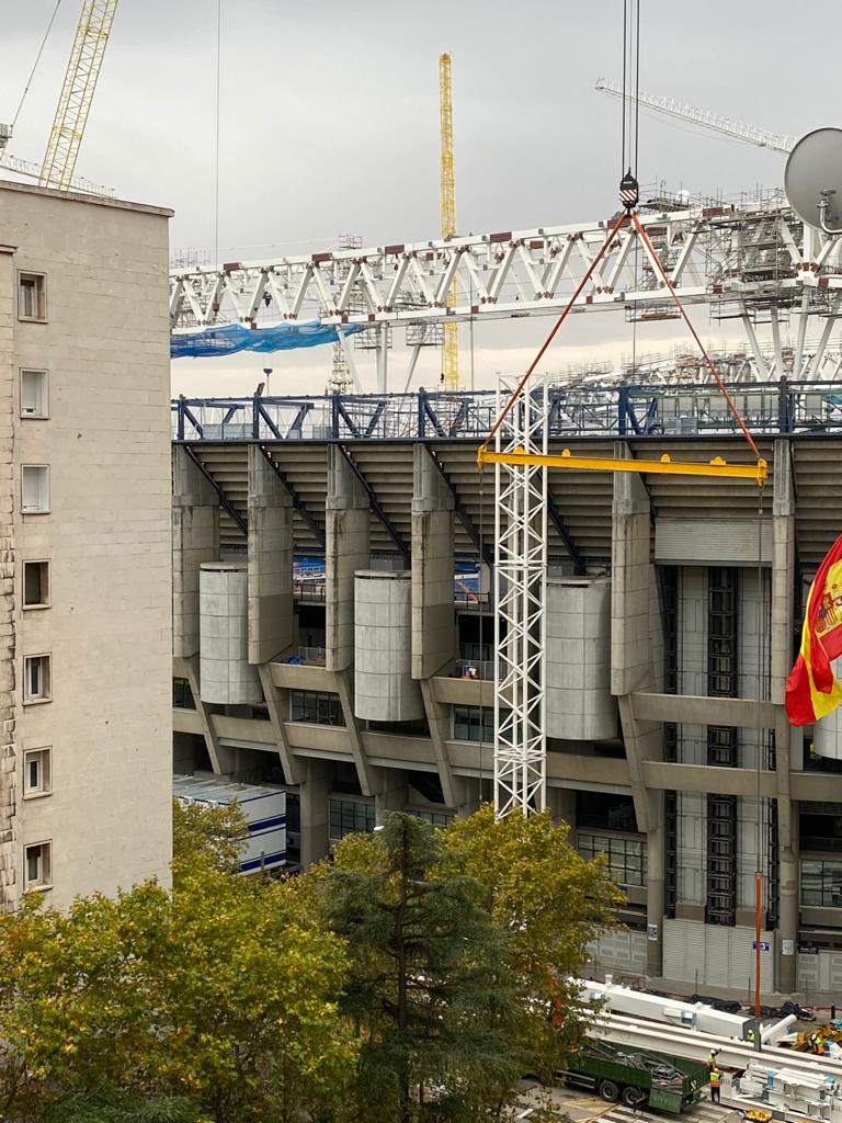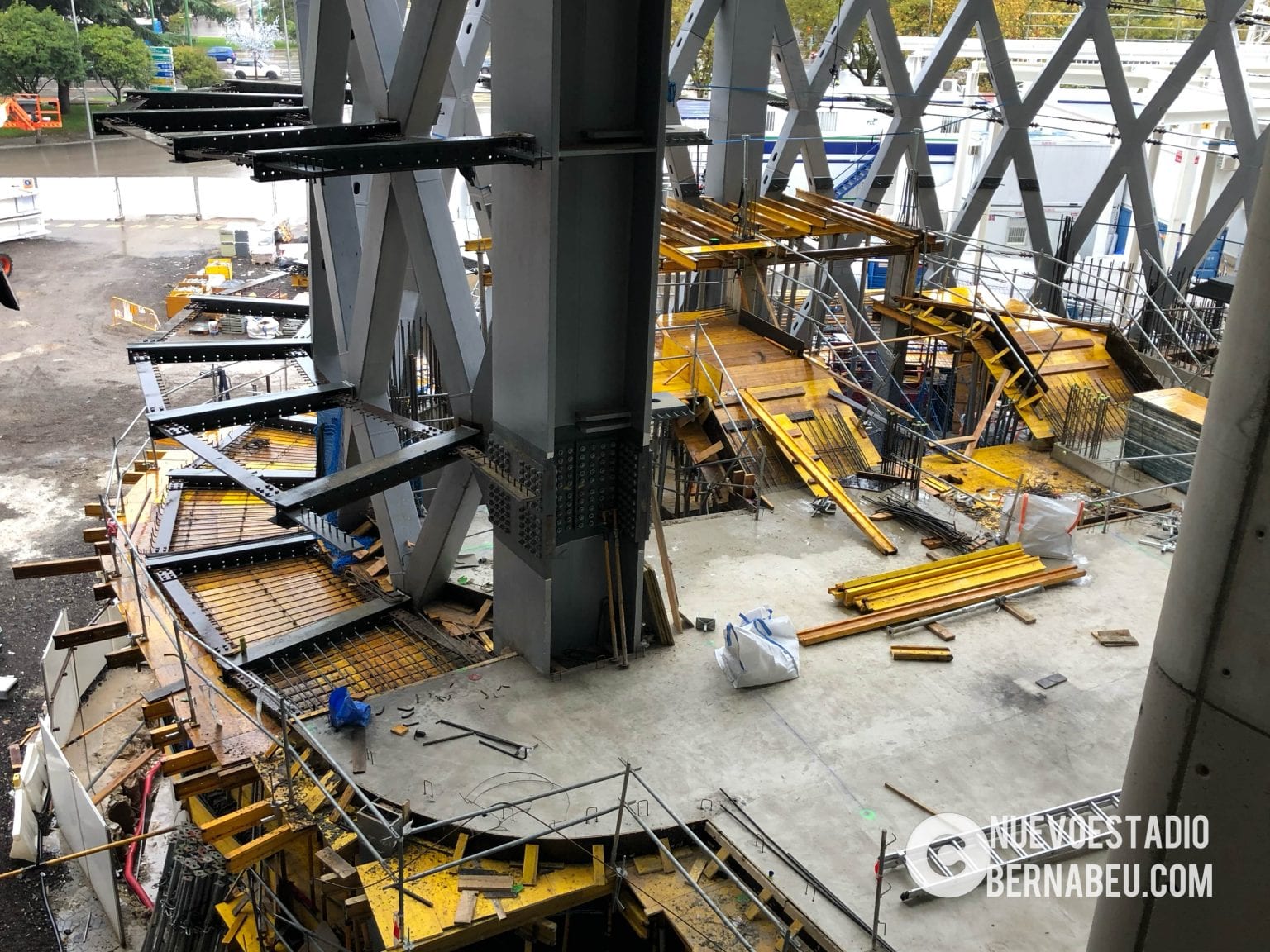 Semana muy lluviosa y ventosa en Madrid que no ha sido óbice para que la continuidad de las obras del nuevo Bernabéu continúe con paso firme y sin mayores contratiempos.