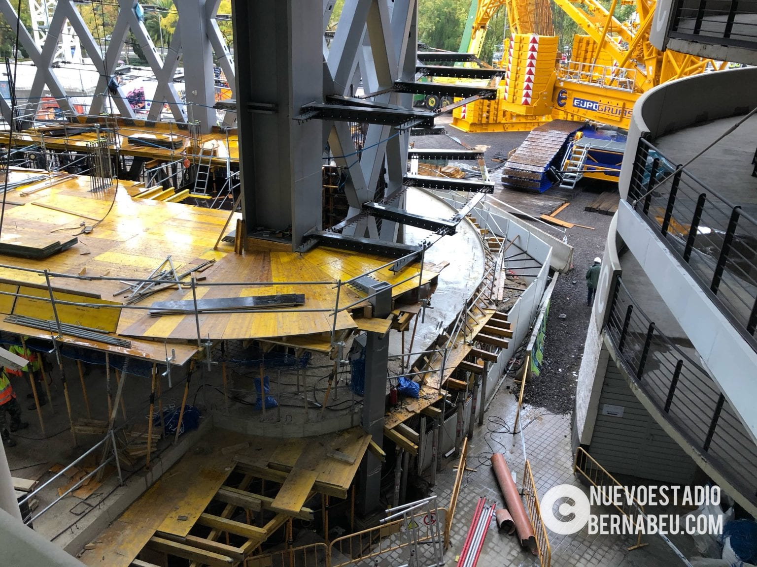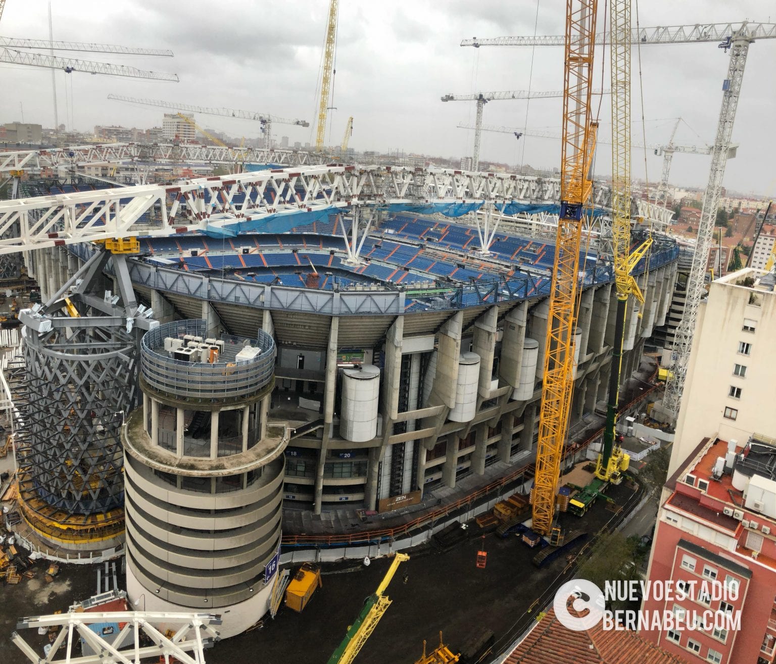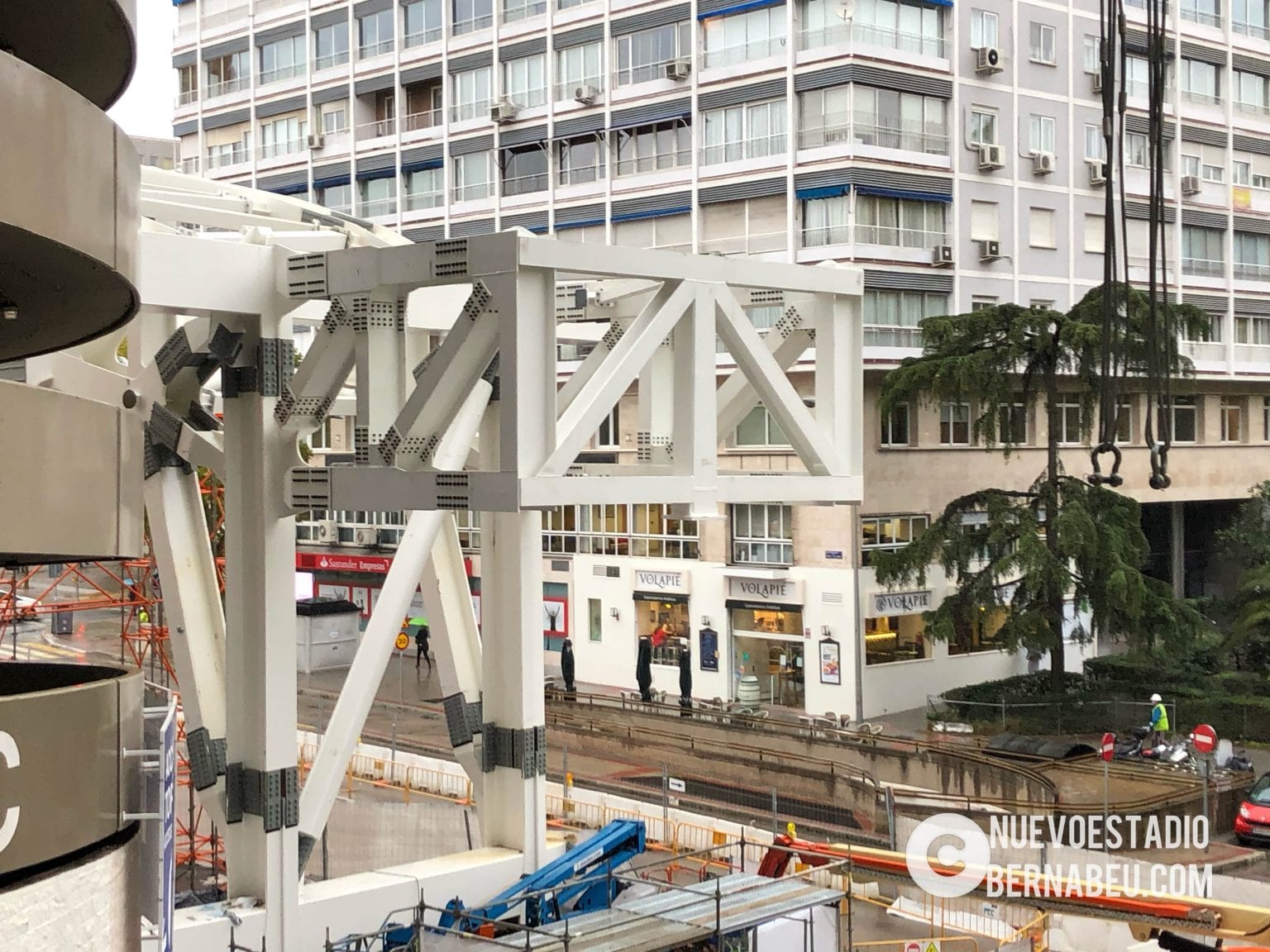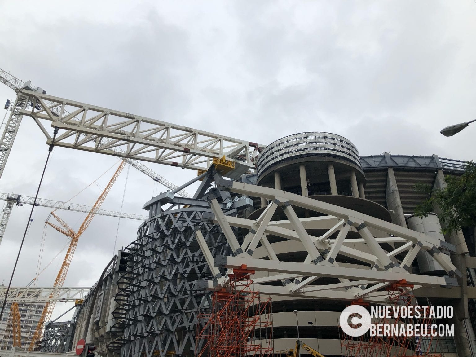 Semana muy lluviosa y ventosa en Madrid que no ha sido óbice para que la continuidad de las obras del nuevo Bernabéu continúe con paso firme y sin mayores contratiempos.