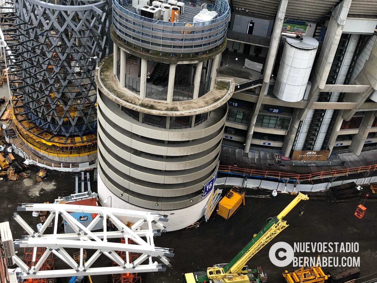 En el lateral este continúan los trabajos en las tres fases del nuevo parking, estando avanzada la fase 1 hasta el nivel -1. Mientras las fases 2 y 3, que empezaron mucho más tarde, avanzan sin novedad contemplando la demolición y desmontaje de la fachada este.