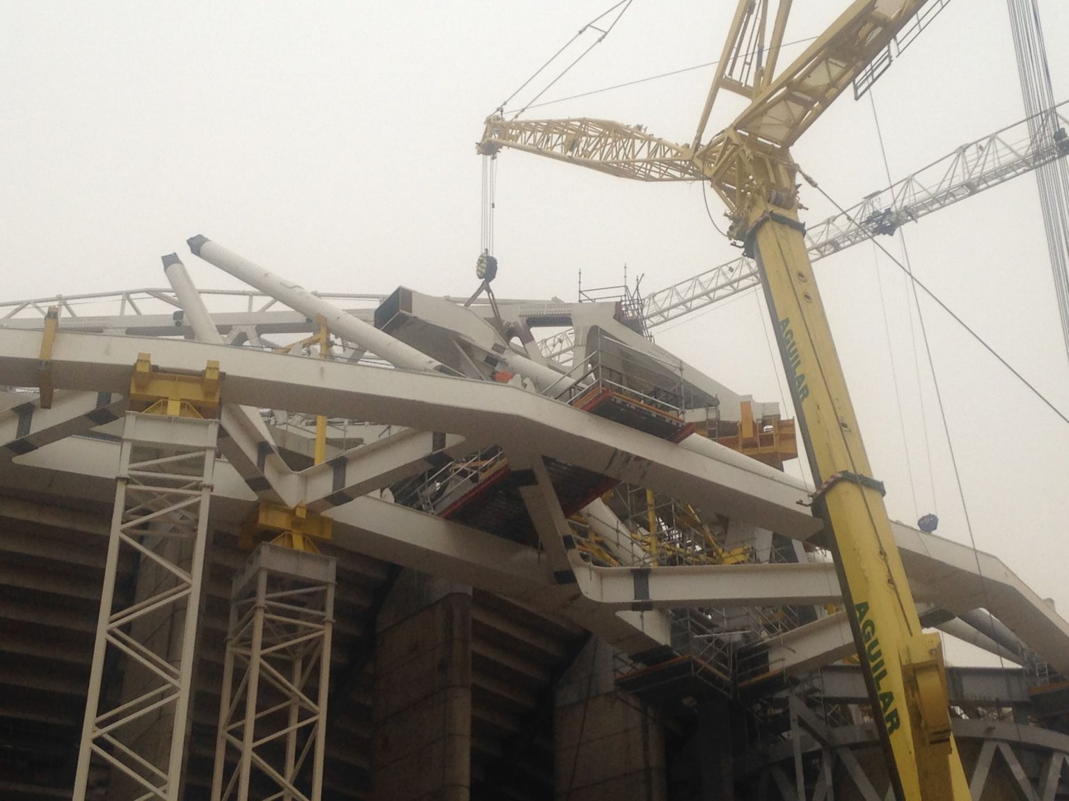 En la estructura de cubierta y próxima fachada del lateral oeste, con la prolongación de forjados a niveles 3, 4 y 5 se trabaja en la esquina noroeste en sentido torre C con el izado de cordones del cajón perimetral y montaje de tubulares con el consiguiente montaje de atados y tubos. Para todo esto se ha estado utilizando sendas grúas de 500 y 350 toneladas respectivamente.