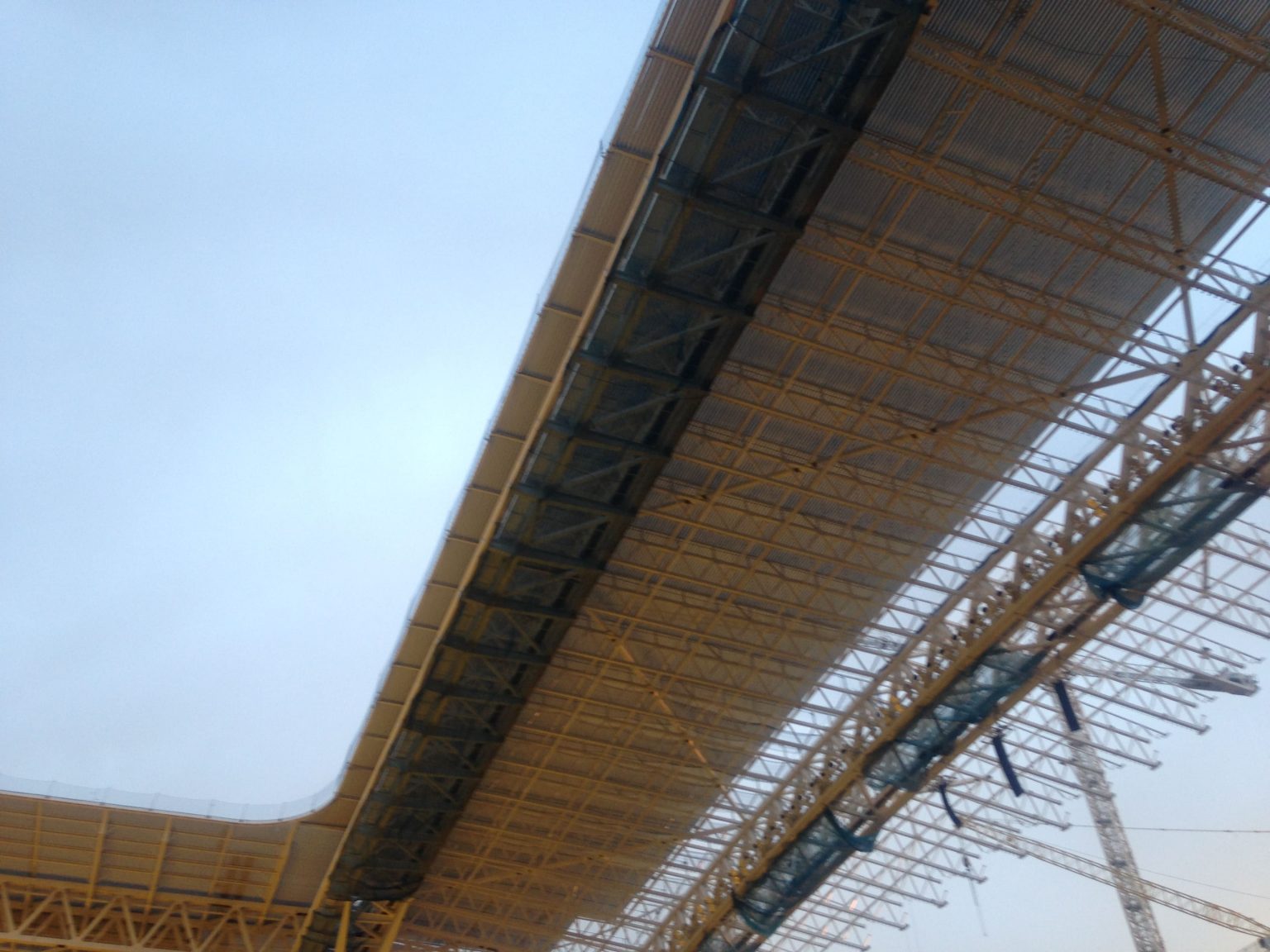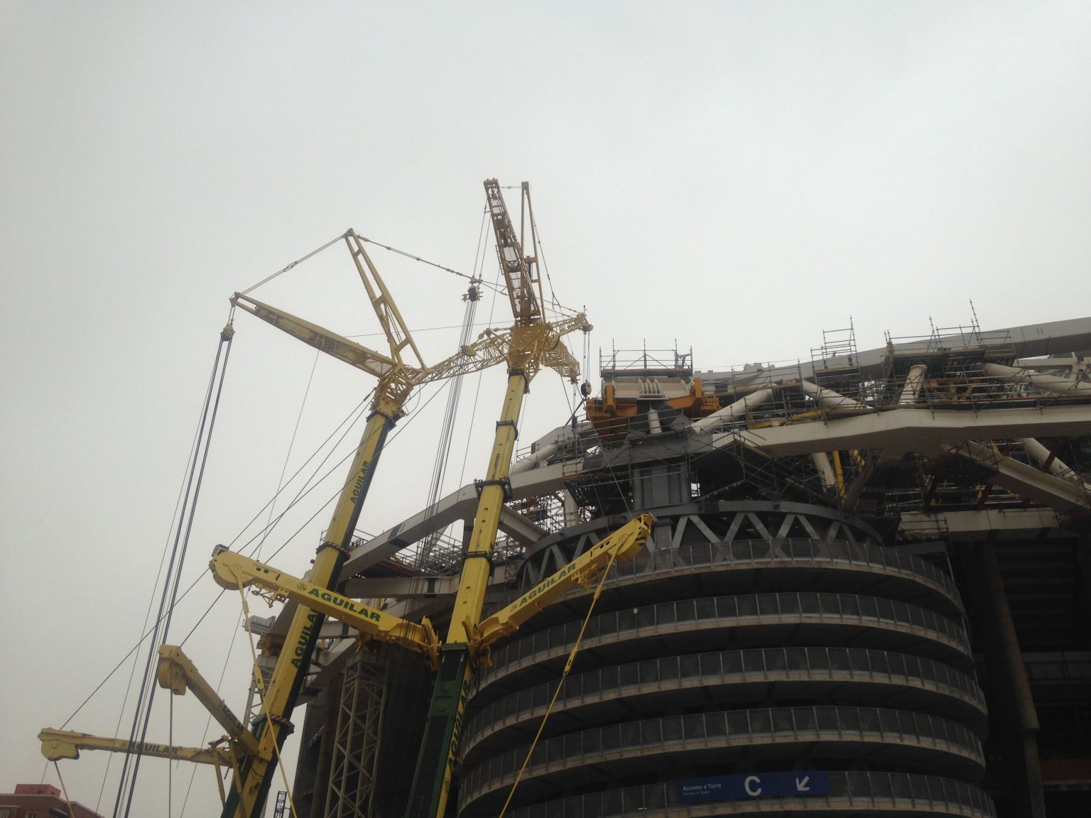 Se trabaja en la instalación de canalización de pluviales de las cubiertas norte y sur y sus bajantes hacia los patinillos de los torreones del lateral este. Se trabaja en el montaje de canalización de pluviales de la cercha de rodadura oeste (cubierta retráctil) y se trabaja en el anillo de gas de los calefactores de la cercha oeste y en el cableado y cajas de calefactores de la pasarela de la cercha de rodadura este. La cubierta retráctil se está fabricando en las empresas Nanotures (celosía) e Inbersa (cerchas) con el taladrado de Jupasa. Se prevé que para después de Semana Santa se puedan iniciar las maniobras de izado de cerchas de la cubierta retráctil la cual se está acondicionando previamente con el montaje de montaje grapas y railes en cercha de rodadura este y el montaje de grapas en la cercha de rodadura oeste.