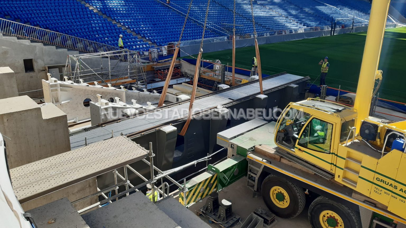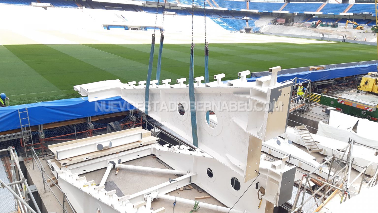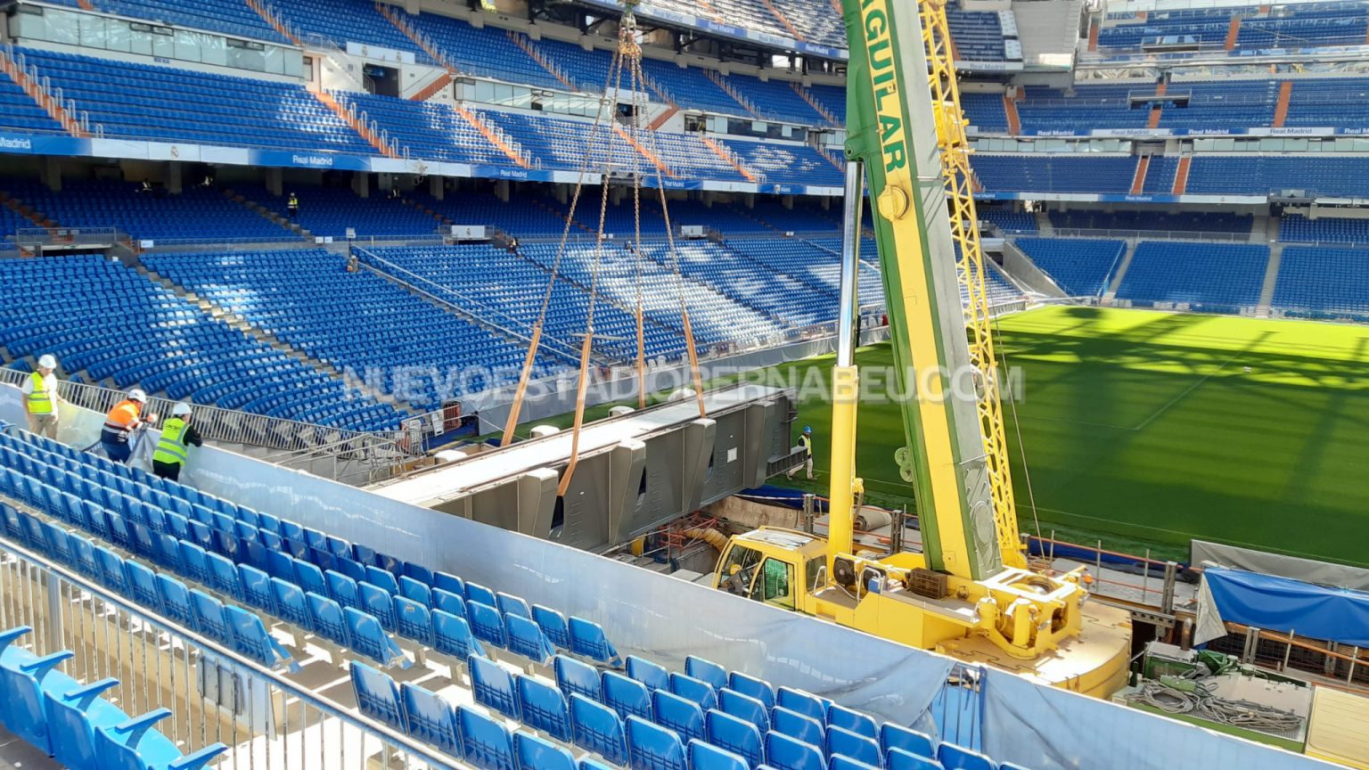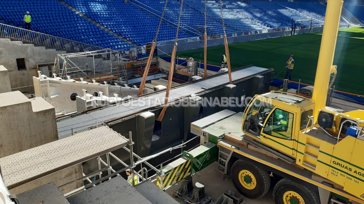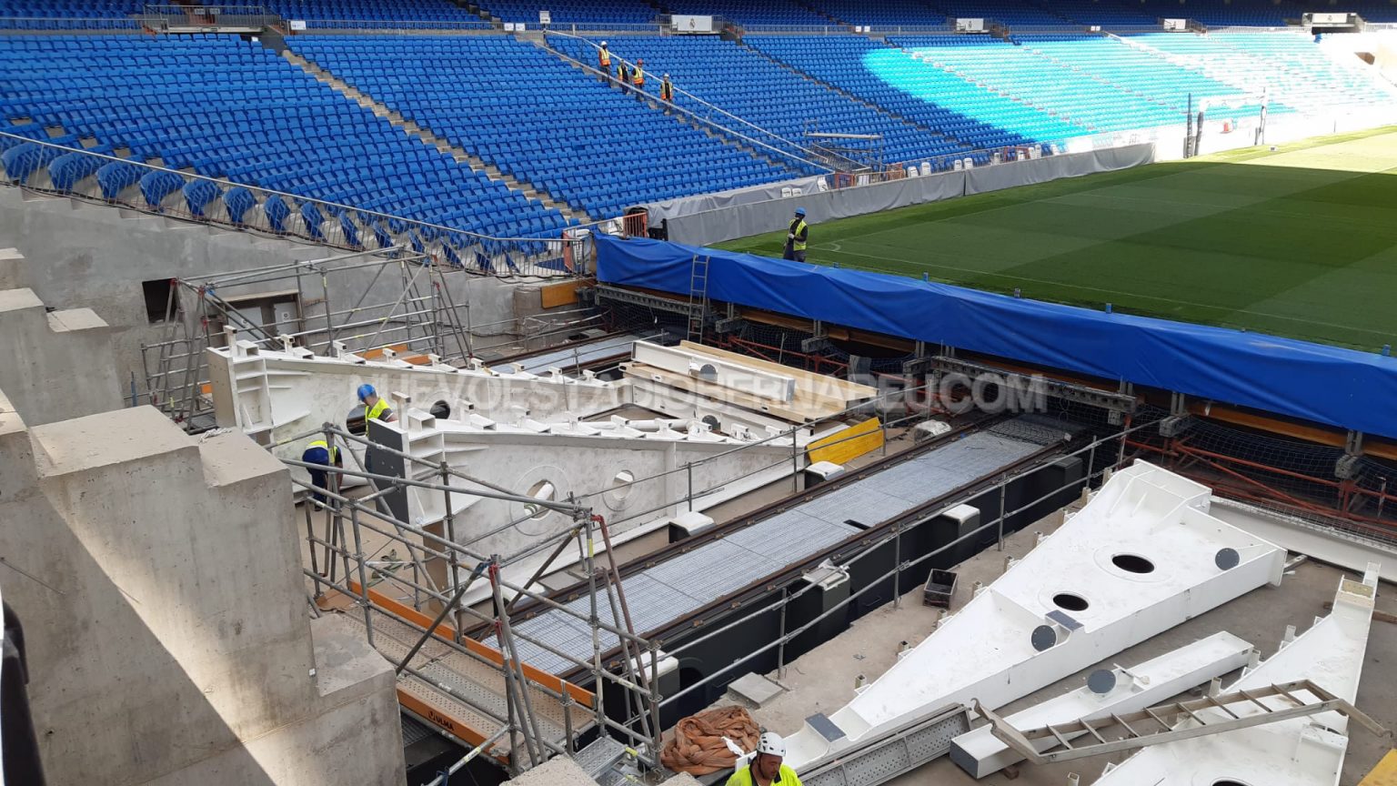 Aun así, durante esta semana se ha apretado el acelerador en lo que es una de las grandes actuaciones de las próximas semanas. Se han comenzado a instalar las celosías retráctiles en las cajeras que forman parte del invernadero del futuro césped mecanizado. Para ello se ha usado una grúa de 300 toneladas que se ha introducido en el bowl del Santiago Bernabéu por la puerta 36 continuando hasta el lateral oeste a través de una cimbra en rampa construida a tal efecto.