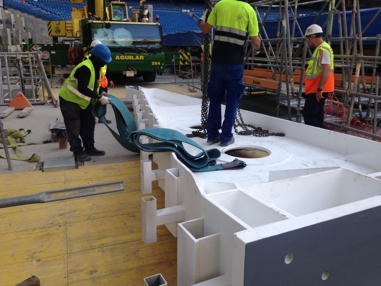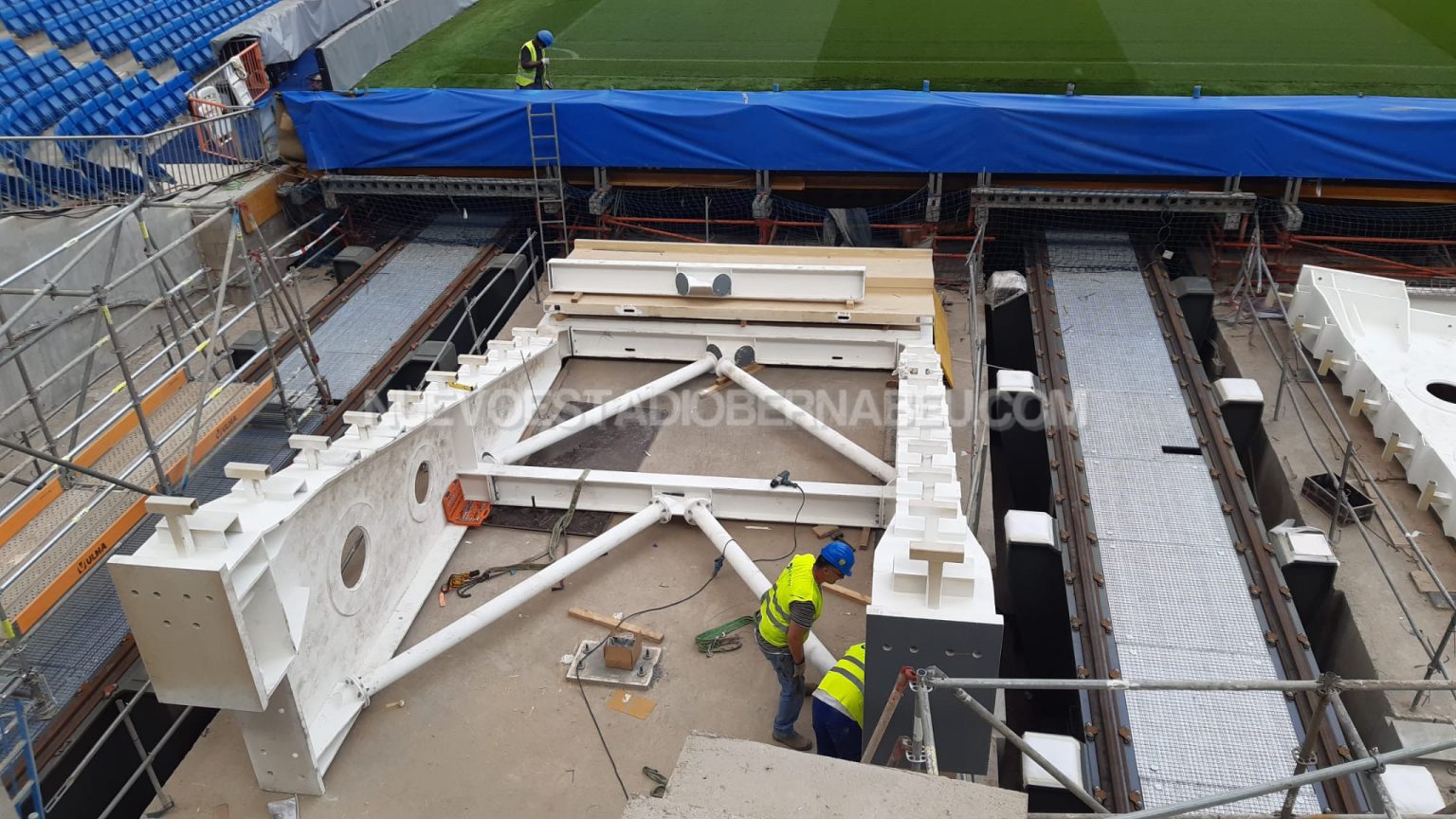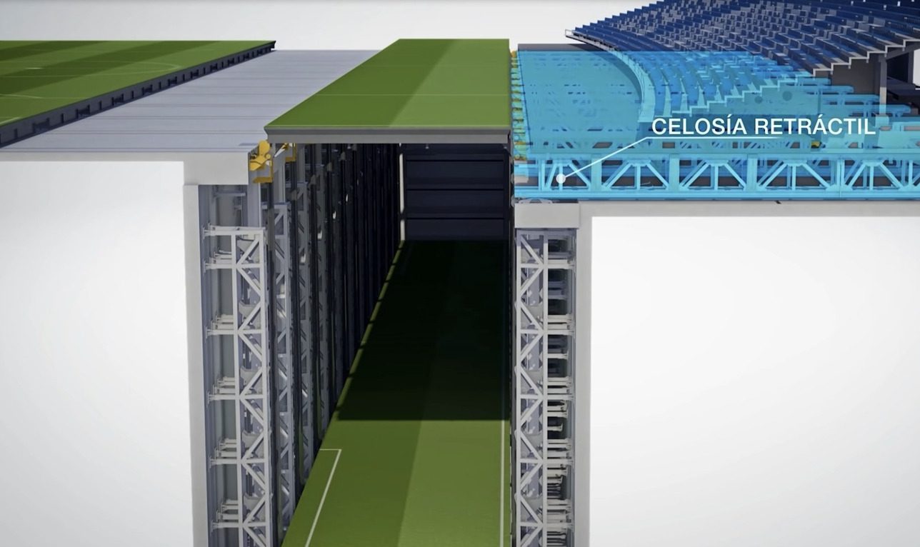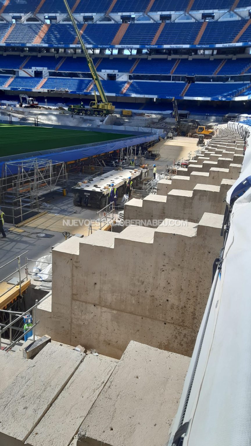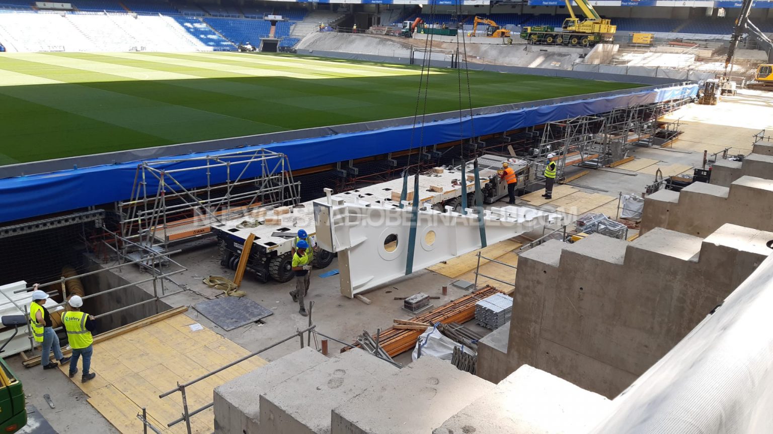 Aun así, durante esta semana se ha apretado el acelerador en lo que es una de las grandes actuaciones de las próximas semanas. Se han comenzado a instalar las celosías retráctiles en las cajeras que forman parte del invernadero del futuro césped mecanizado. Para ello se ha usado una grúa de 300 toneladas que se ha introducido en el bowl del Santiago Bernabéu por la puerta 36 continuando hasta el lateral oeste a través de una cimbra en rampa construida a tal efecto.