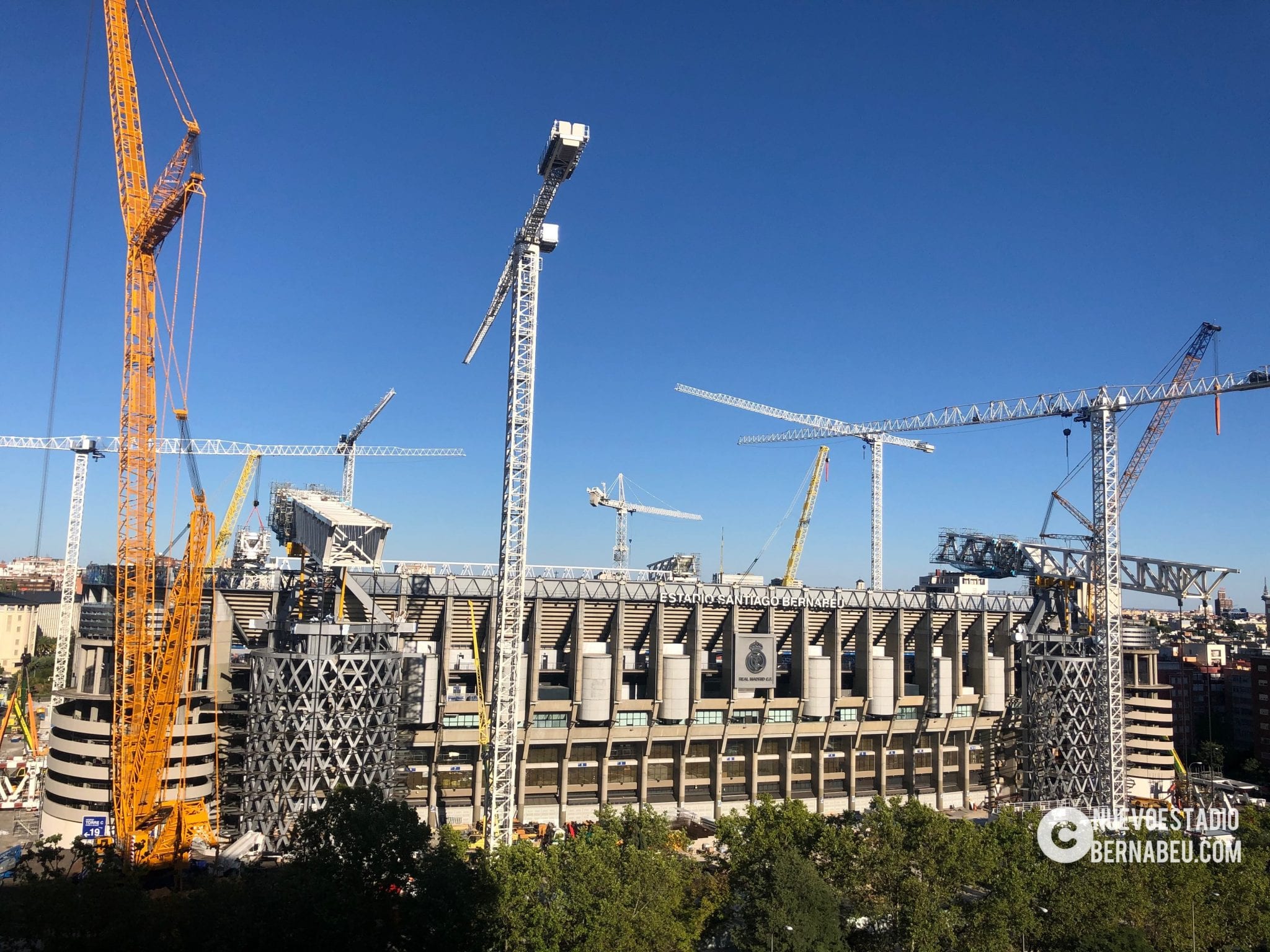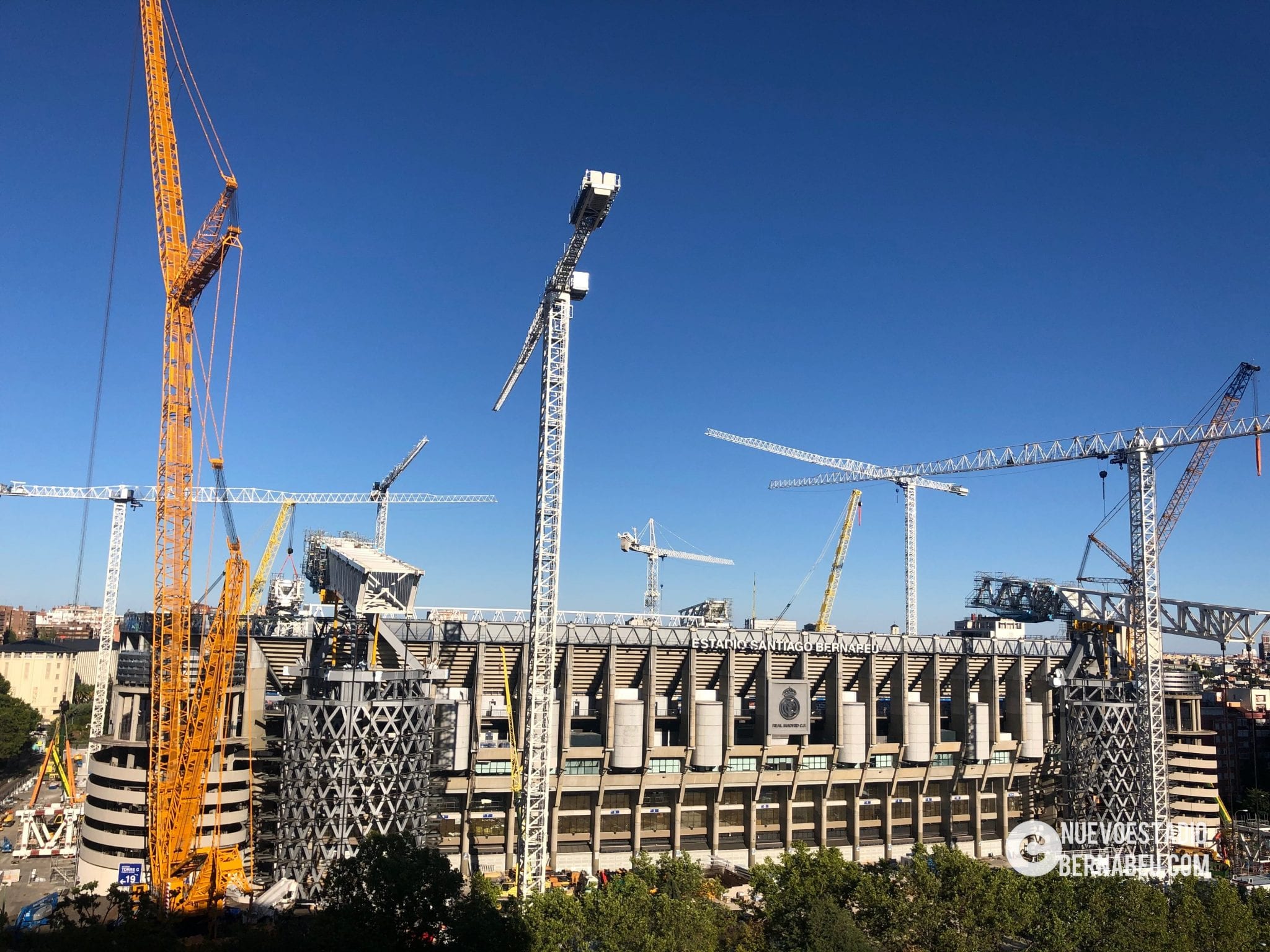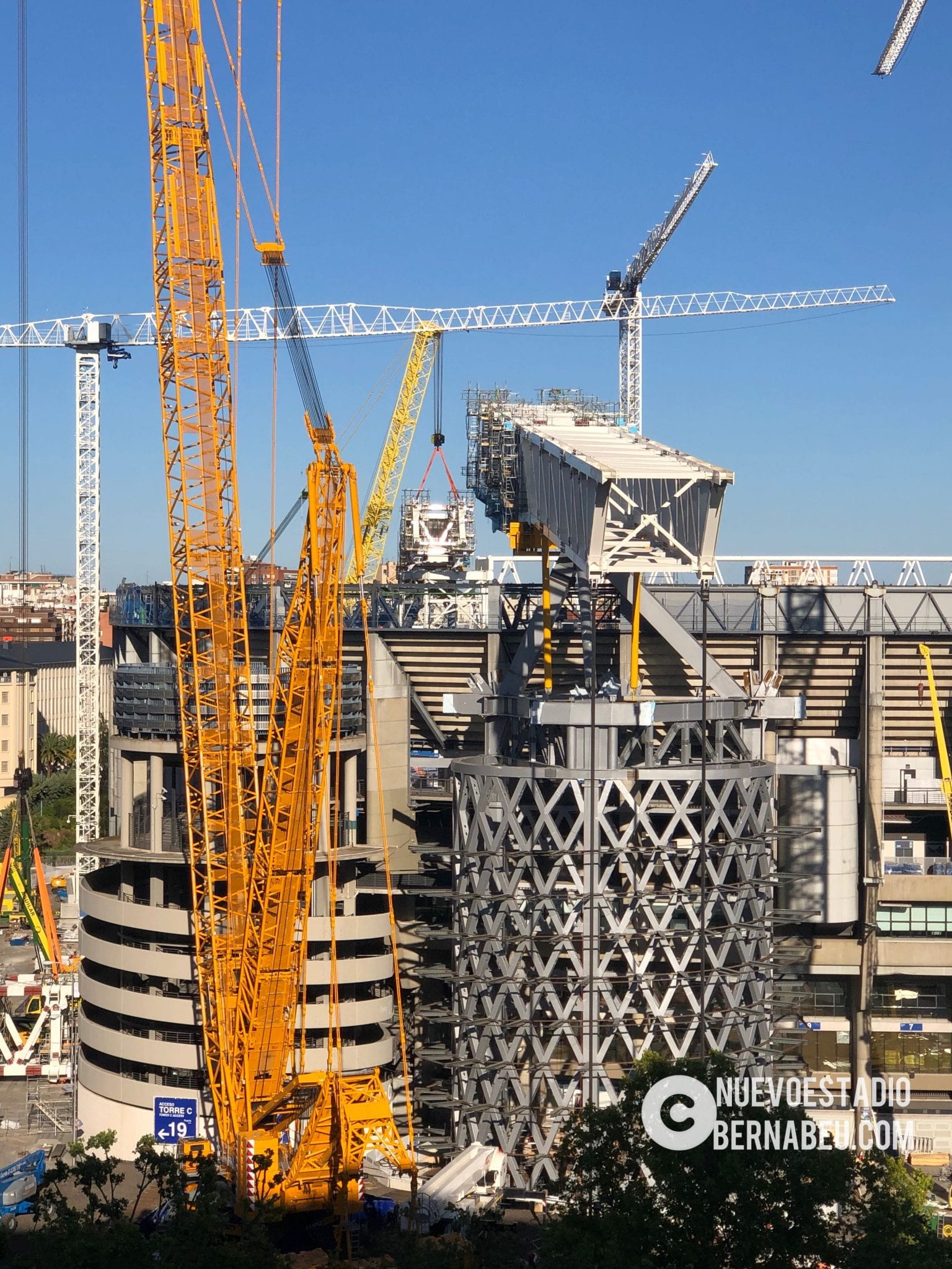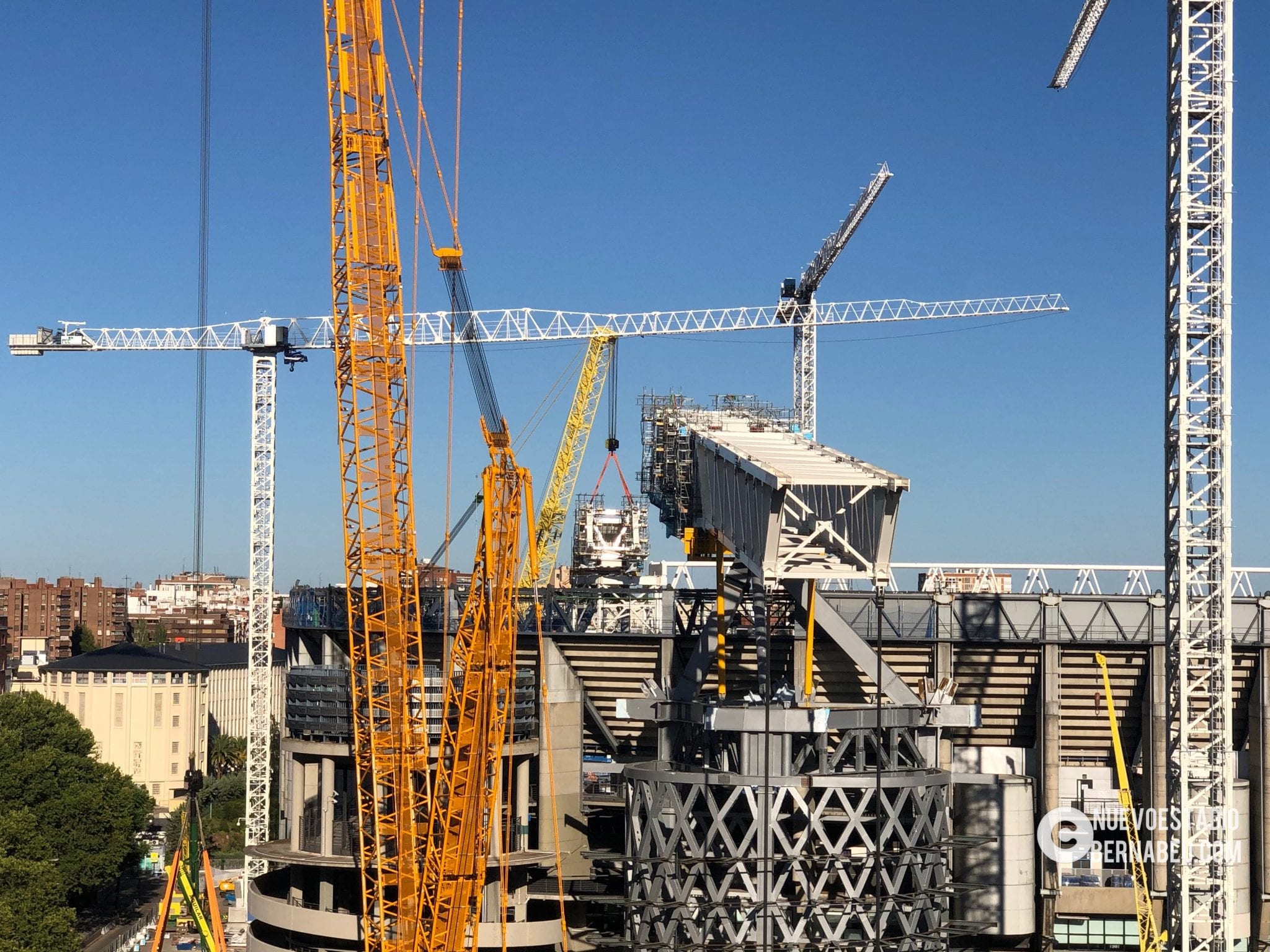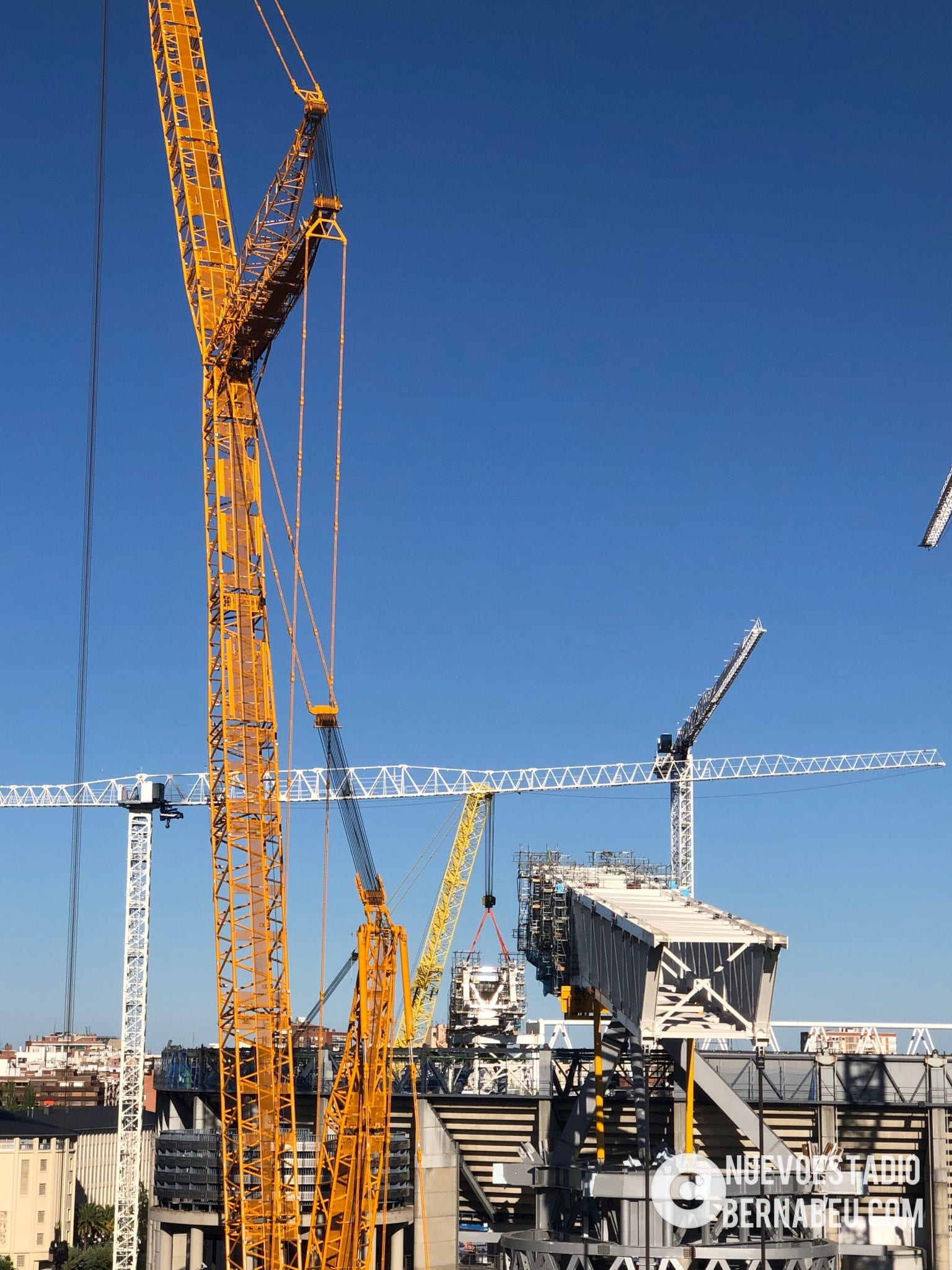 Y se nota, vaya si se nota. El avance en sentido oeste-este de las cerchas principales prosigue a buen ritmo con el anclaje de no menos de una decena de dovelas que se han ido sumando en la cercha norte y en la cercha sur que sustentará la cubierta del nuevo estadio Santiago Bernabéu.