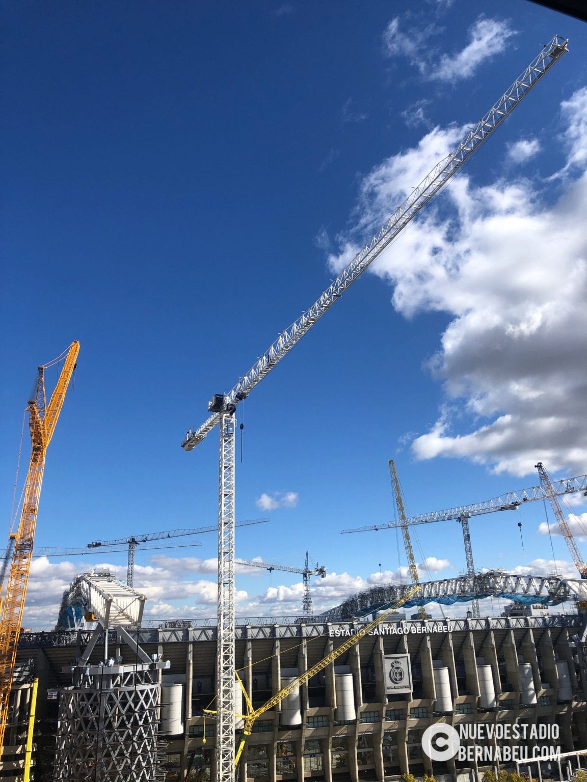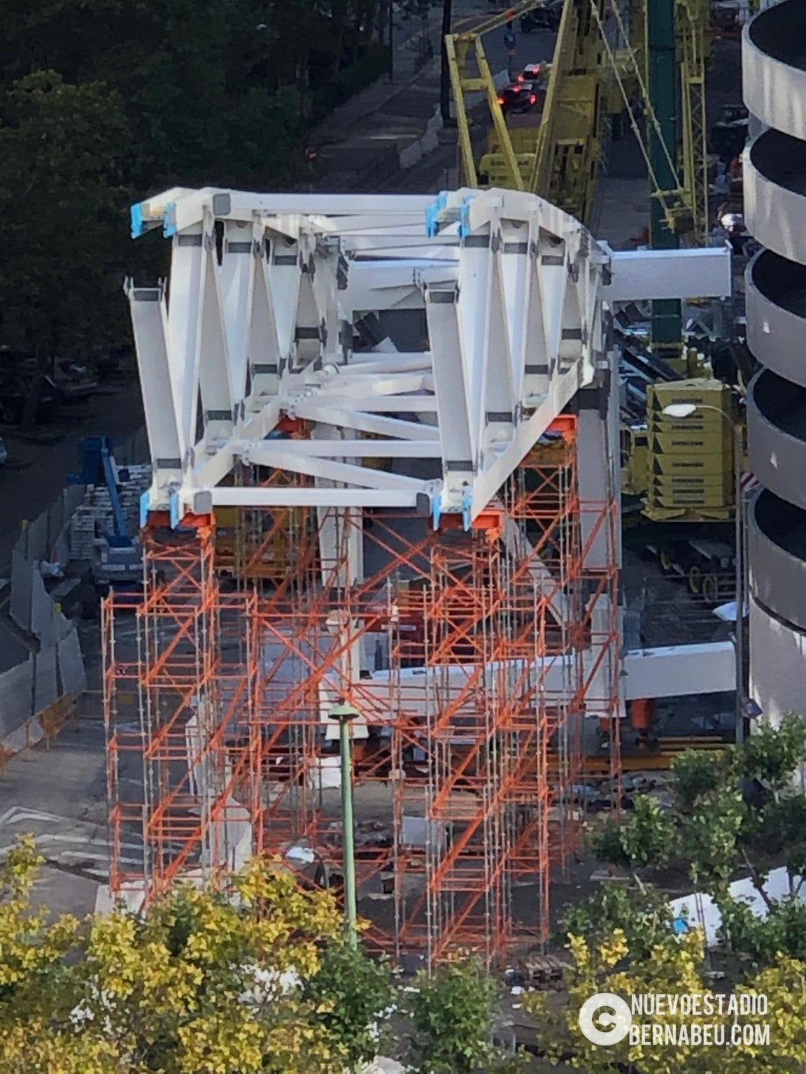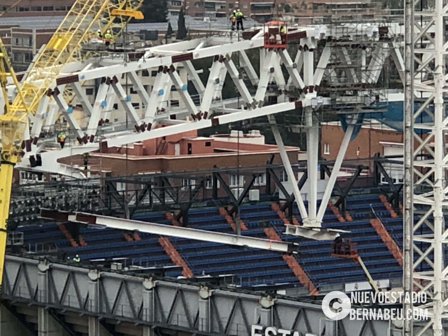 Una vez retirados los andamiajes de la cercha norte e izados y acoplados los 3 floreros se trabaja en el montaje de pasarelas en la viga atirantada y el acople del atirantado de la cercha (ver fotos). A su vez, y como veremos en la actualización del viernes, se trabaja en la preparación del izado de los 3 floreros de la cercha sur. Para dicho cometido se han dispuesto tres cimbrados en posiciones laterales y centrales sobre el fondo sur del estadio en las que se descolgarán 3 plataformas elevadoras móviles de personal (PEMP) que servirán de apoyo al izado y acople de los floreros sur.