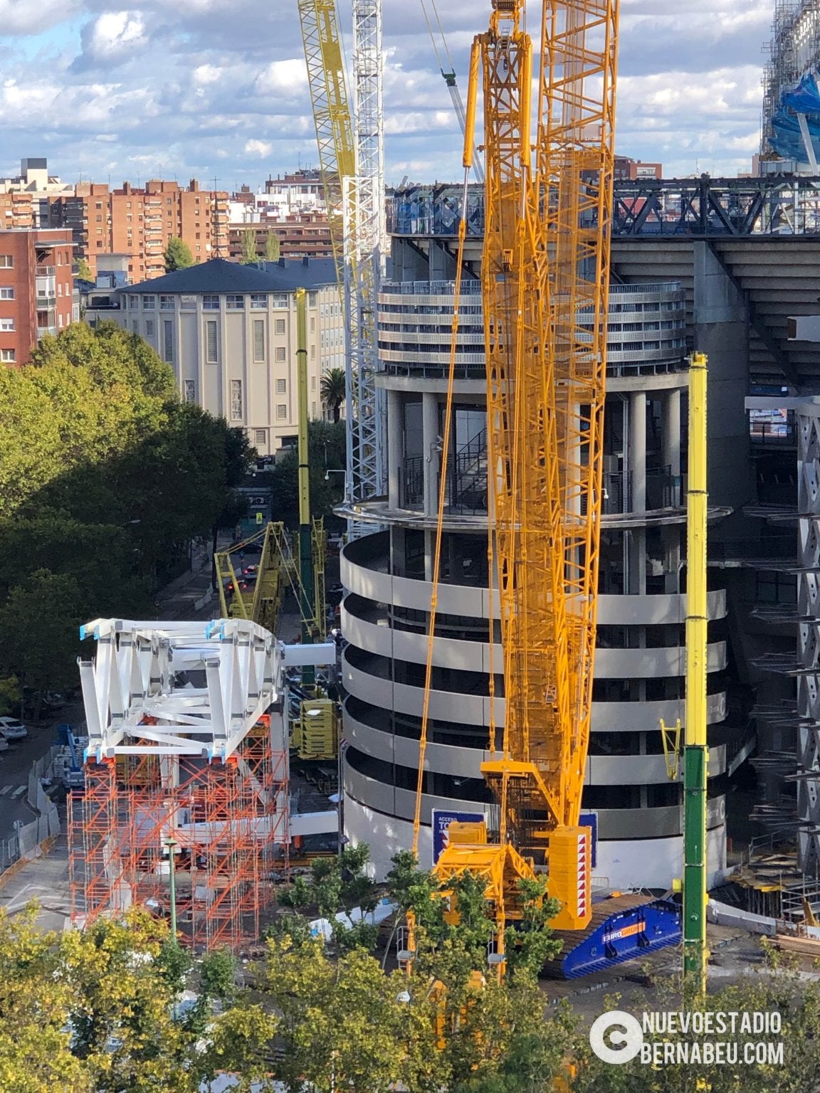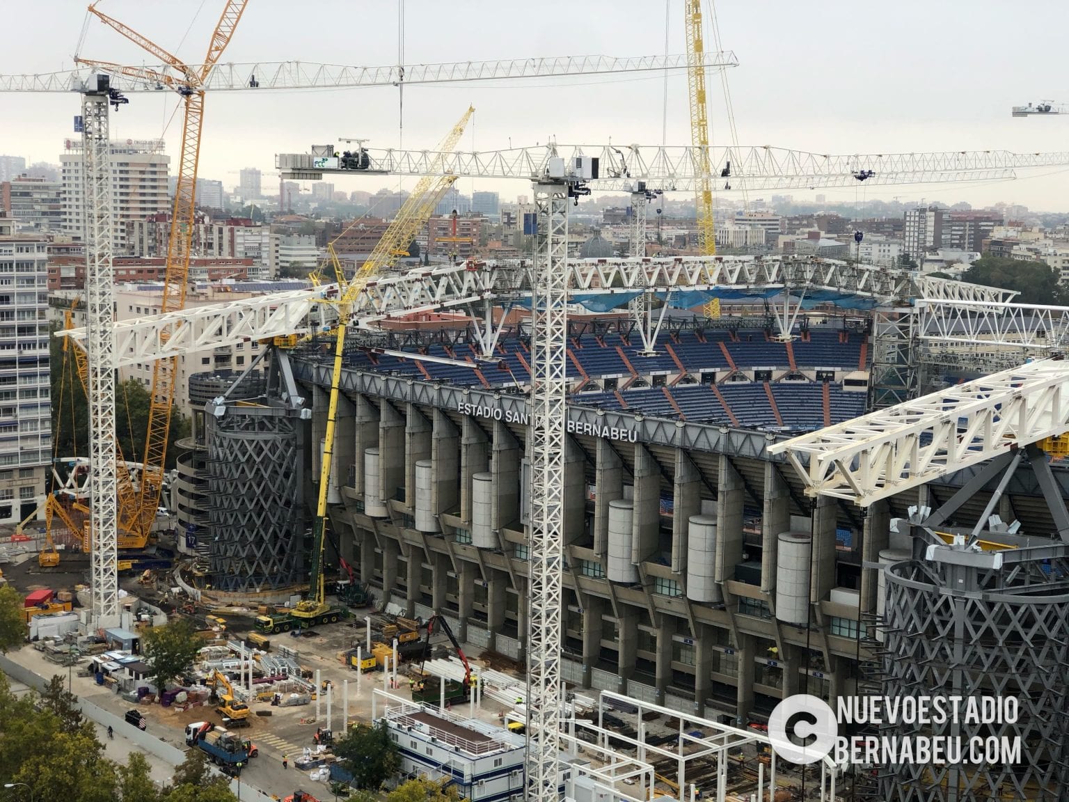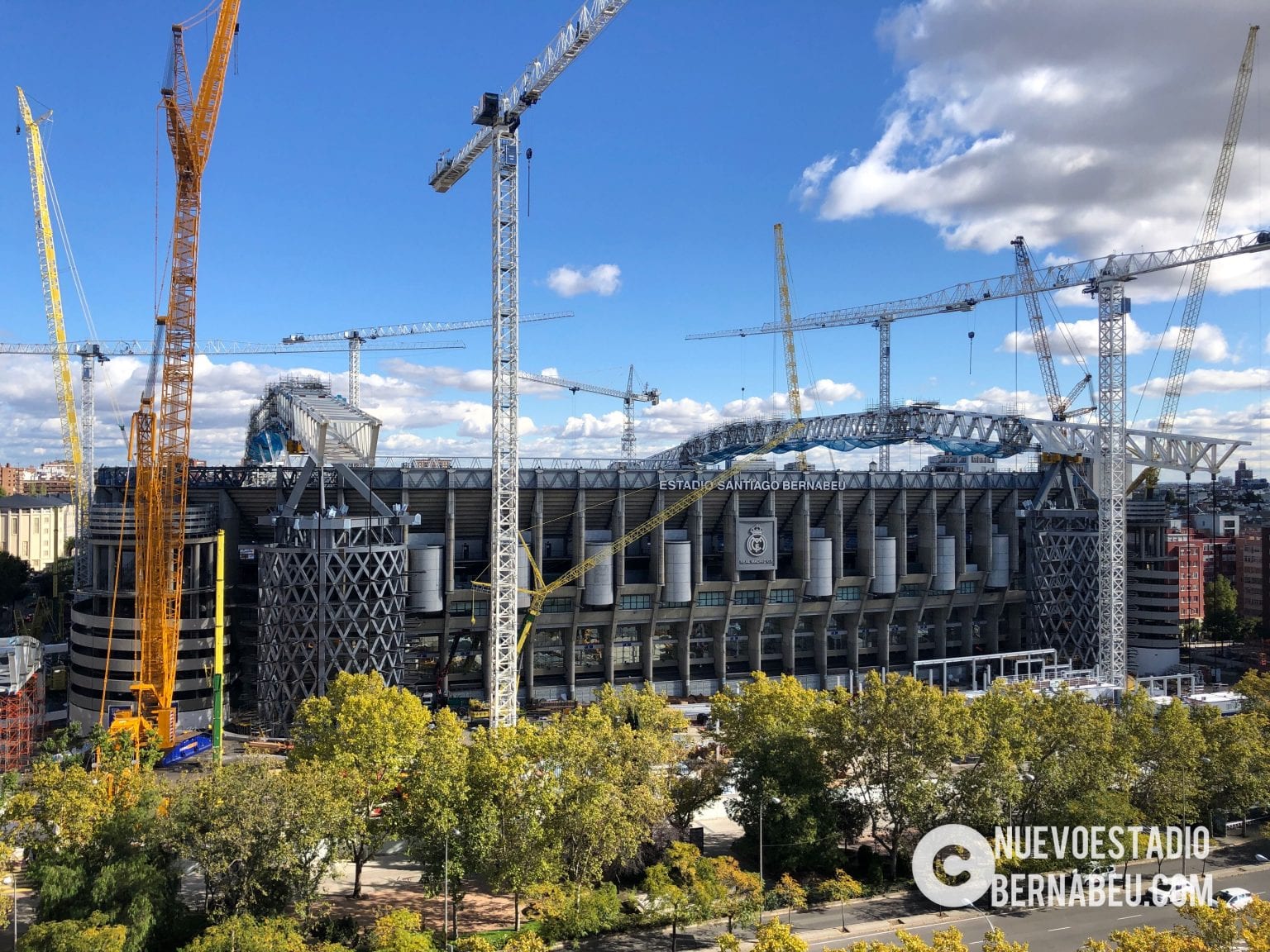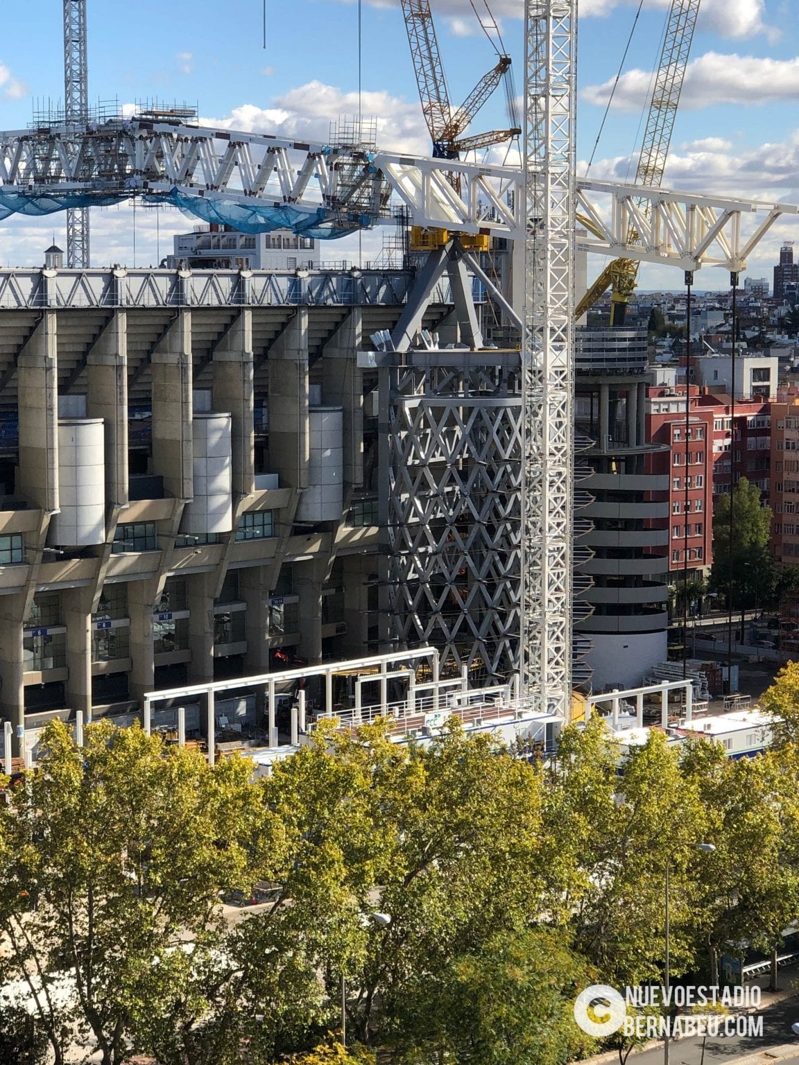Una vez retirados los andamiajes de la cercha norte e izados y acoplados los 3 floreros se trabaja en el montaje de pasarelas en la viga atirantada y el acople del atirantado de la cercha (ver fotos). A su vez, y como veremos en la actualización del viernes, se trabaja en la preparación del izado de los 3 floreros de la cercha sur. Para dicho cometido se han dispuesto tres cimbrados en posiciones laterales y centrales sobre el fondo sur del estadio en las que se descolgarán 3 plataformas elevadoras móviles de personal (PEMP) que servirán de apoyo al izado y acople de los floreros sur.
