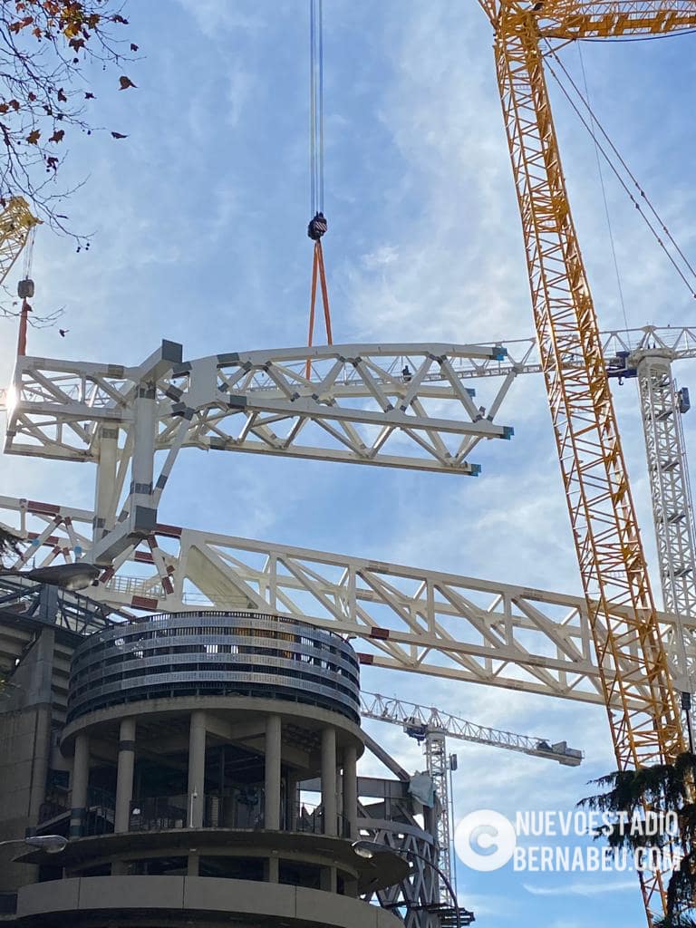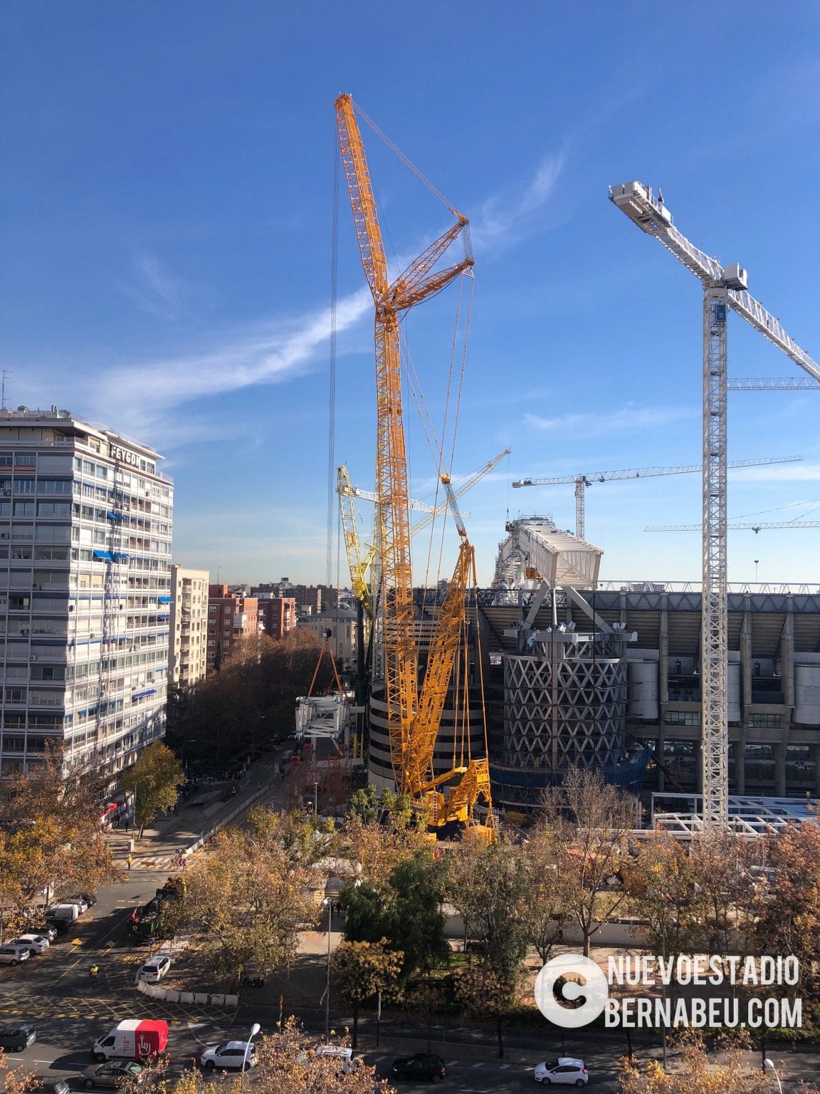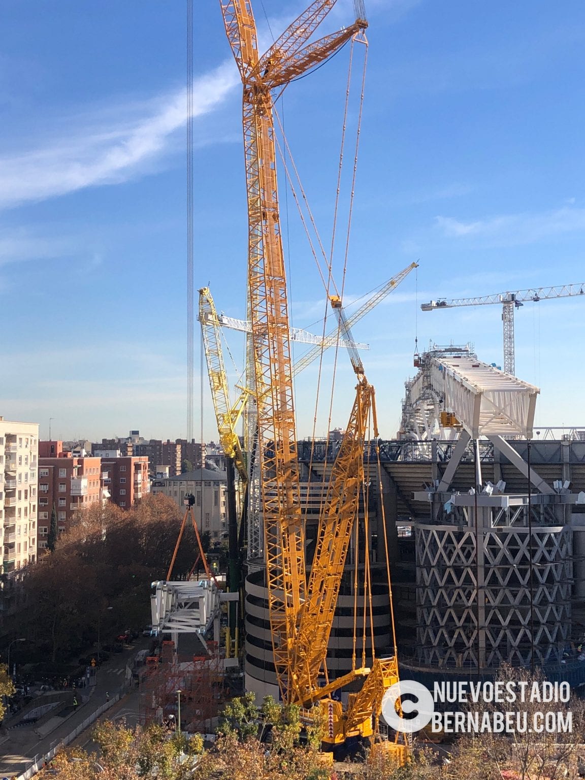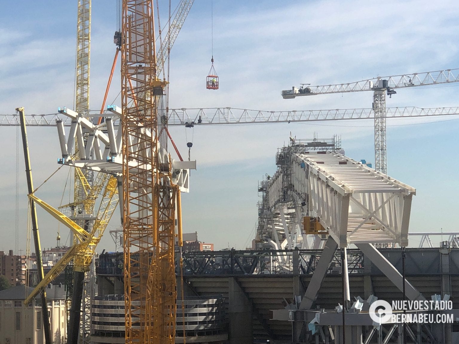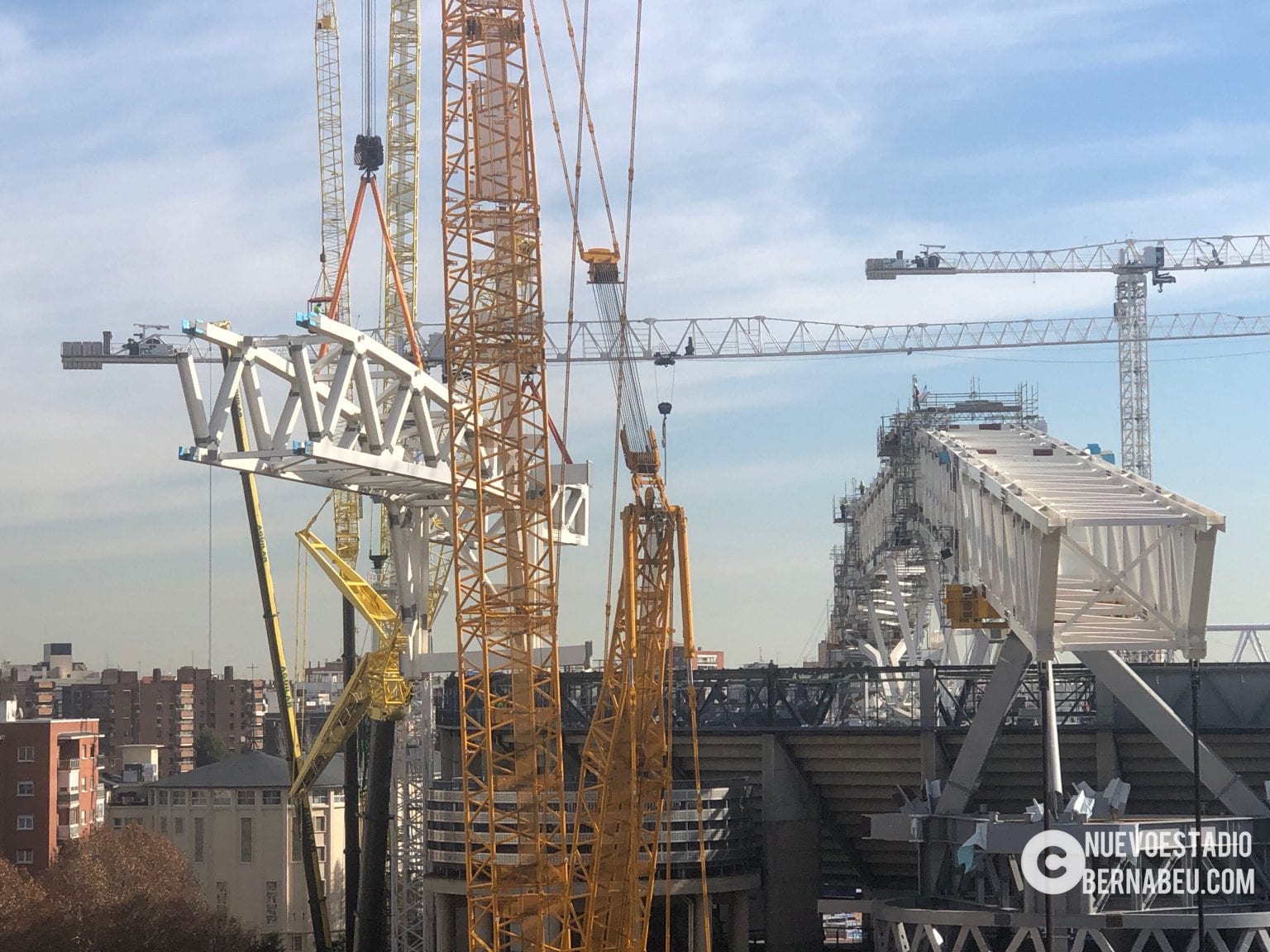 Con más de 400 toneladas de peso, sin duda el izado de esta pieza es uno de los momentos más espectaculares que hemos vivido desde el comienzo de la remodelación del nuevo Bernabéu. El izado se ha llevado a cabo mediante la actuación en paralelo de la grua en celosía LR1800 y una grua de 500 toneladas de carga máxima LTM 1500-8.1.