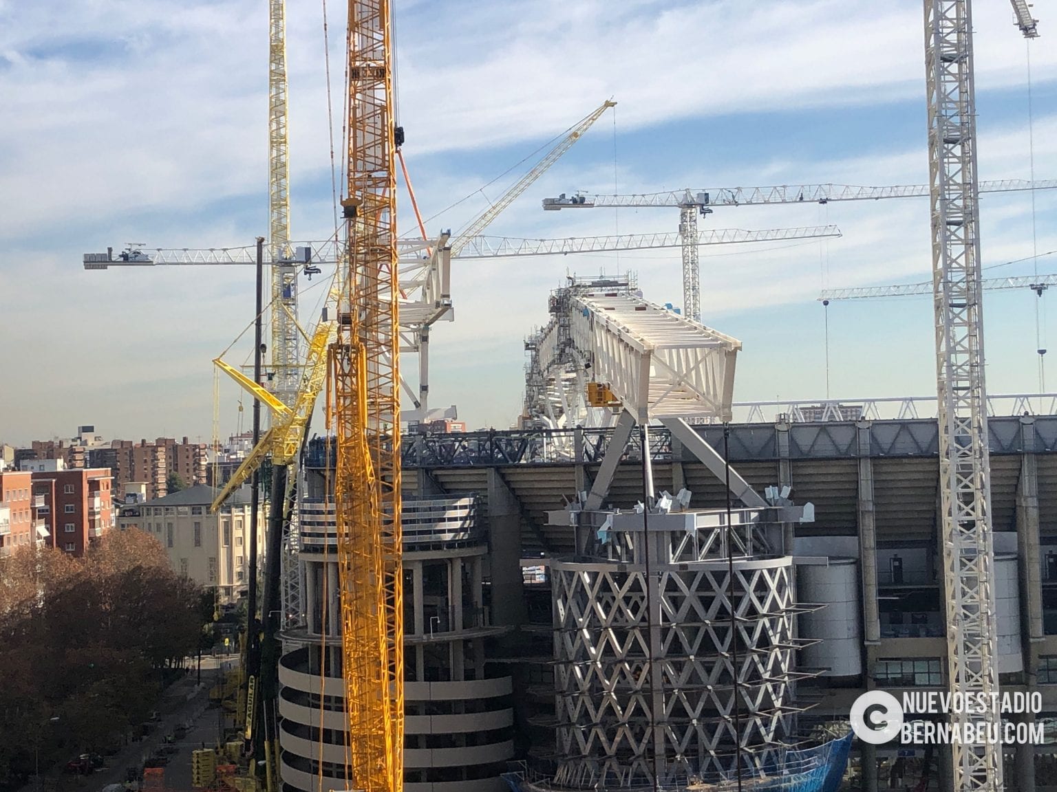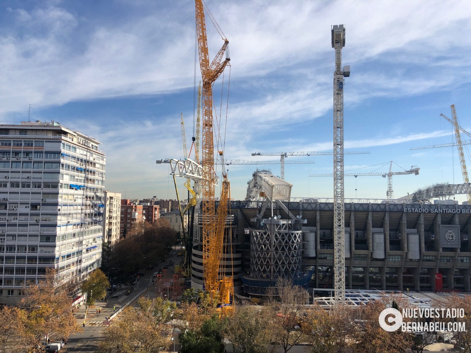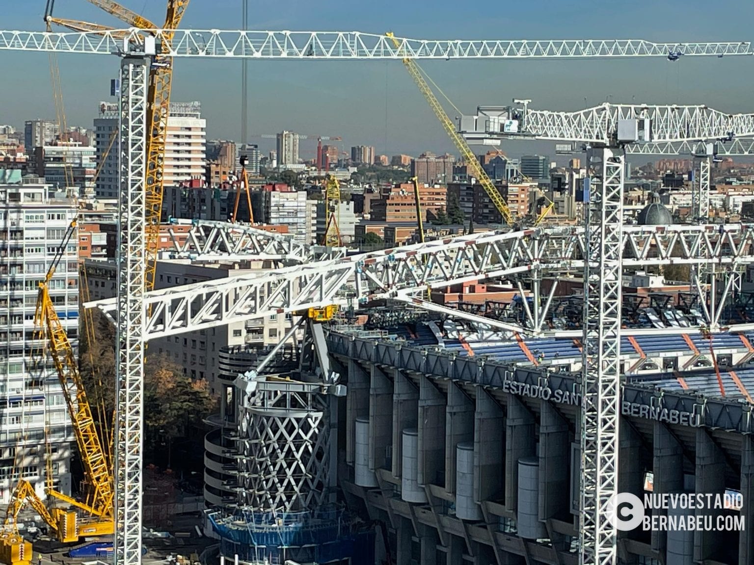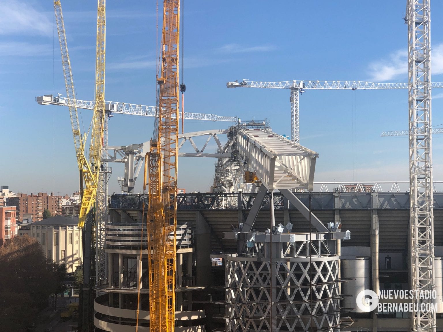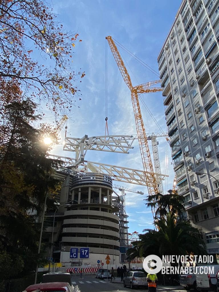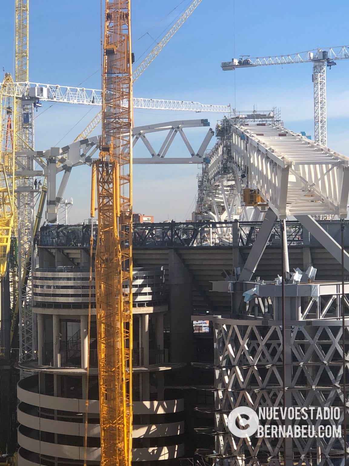 Con más de 400 toneladas de peso, sin duda el izado de esta pieza es uno de los momentos más espectaculares que hemos vivido desde el comienzo de la remodelación del nuevo Bernabéu. El izado se ha llevado a cabo mediante la actuación en paralelo de la grua en celosía LR1800 y una grua de 500 toneladas de carga máxima LTM 1500-8.1.