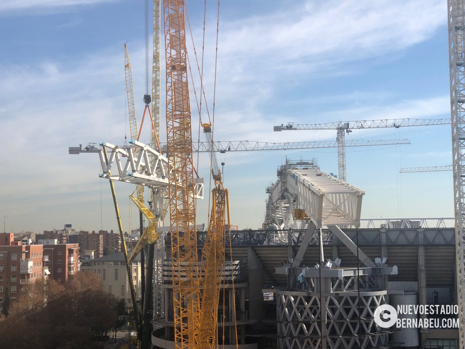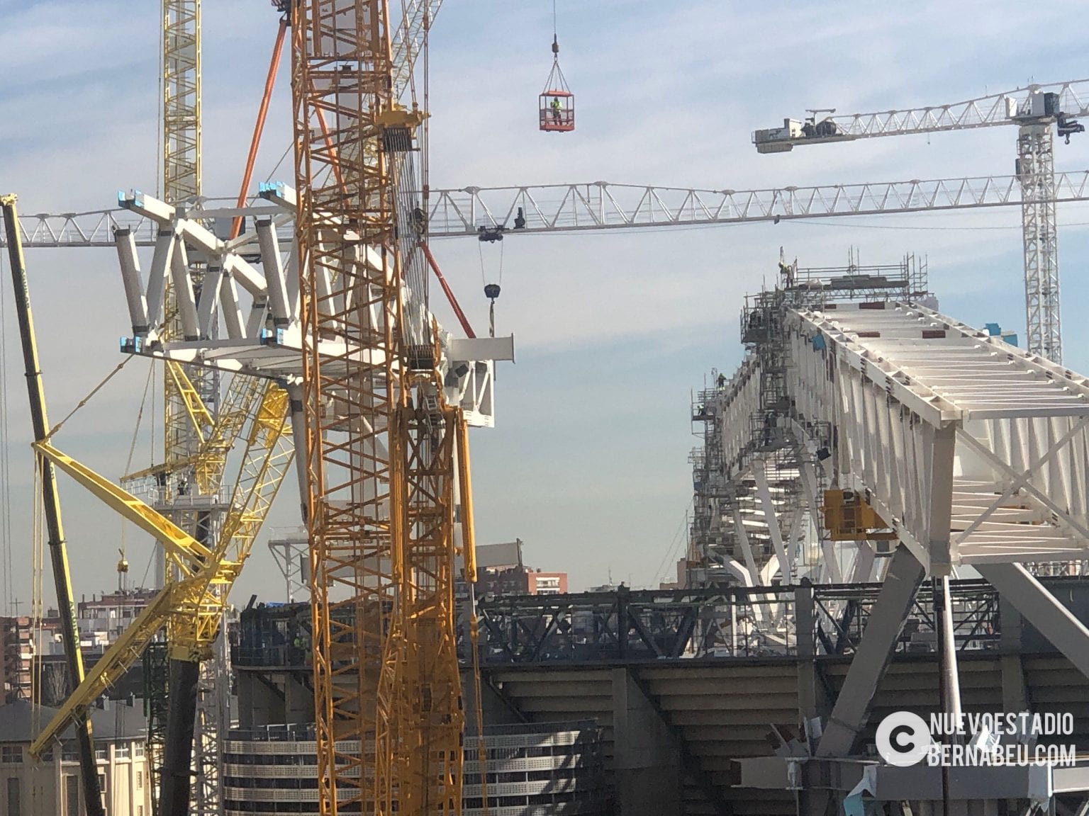 Hoy era uno de los días señalados en el cronograma de las obras en color rojo. Durante las últimas semanas se han estado ensamblando a pie de obra las mastodónticas extensiones de arranque de la nueva cubierta y hoy estaba programado el izado de la primera de ellas: la C.