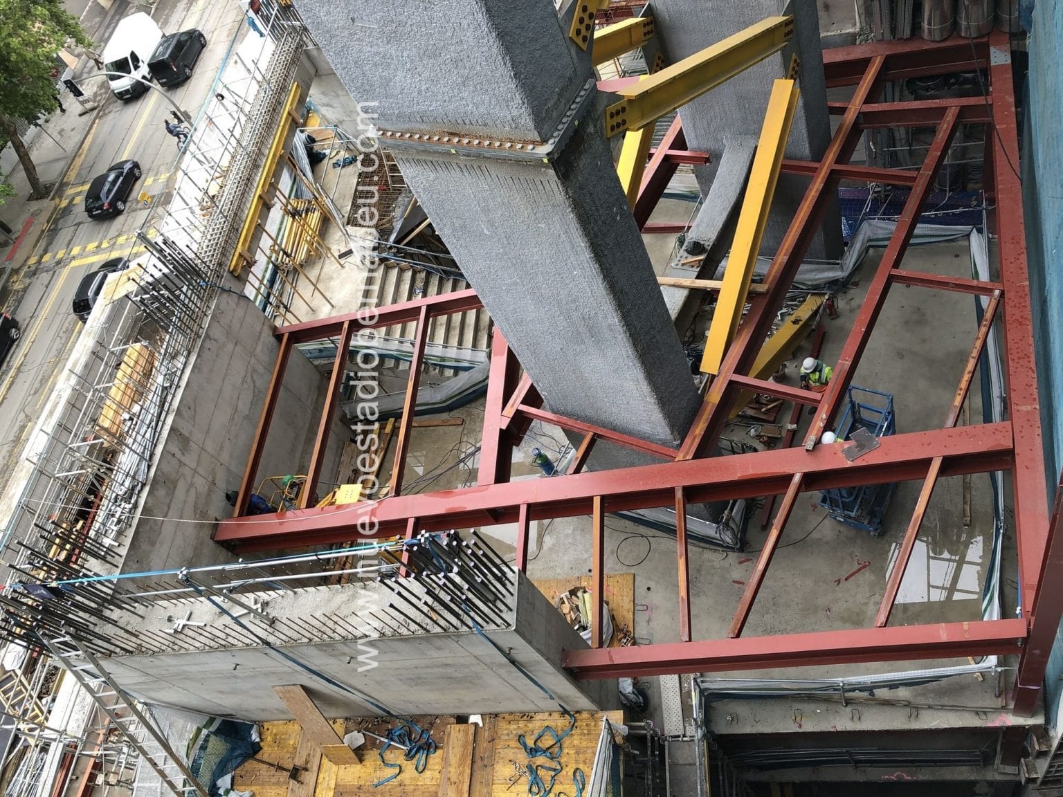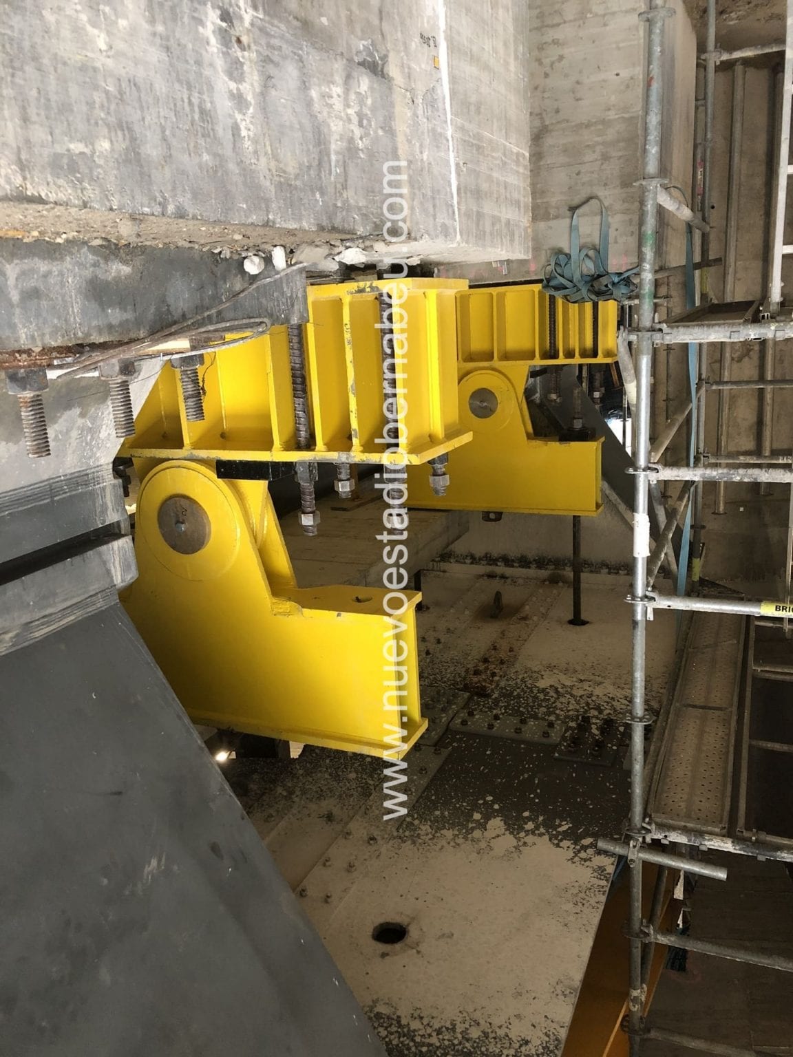 La demolición y nueva construcción de los torreones del lateral este es otra de las actuaciones vitales en el desarrollo del proyecto. Retrasada en el tiempo, no se ha podido acelerar hasta la traslación de la antigua viga este que pende sobre los contrapesos de las cerchas principales a la espera de poder ser retirada cuando la nivelación del nuevo parking alcance la cota cero.