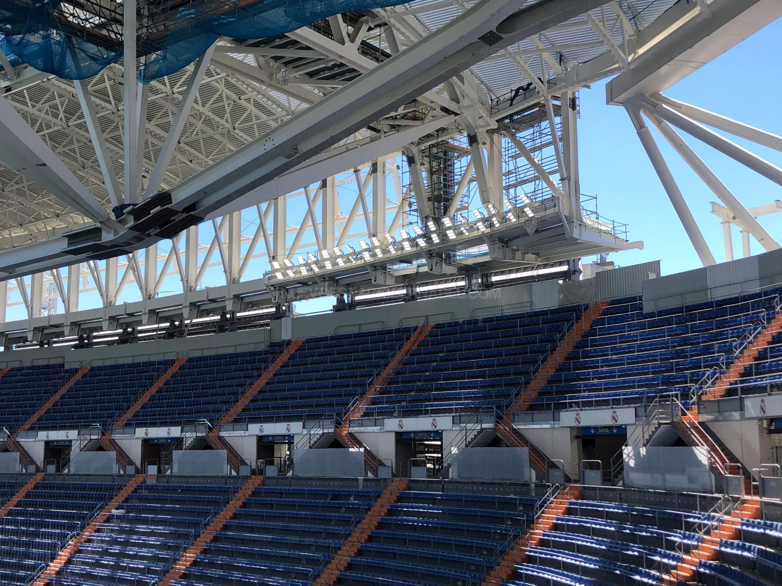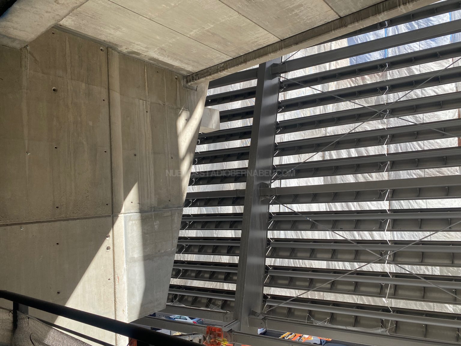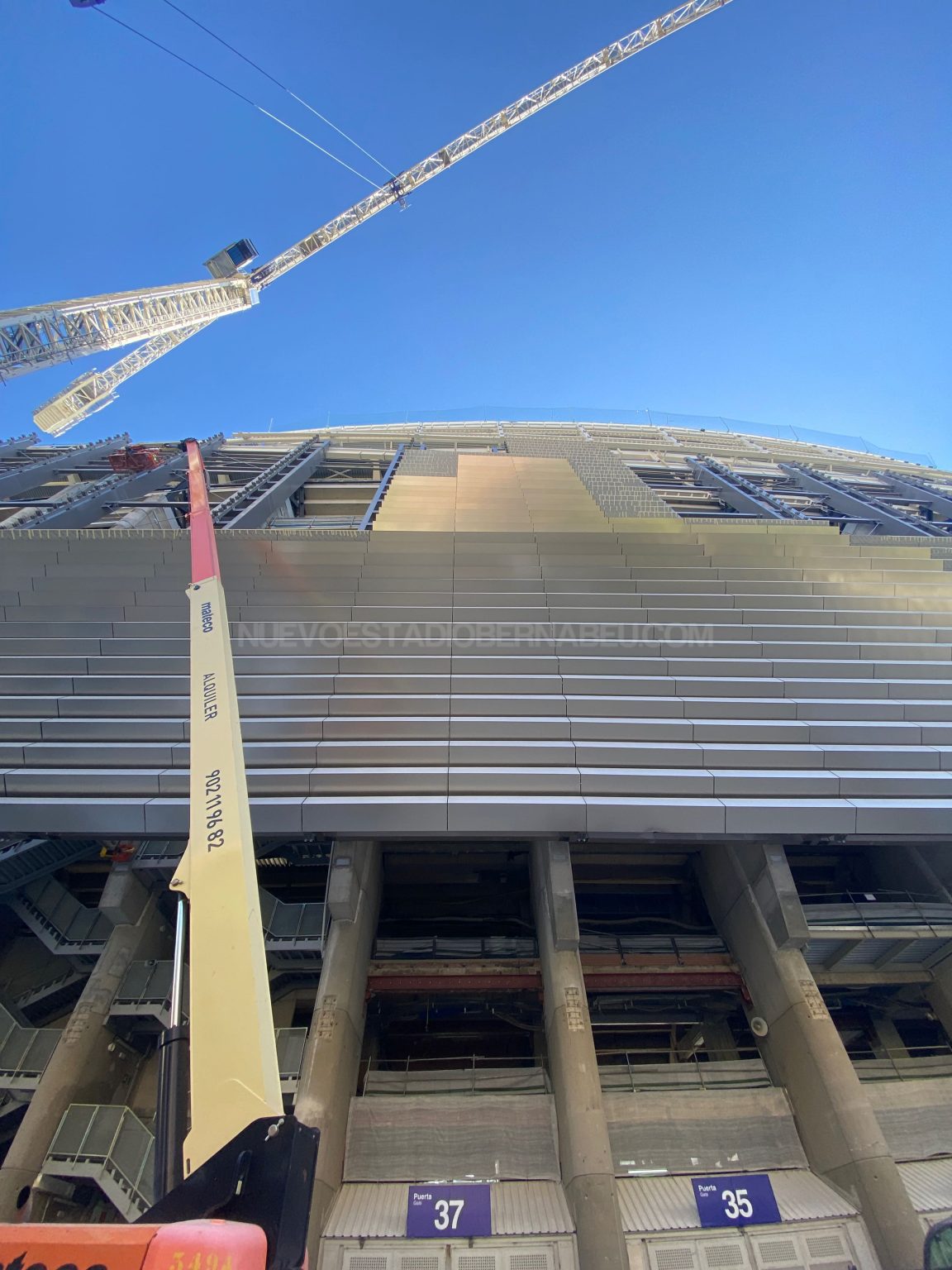 De aquí al parón por el mundial se continuará con la instalación de lamas de fachada y se ha empezado a ejecutar la cimentación del zócalo de fachada el cual a nivel estético se rematará en lamas por todo el estadio y con muro cortina de vidrio en restaurantes norte y sur, puerta 0, Palco de Honor, superstore y megastore.