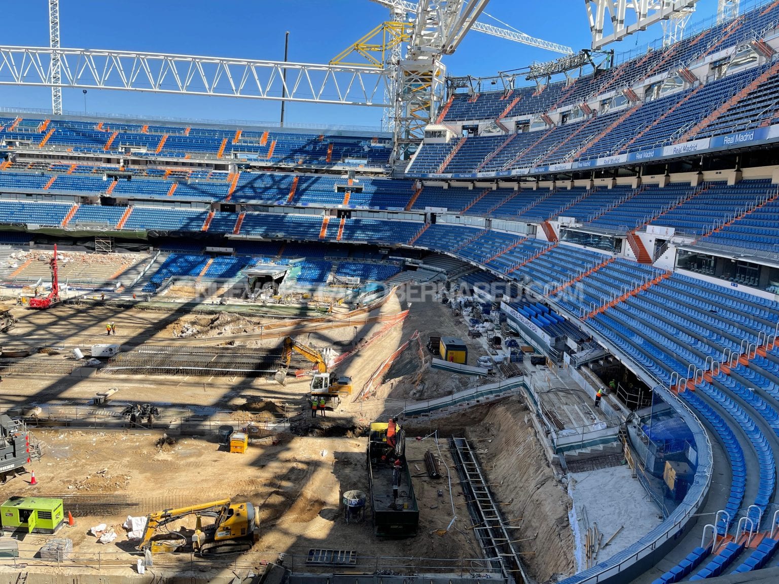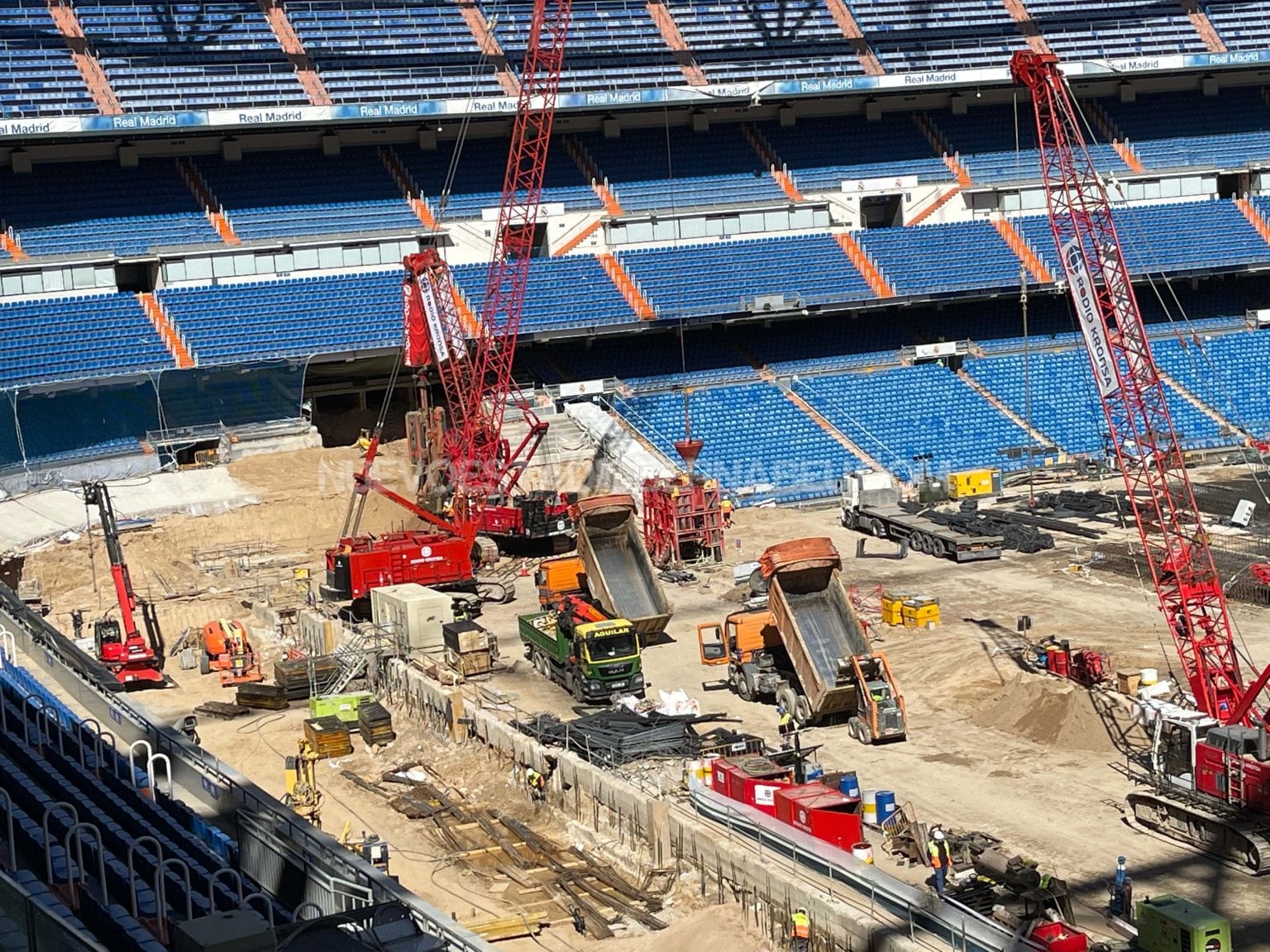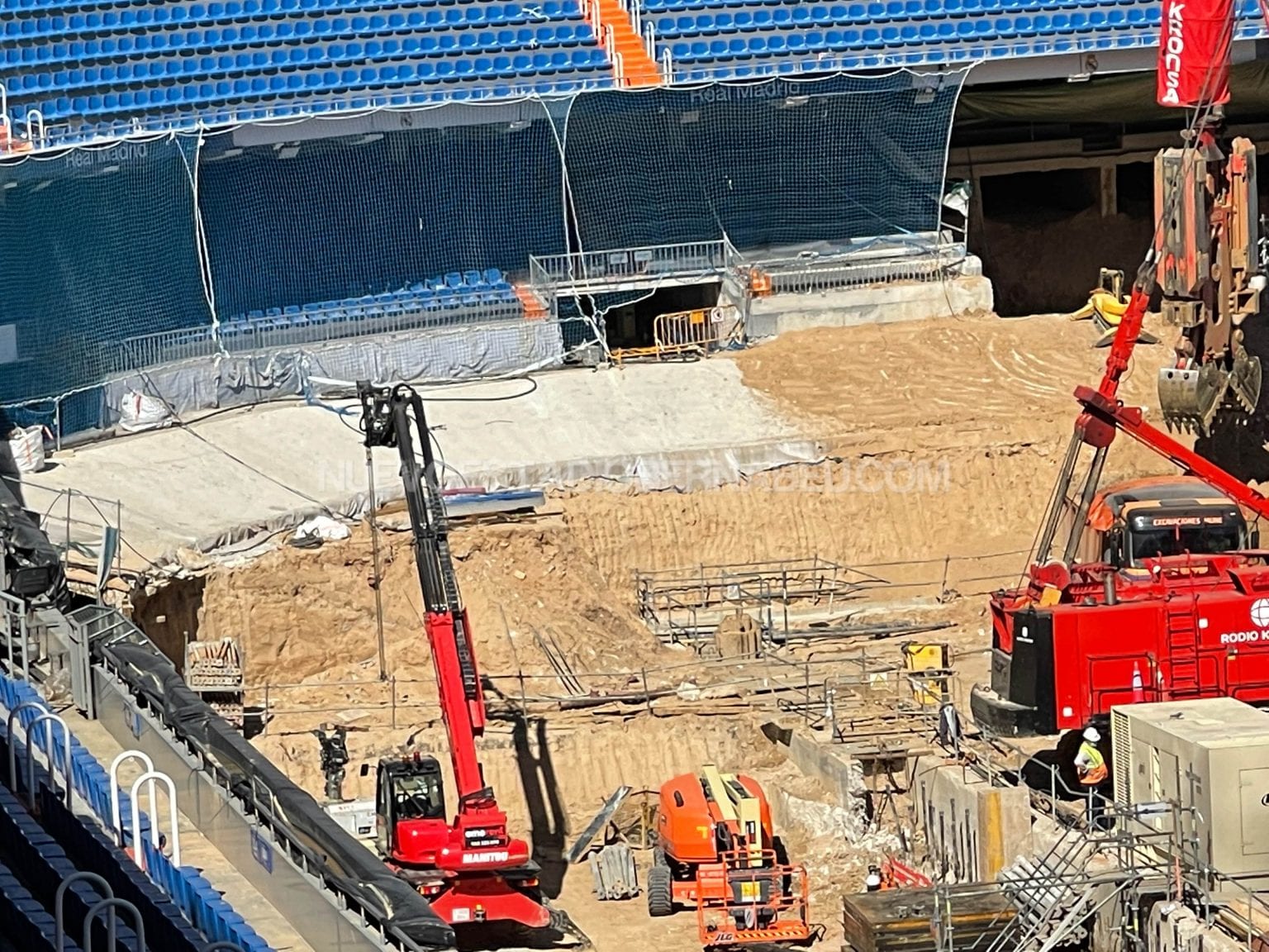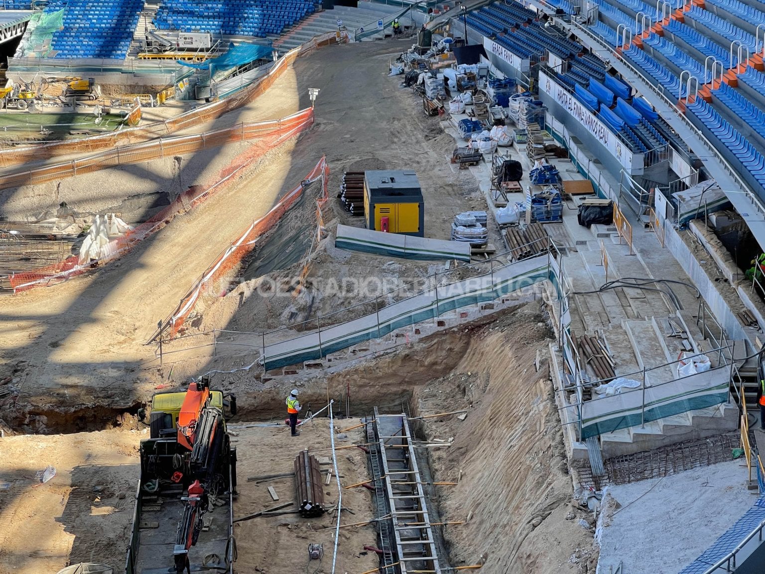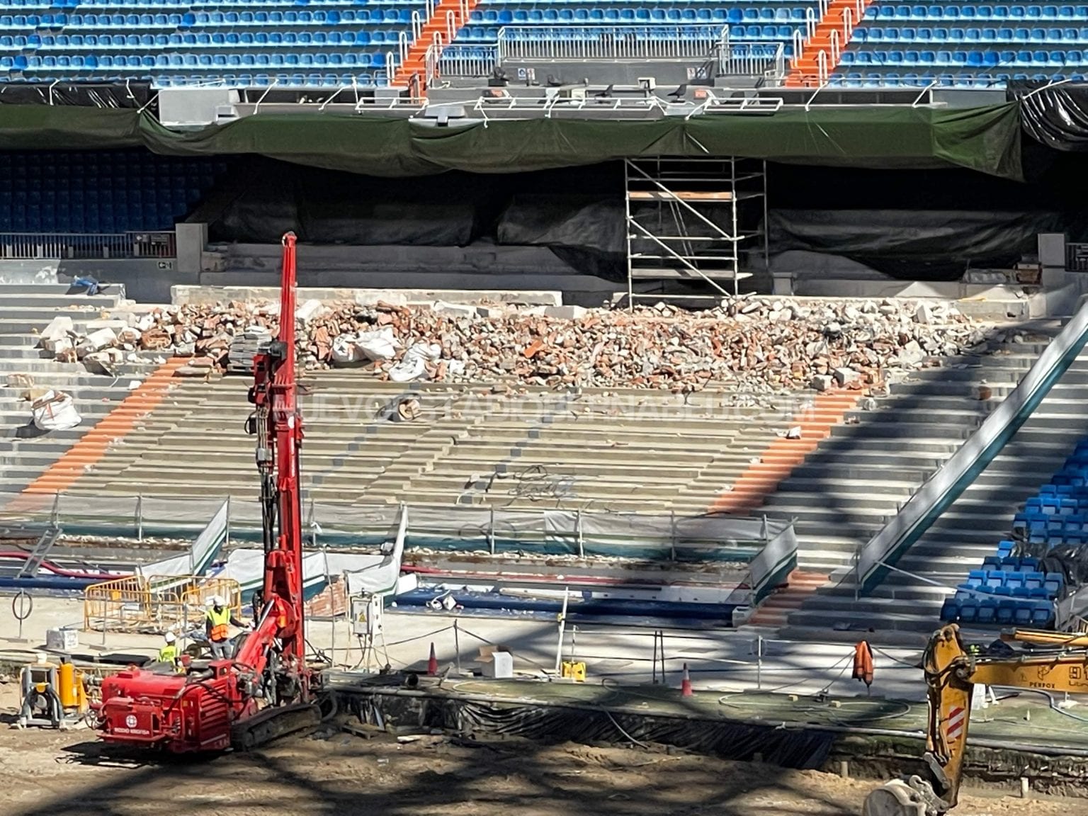 En el terreno de juego podemos decir que ocurre de todo. Pantalladoras, micropilotajes en tribuna y galería sur, ferrallas, ejecución de murete guía en zona sur, demoliciones de grada baja y escaleras y soleras, pantallas de protección…todo para tener el césped más verde del mundo.