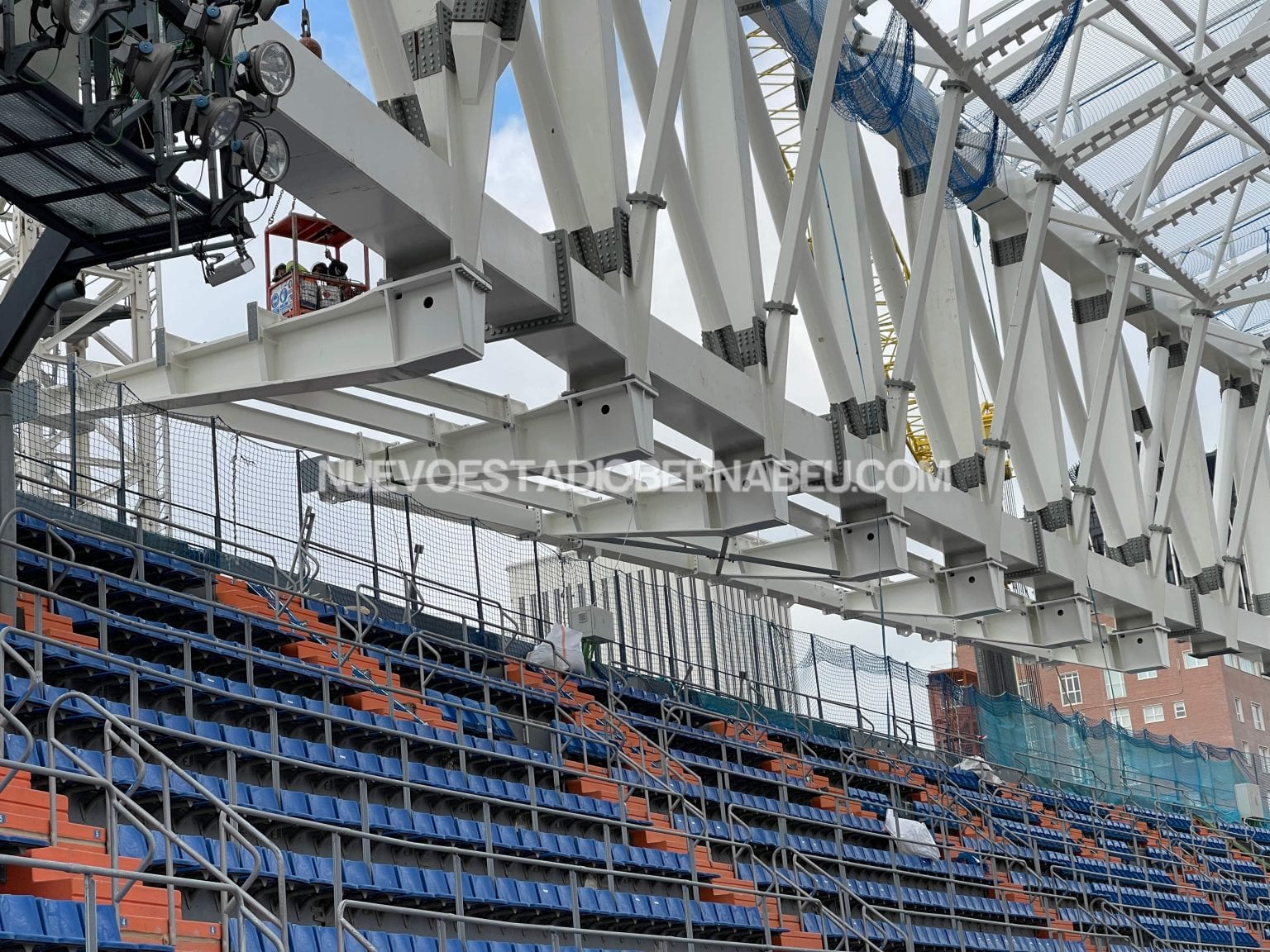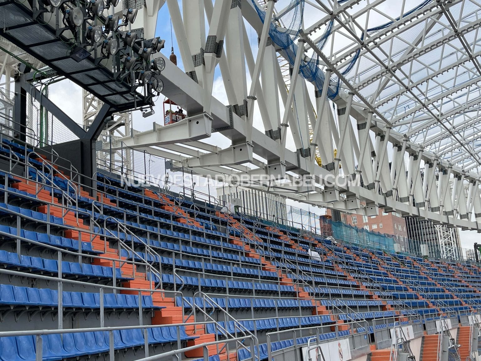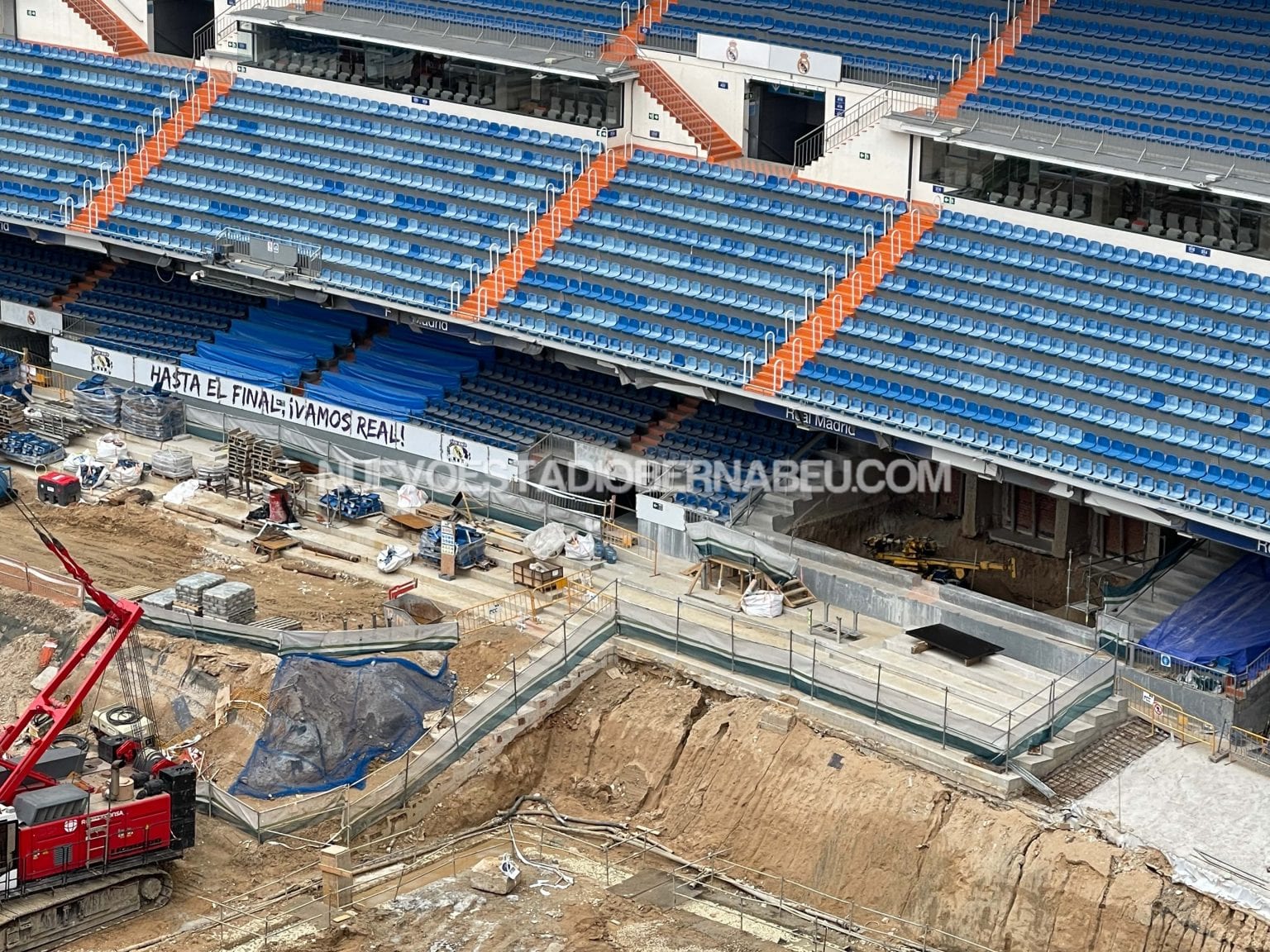 En el bowl siguen los trabajos de demolición de grada lateral este, túnel de vestuarios, VIP-Box y los trabajos de adecuación del futuro terreno de juego del que hablaremos próximamente. Además se trabaja en el refuerzo del túnel de ADIF que se está ejecutando desde Chamartín en horario nocturno una vez que el servicio de trenes queda suspendido. Además de todo esto se está procediendo de manera regular al mantenimiento de las instalaciones actuales: asientos, barandillas, escaleras, pasillos. Es absolutamente increíble la capacidad de degradación que tiene una instalación como esta cuando entra en un estado de no actividad. En los asientos se está provando una técnica de reacondicionamiento temporal para «limpiar y reacondicionar» los asientos más maltratados por el sol y las condiciones adversas. Esta es una solución temporal para el caso de que el fútbol vuelva al estadio Santiago Bernabéu en el mes de septiembre, como todos queremos y el Club necesita a nivel financiero, puesto que los asientos serán renovados íntegramente en la fase final de la obra.
