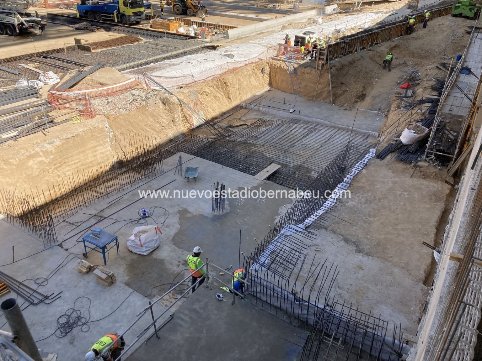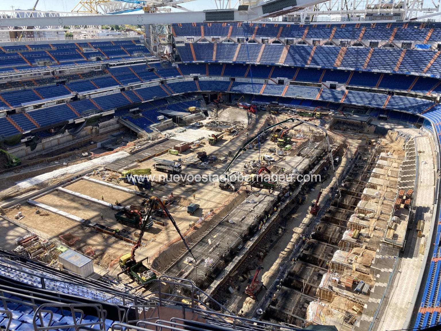 En el terreno de juego se centran los esfuerzos en el armado y hormigonado de martillos dirección este-oeste que de como resultado la futura colocación de la tapa de cierre del hipogeo del futuro césped retráctil. Esta tapa se ejecutará inicialmente en 22 divisiones distintas que permitirán los trabajos futuros de ejecución de todo el conglomerado del césped retráctil y del cual hablaremos en los próximos días. Como curiosidad, estamos hablando de mover 75.000 m3 de tierras hasta una profundidad de 35 metros. La habilitación del terreno de juego debe estar lista para mediados de agosto, por lo que se trabaja a toda máquina con el fin de lograr que las empresas de implantación de césped puedan trabajar con el objetivo cierto de llegar a la cuarta jornada de liga con un césped impoluto para la práctica del fútbol.