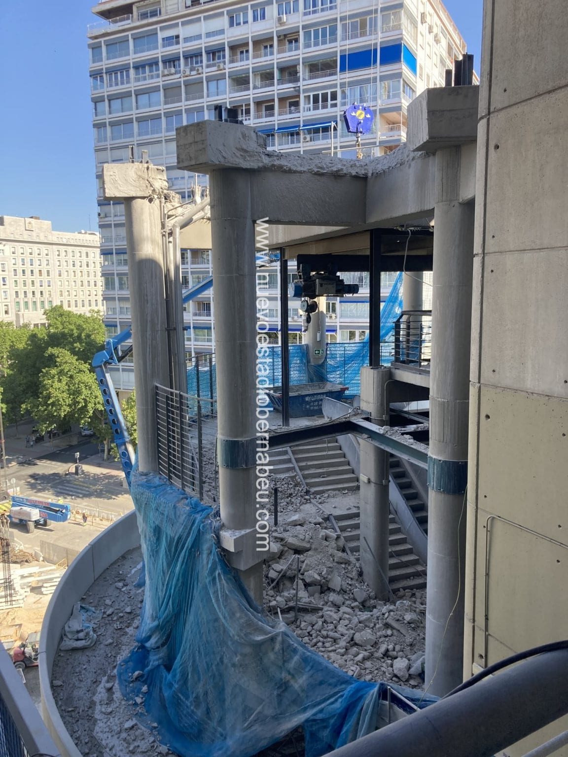 En la cubierta, se trabaja en el cerramiento de los huecos de colocación de perfiles que podéis ver en las fotos. Este no es el cierre de cubierta mediante la instalación de chapa que se prevé iniciar en septiembre y del que también hablaremos más adelante cuando la cercha 3 y 4 estén en su posición de izado y posterior arriostramiento. En relación con la cubierta se trabaja en la construcción de una nueva plataforma auxiliar en el lateral de Castellana la cual servirá de base para la construcción de la viga museo sobre la cual apoyarán la ampliación de los forjados de los niveles del lateral oeste. Esta plataforma se unirá al 50% de la actualmente construida y sobre la que se ha ensamblado la cercha número 3. Una vez izada la cercha número 3, se procederá al ripado de la cercha 4 sobre esa zona de la plataforma y la zona sobre la que actualmente está la 4 se demolerá.