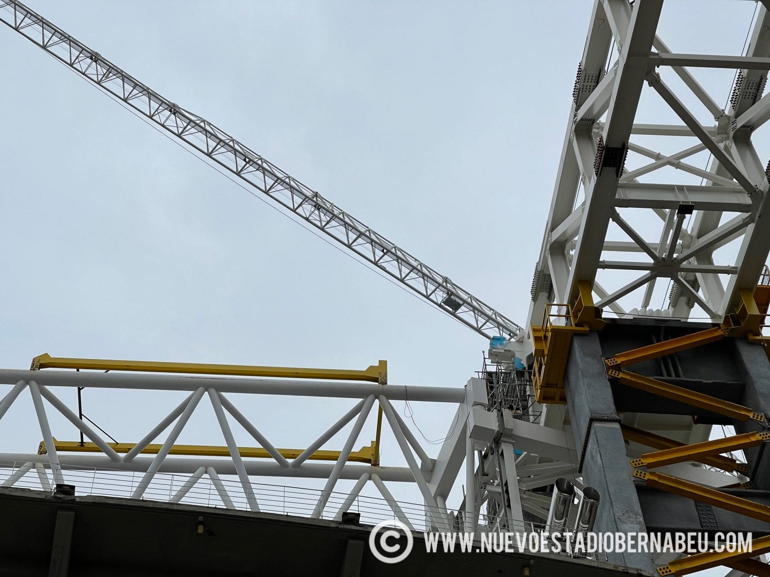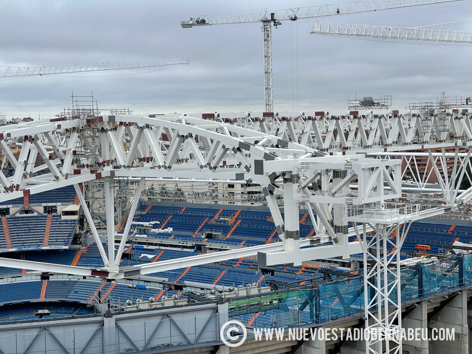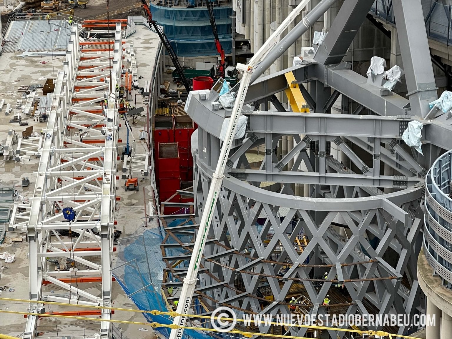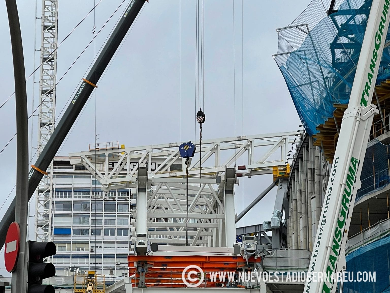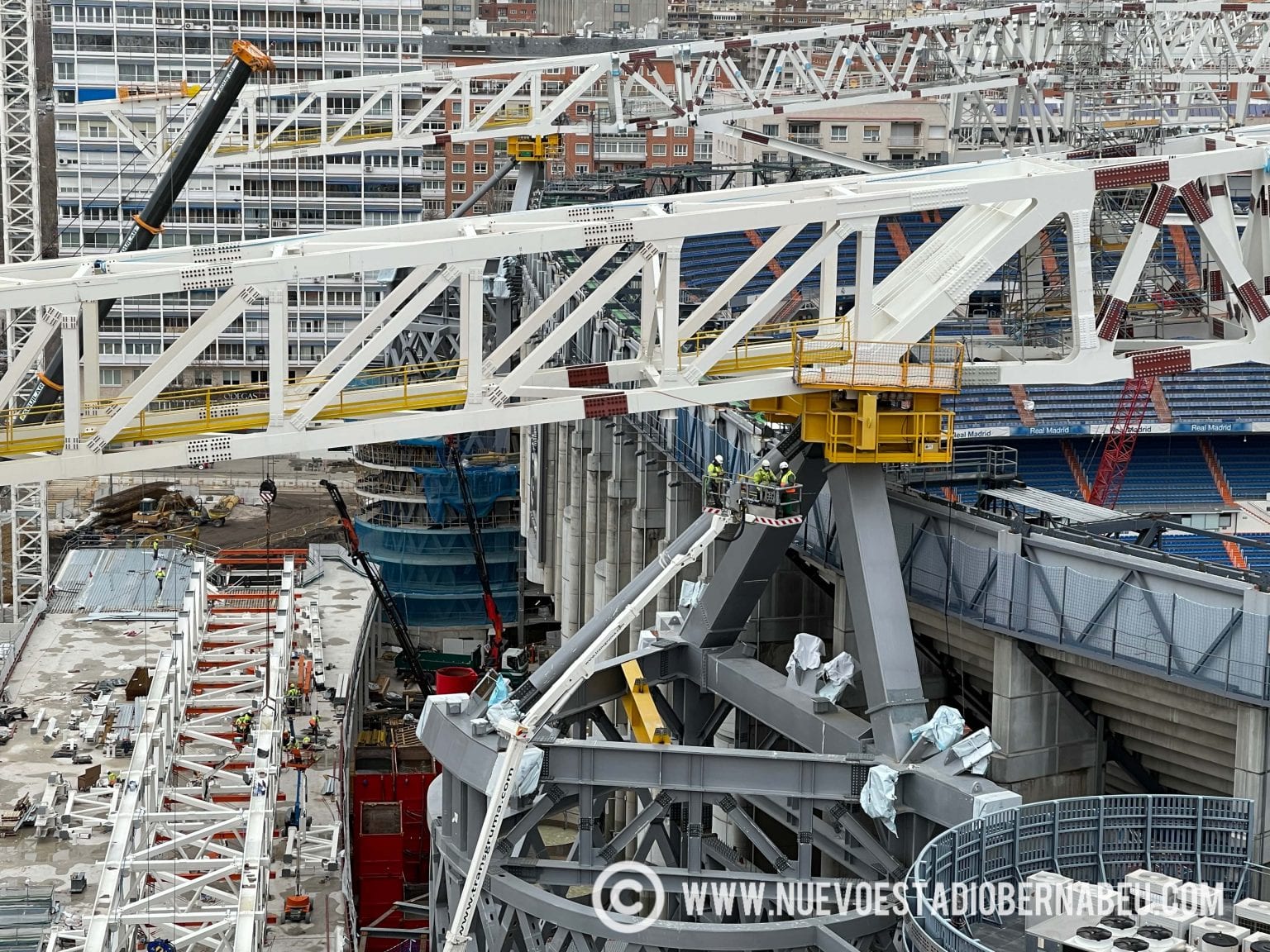 Ya durante esta semana se ha volcado mucha actividad al fondo sur, pero esta próxima semana la actividad principal caerá a esa parte exterior del estadio. La cercha de fondo sur va a empezar a coger forma. Aunque la intención era izar los módulos 6 y 7, el viento no lo ha permitido. A partir del lunes se volverá a intentar el izado del módulo 6 y 7 mientras que el módulo 5 entró en obra el paso martes y se está ensamblando.