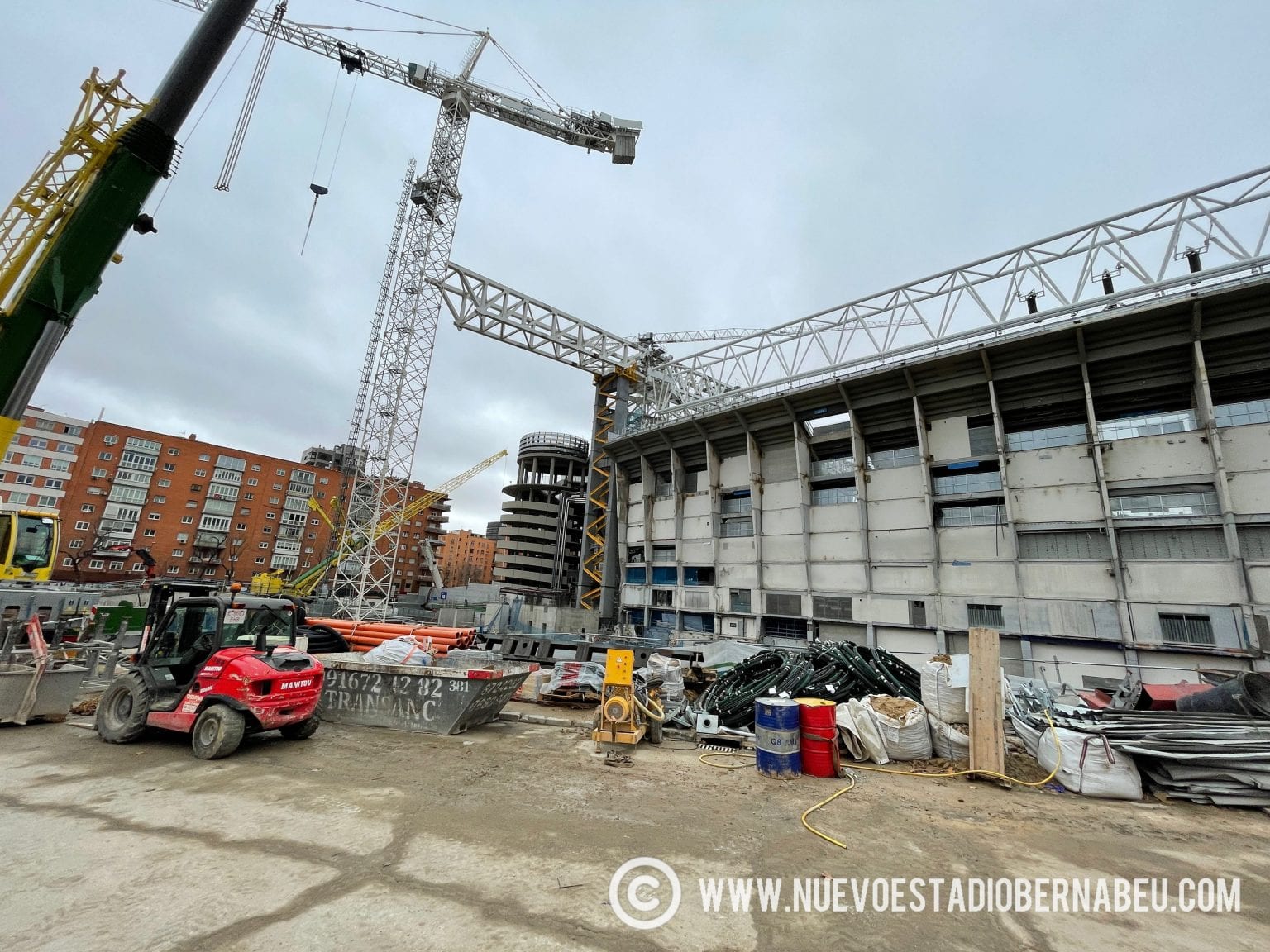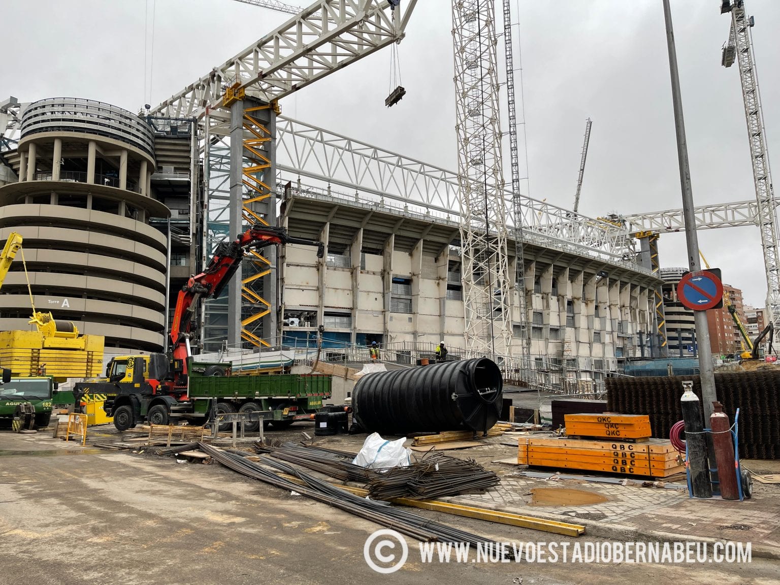En los exteriores hay orden. La obra ha ganado en espacio desde la marcha de las grúas en celosía LR que durante tantos meses han sido vitales para el izado y anclaje de las cerchas principales. Además de la marcha de las LR también se han marchado hasta 3 grúas de 500tn y con esto el acceso a obra es “más limpio”. El COVID ha acabado con cualquier posibilidad de volver a disputar partidos con público en el Bernabéu, pero hoy en día si pudieran disputarse, el acceso del público estaría bastante normalizado a excepción de los accesos del lateral este, que se verían limitados por la grandísima actuación que se está llevando a cabo en el nuevo parking y en los inicios del nuevo edificio este. Los cimbrados de ambos fondos más la plataforma auxiliar de Castellana permitirían el acceso a la práctica totalidad de las puertas del estadio. Divagaciones sin trascendencia porque lamentablemente vamos camino de un año sin público en el Bernabéu y no parece que podamos volver a medio plazo.